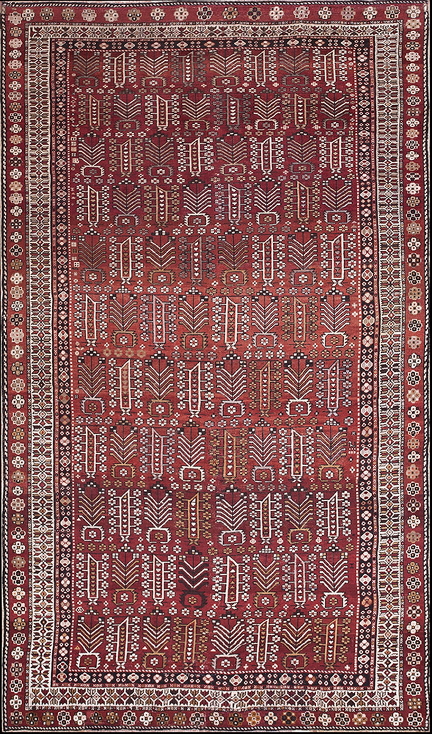 The Shirvan style is renowned for its fine knotting and sophisticated use of natural dyes, which have mellowed beautifully over the last century. The deep, saturated reds and browns are offset by the stark ivory border, providing a clear frame for the intricate internal geometry. This piece is a superb example of early 20th-century antique rugs and their lasting cultural importance.