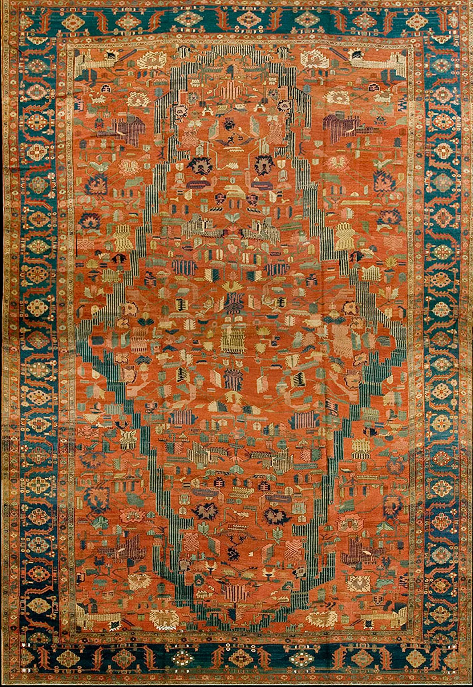 Framed by structured borders that anchor the composition and reinforce visual continuity, the design benefits from the carpet’s oversized format, making it especially suited to living rooms, great rooms, open seating areas, and formal spaces where scale matters. Woven in high-quality wool, antique area rugs of this caliber offer tactile warmth, enduring resilience and a surface that matures beautifully with age and use.