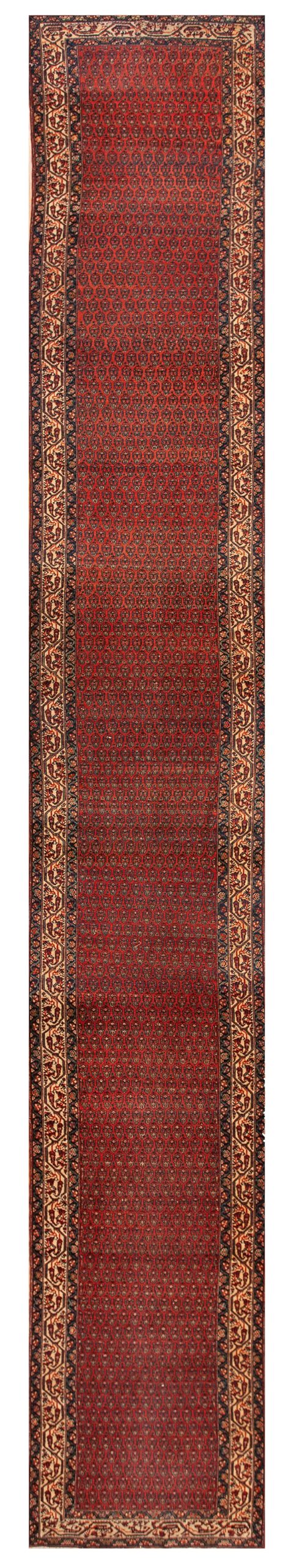 The field is densely populated with the iconic, repeating Mir-i-Boteh motif, rendered in a precise, all-over geometric arrangement. This micro-patterning creates a visual texture that is both complex and deeply satisfying, maintaining visual interest across the entire length of the textile.