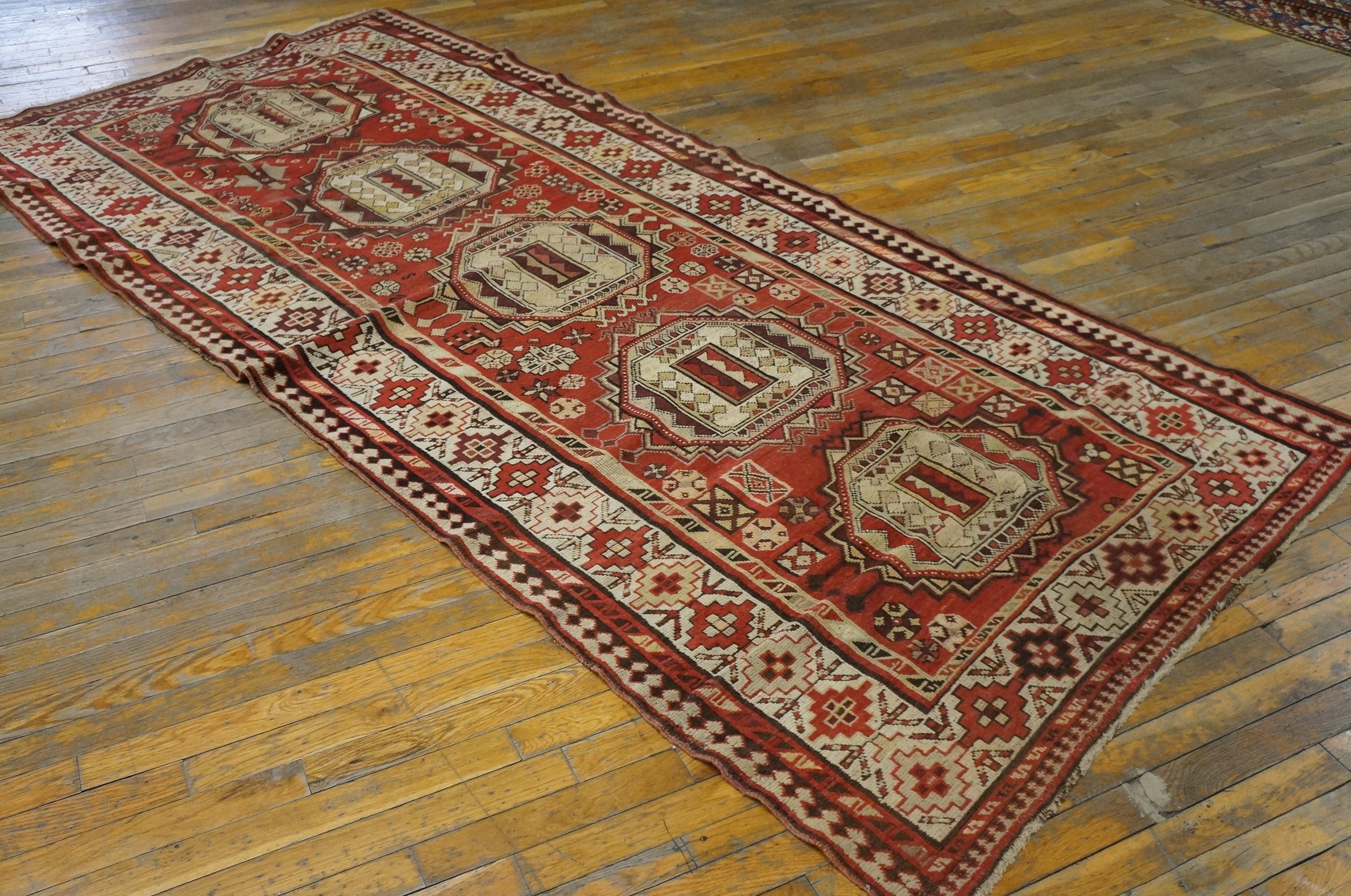 The field is dominated by a rich, madder red ground, upon which a sequence of highly stylized octagonal medallions are arranged. These central motifs are framed by intricate stepped outlines and filled with complex tribal iconography. The arrangement creates a striking, vertically oriented allover rugs pattern, a sophisticated structure often employed in Caucasian weaving traditions.