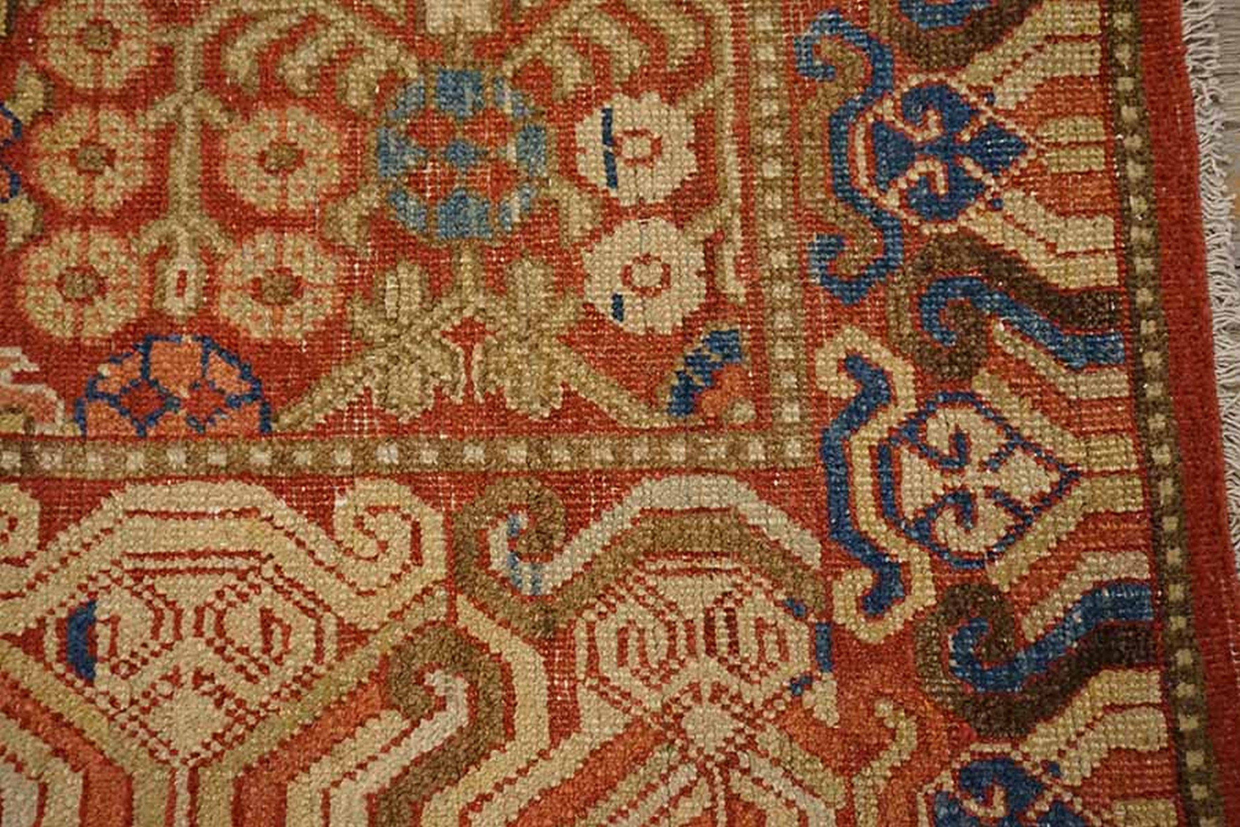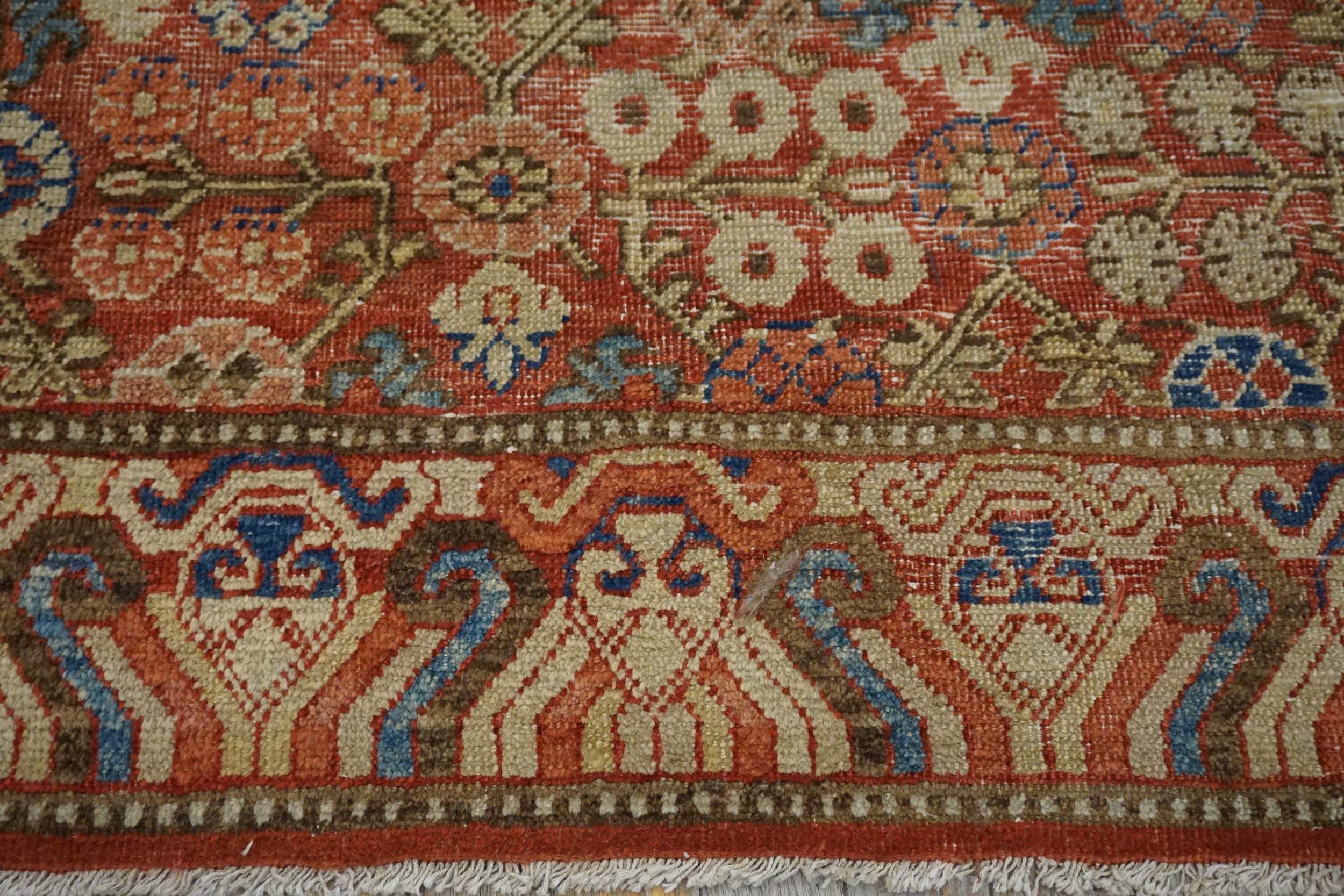 Woven entirely in wool, the pile exhibits the characteristic patina of age, softening the original vibrancy of the dyes. The dominant ground hue is a rich, earthy persimmon, beautifully complemented by secondary accents of pale indigo, ivory, and ochre—a masterful use of the persimmon color palette that speaks to the high quality of 19th-century dyestuffs.