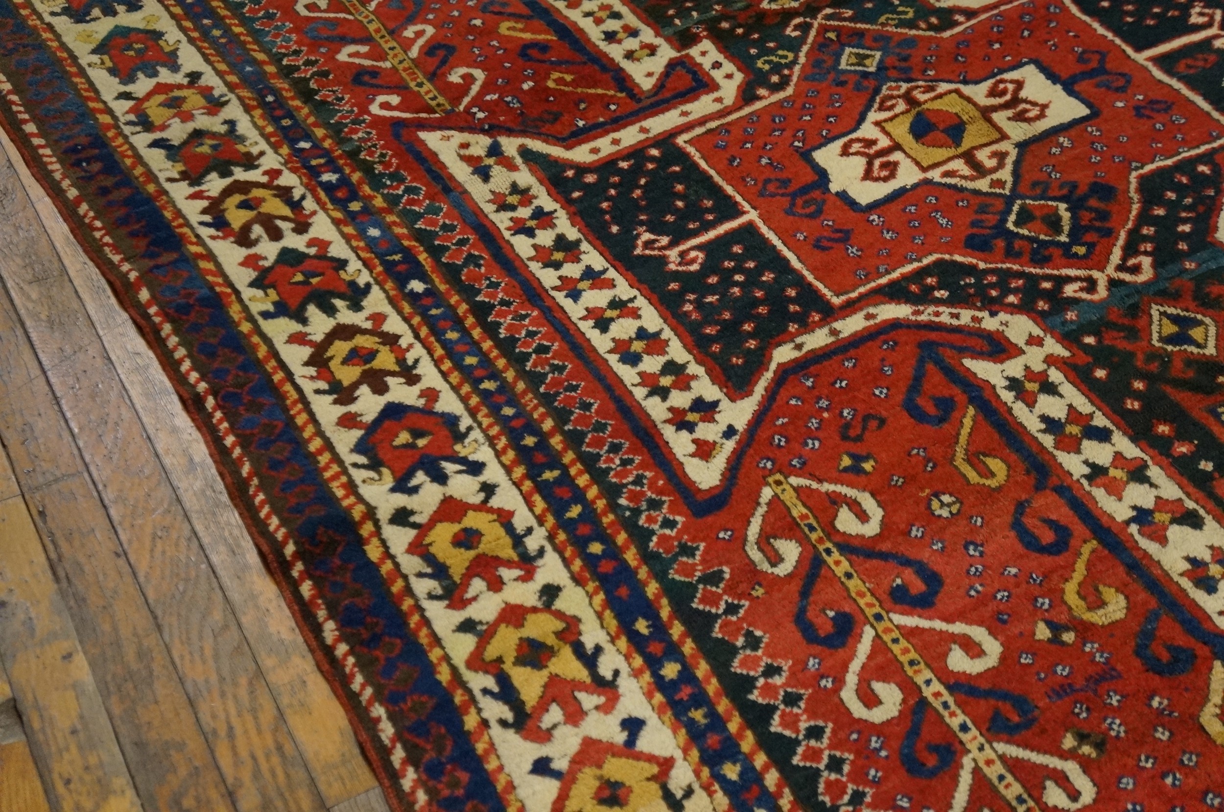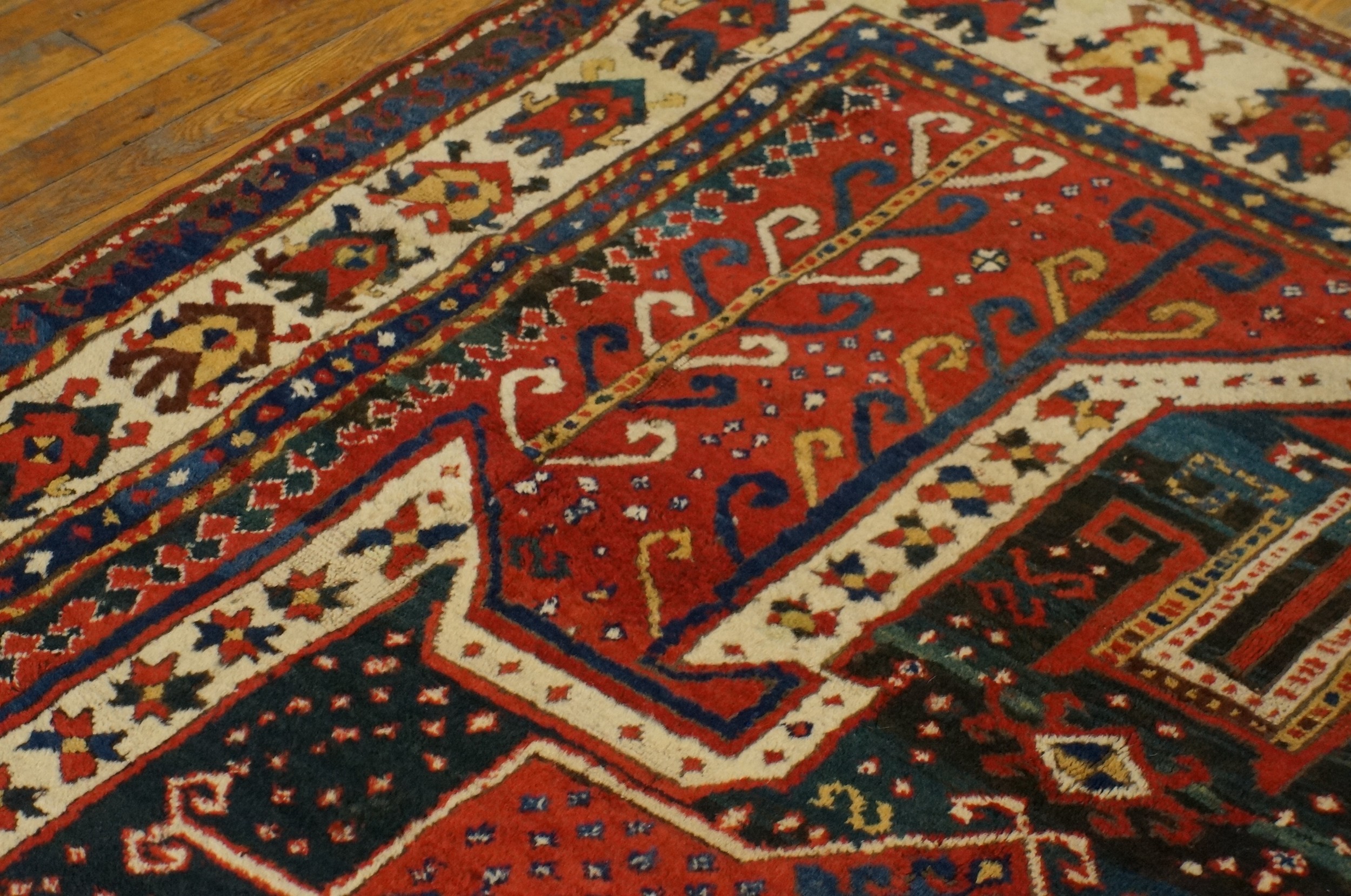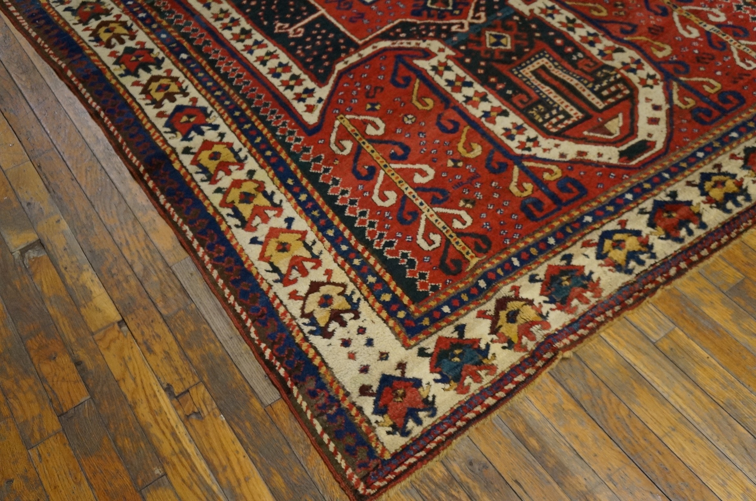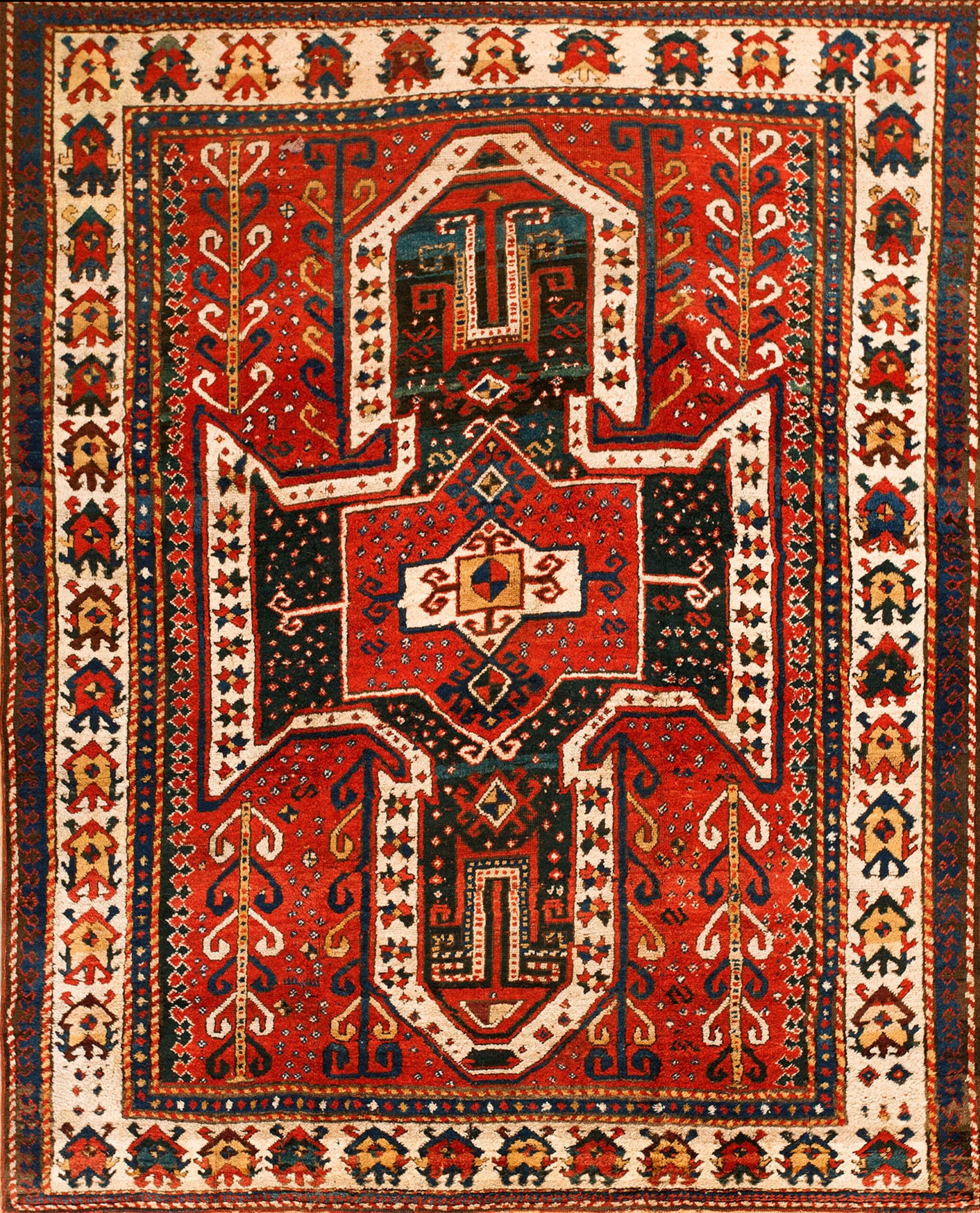 As a genuine artifact from the mid-19th century, this rug represents a significant piece of textile history. Its strong graphic presence, remarkable saturation, and excellent preservation make it highly desirable for collectors seeking authentic antique rugs with powerful, primitive artistry and enduring aesthetic appeal.