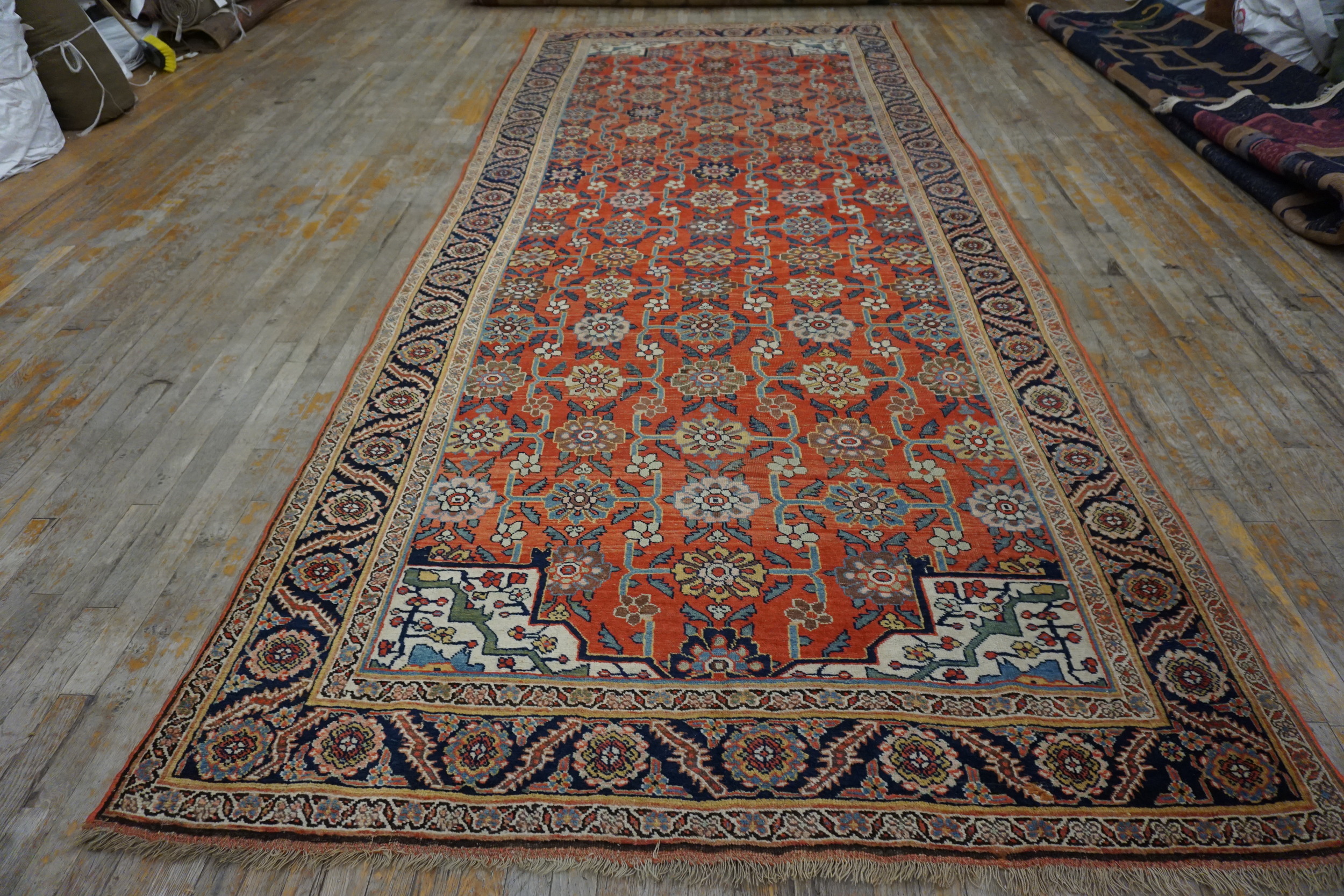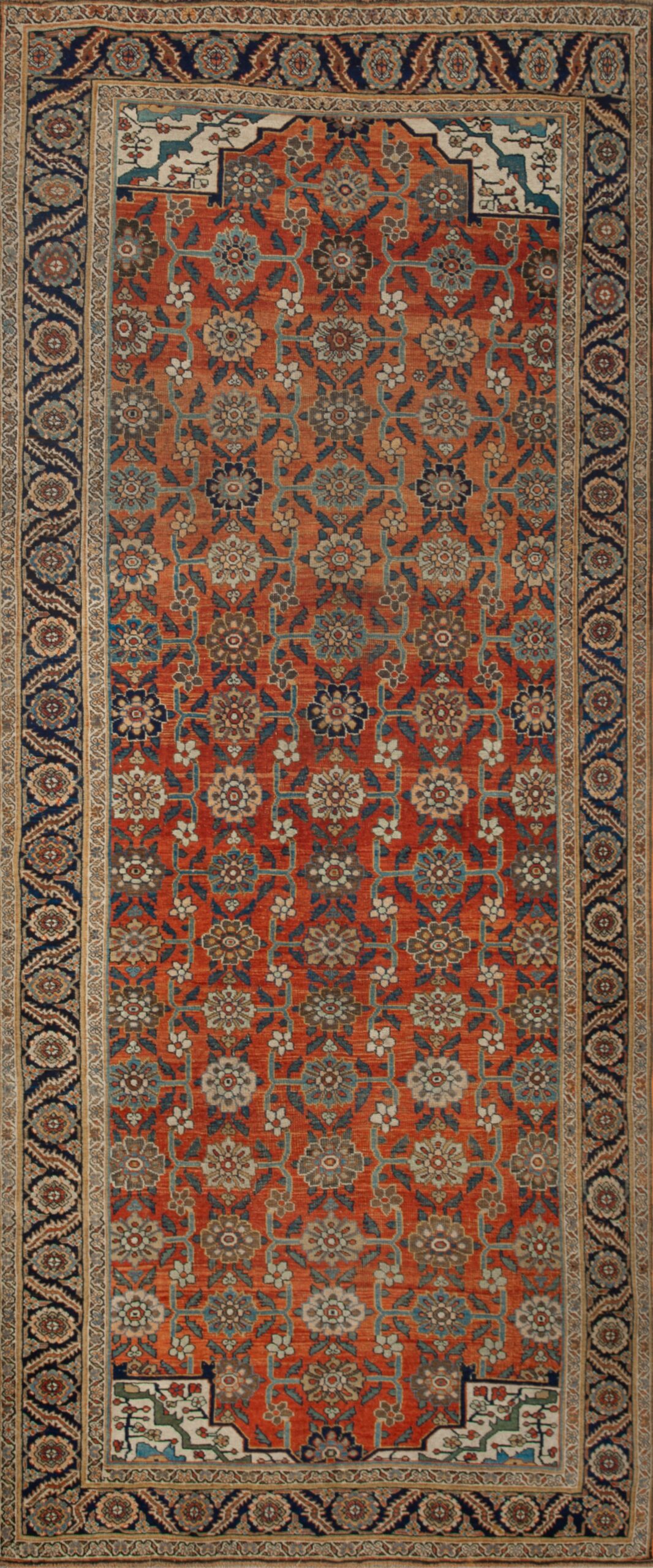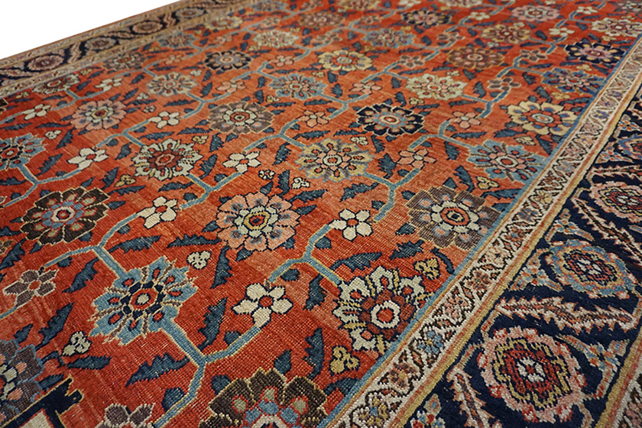 Despite its age, the wool retains remarkable luster and pile height, a testament to the quality of the original materials and the famous “iron rug” structure. The dense composition features repeating geometricized floral rugs across the field and borders, executed with the bold, graphic precision typical of this style.