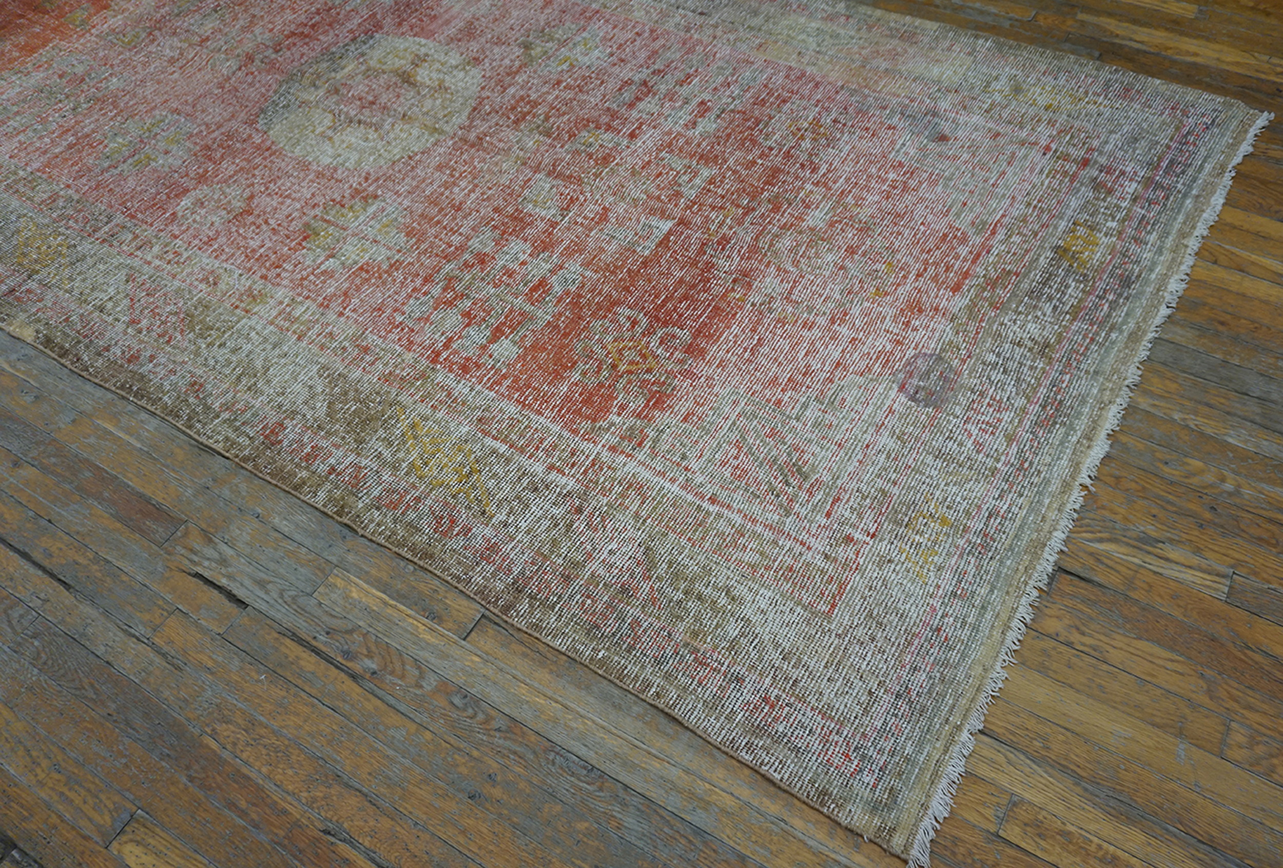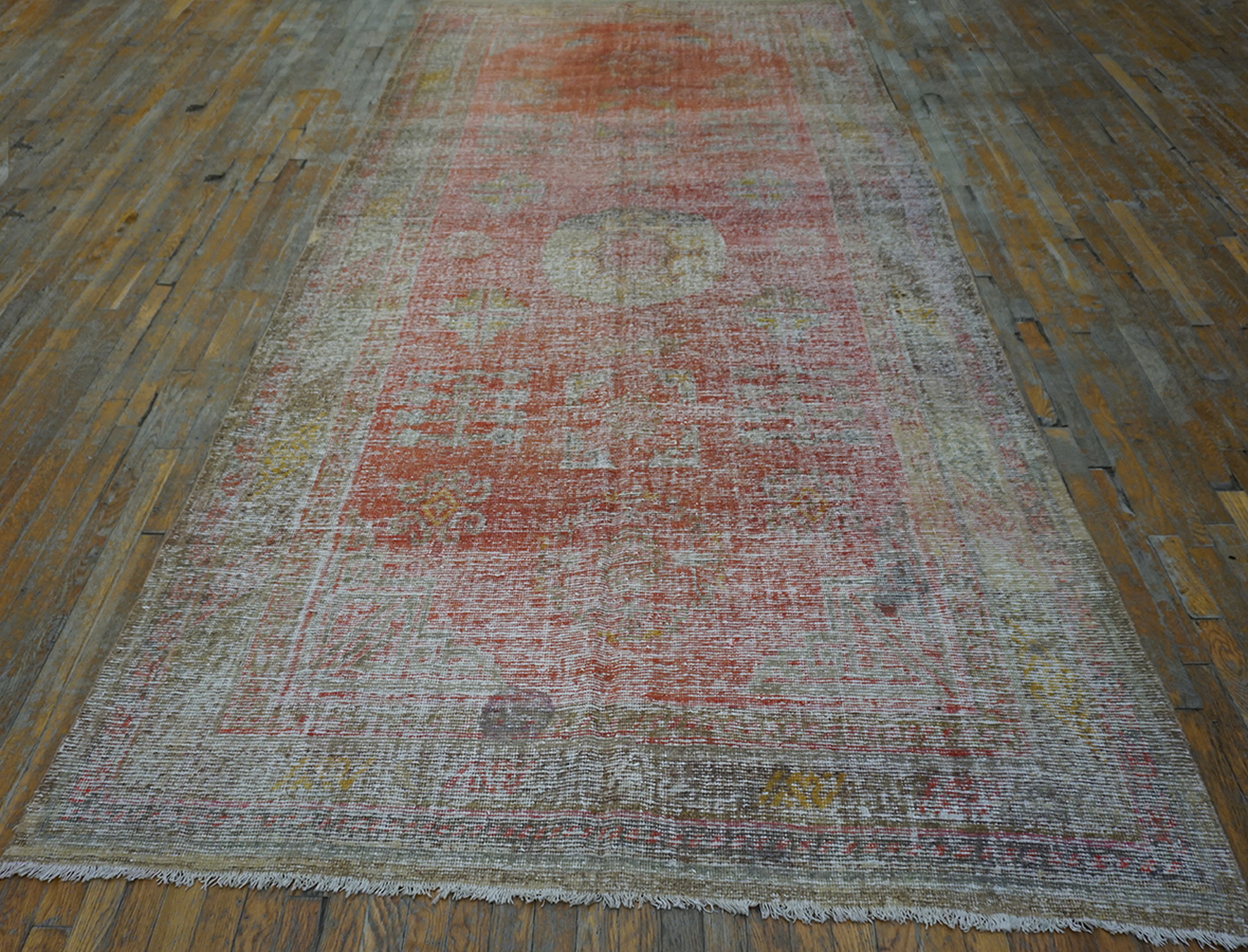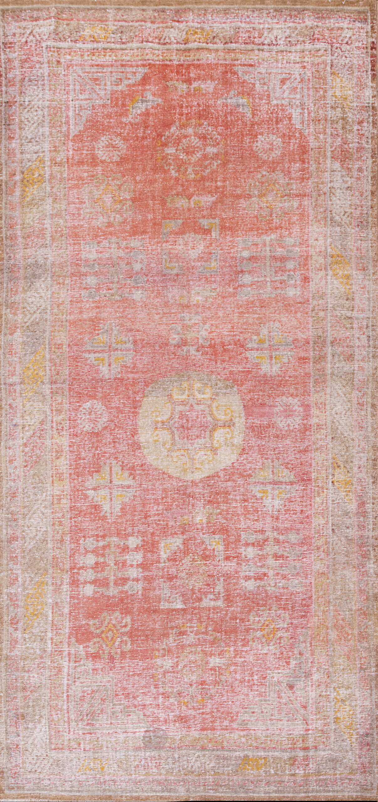 Antique Khotan East Turkestan Coral 1920s Rug, Circa Date: 1920s. This exquisite piece reflects the unique aesthetic of the khotan rug weaving tradition, blending Chinese imperial restraint with the bold, sometimes nomadic, designs of East Turkestan. The narrow, elongated shape suggests a practical application, typical of the era when such textiles were highly valued for their durability and striking appearance.