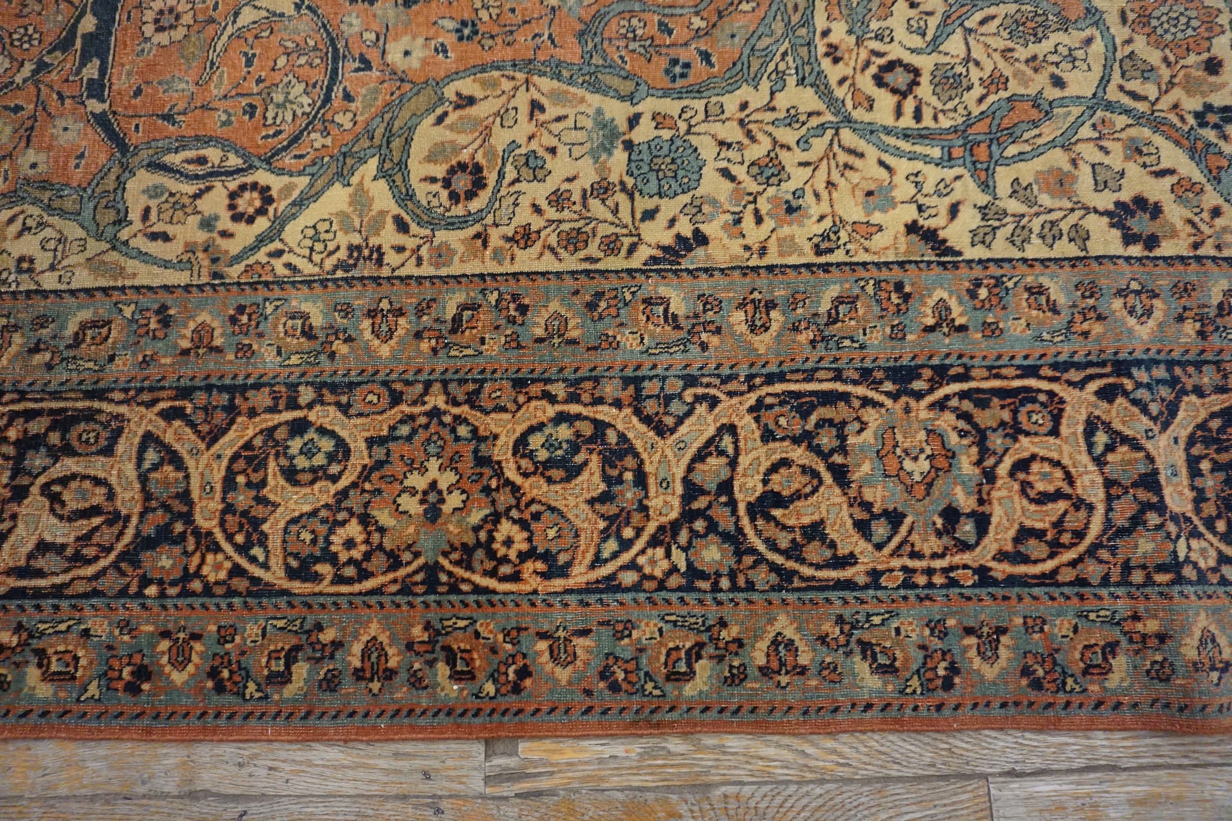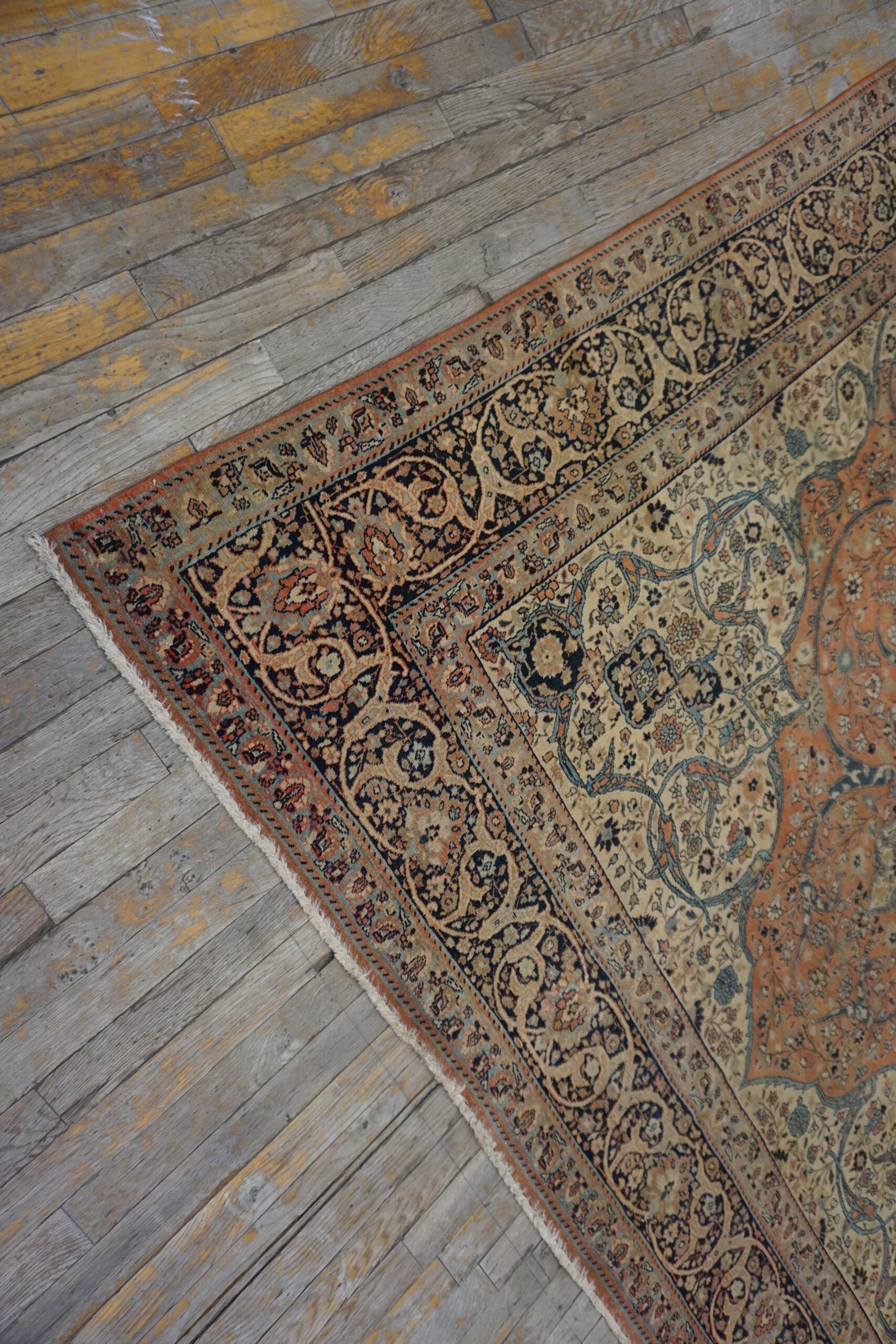 Woven with the characteristic precision and high knot density expected of master Tabriz workshops, the rug’s structure remains firm and supple. The complex border system frames the central design perfectly, utilizing multiple guard bands filled with repeating cartouches and stylized floral motifs in contrasting indigo and beige tones.