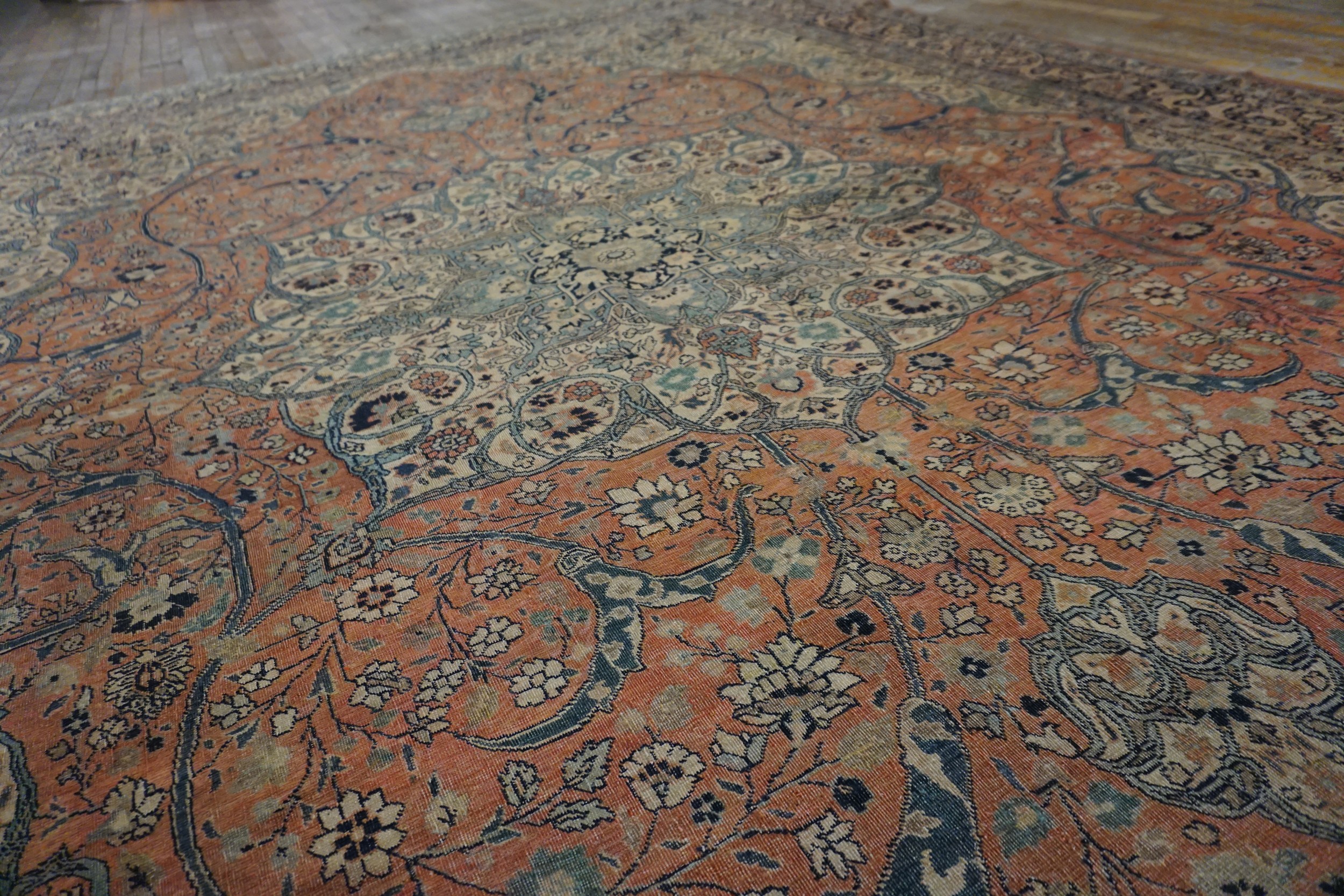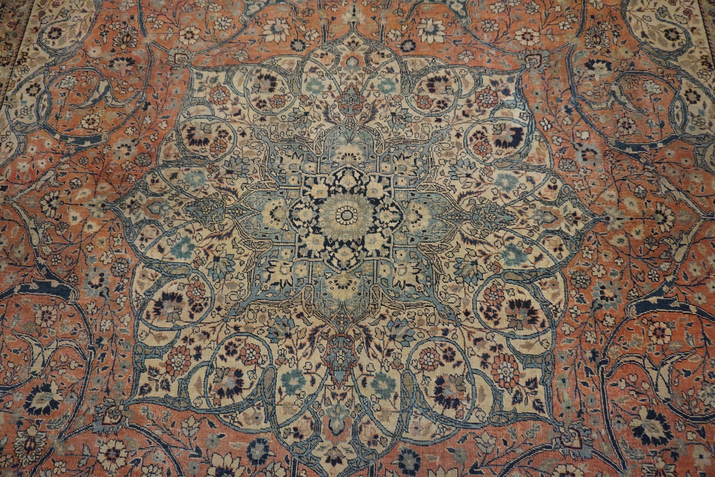 Antique Tabriz Persian Floral, Medallion Knotted Rug, Circa Date: 1890s. This exceptional Tabriz piece exemplifies the sophisticated urban weaving tradition of late 19th-century Persia. Its grand scale and meticulously rendered central medallion establish it as a superb example among antique rugs.