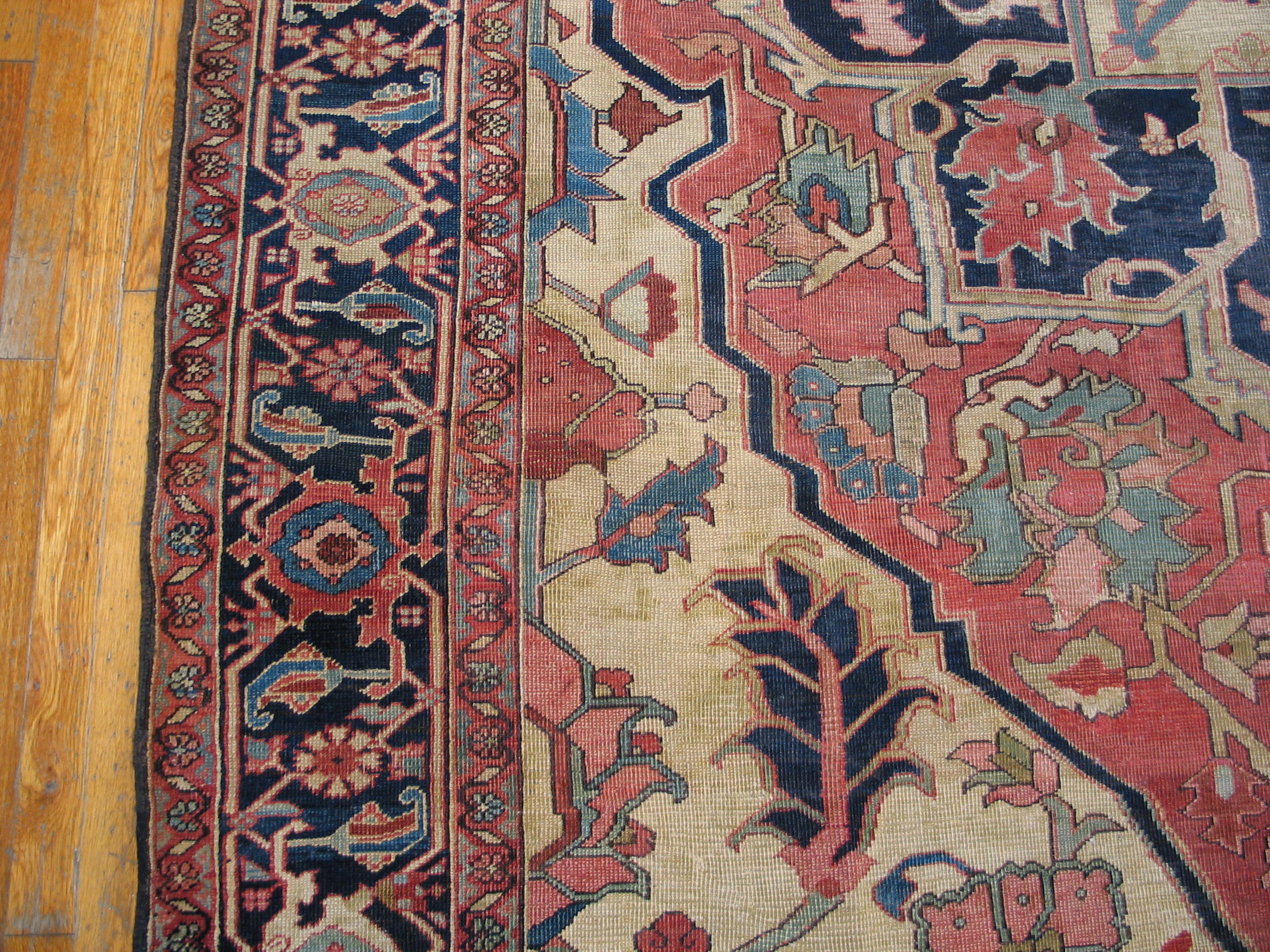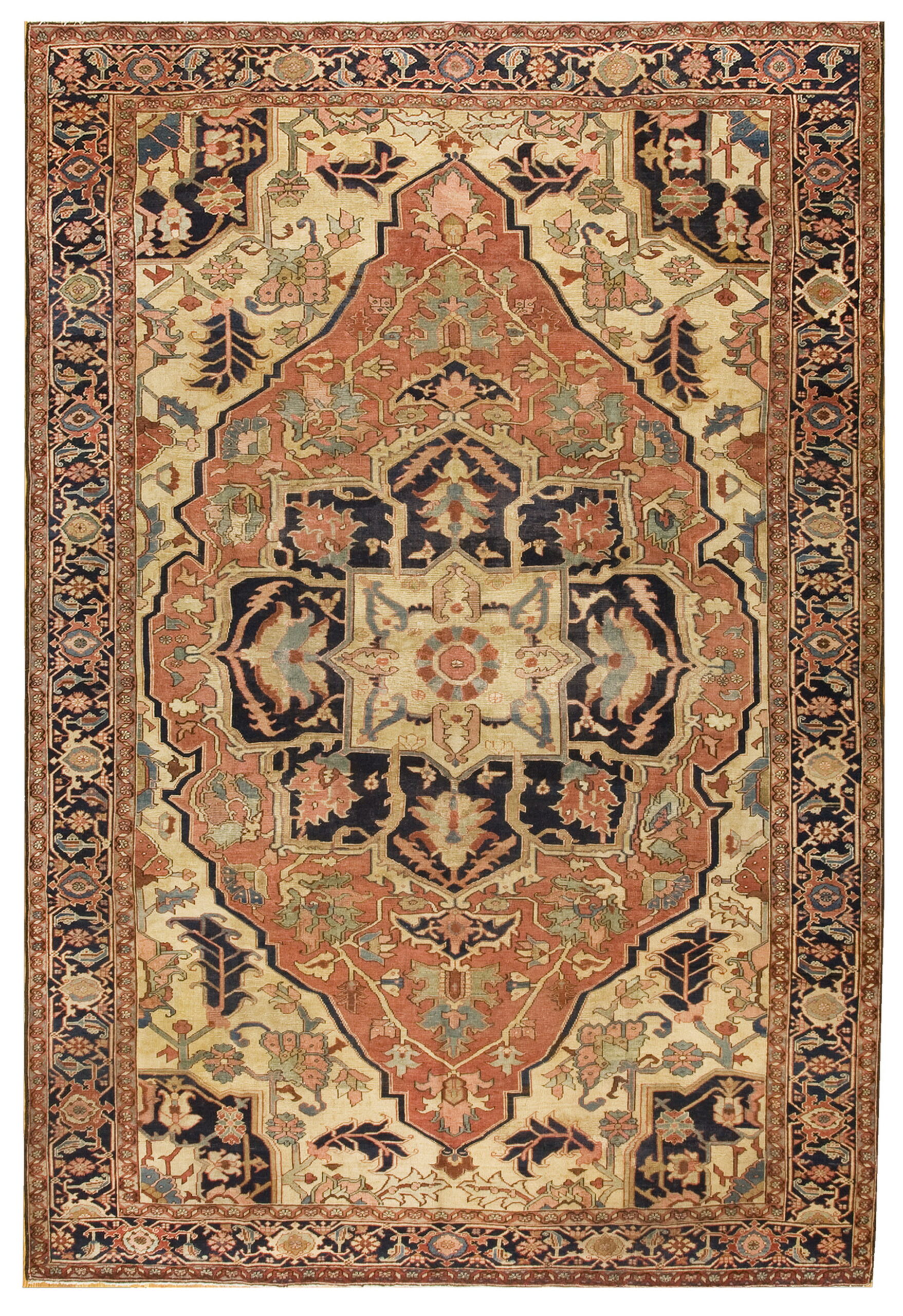 Antique Serapi Floral Medallion Hand Knotted Pile Rug, Circa Date: 1890s. This exceptional example of weaving artistry originates from the Heriz region of Northwest Persia, renowned for producing some of the most sought-after Serapi rugs of the late 19th century. The design centers on a dramatic stepped medallion, rendered in striking geometric precision, characteristic of the finest pieces from this period.