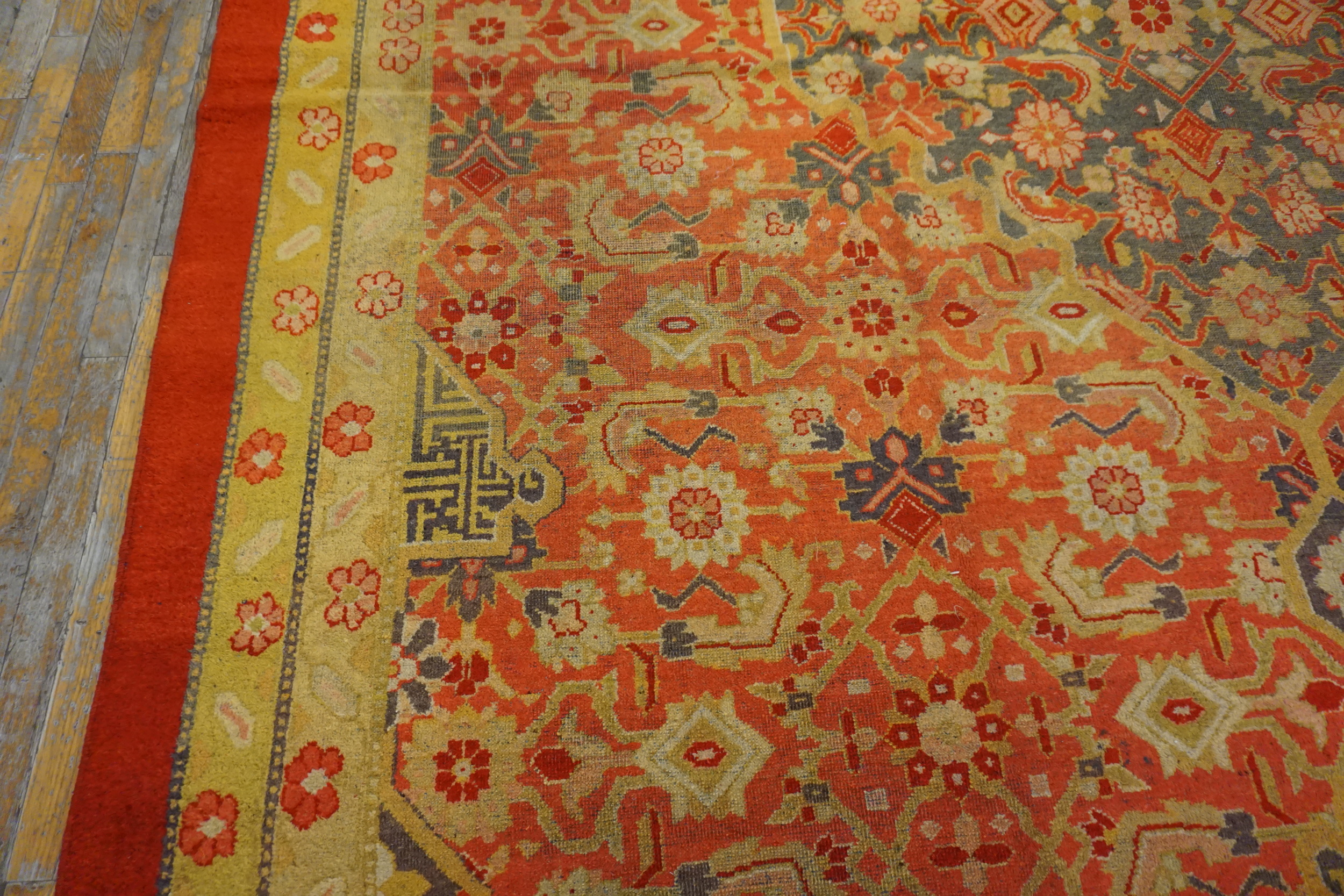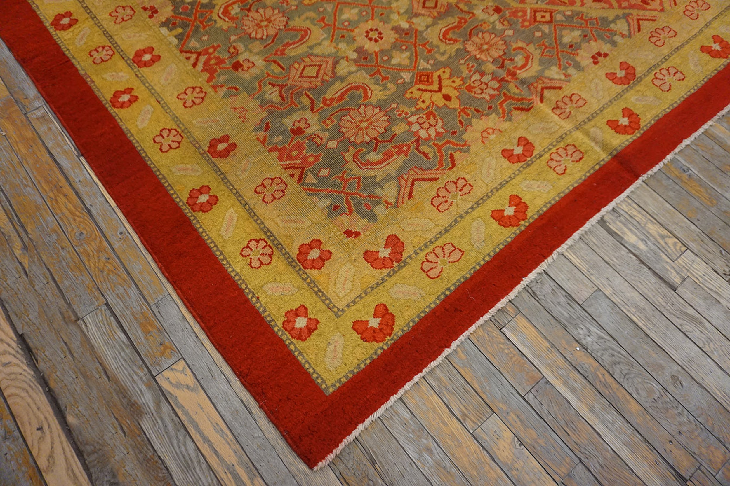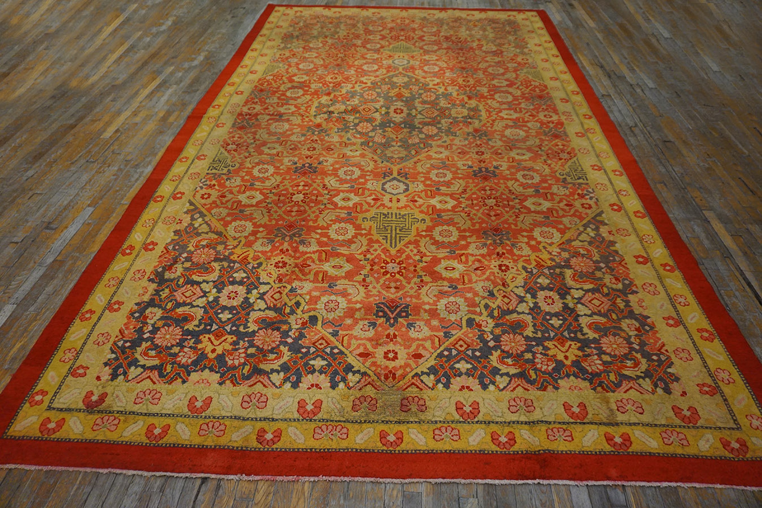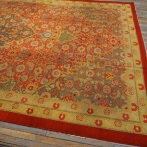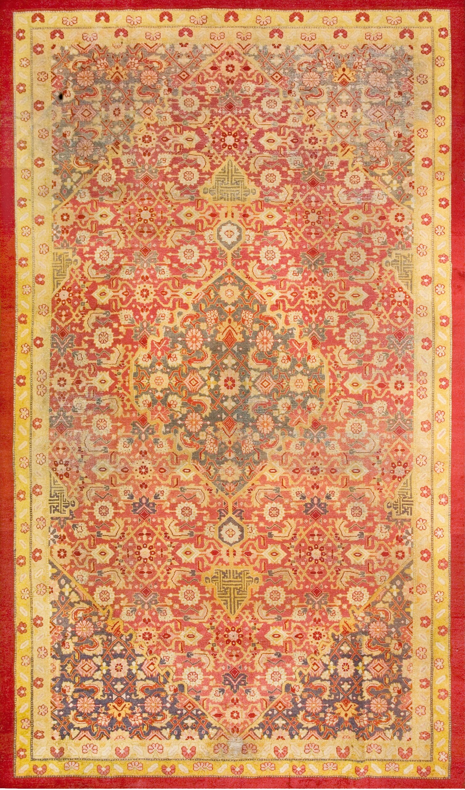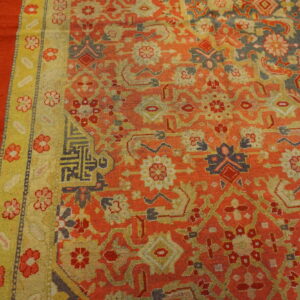 The field of the rug features a repeating Herati pattern, a classic motif originally rooted in traditions of the iconic Persian rugs and widely adapted across Indian weaving centers. Here, the design takes on a spirited interpretation, with stylized fish-like forms and angular botanical elements arranged in rhythmic succession. The result is a geometric composition that feels both structured and lively, perfectly suited to the carpet’s broad, welcoming surface.