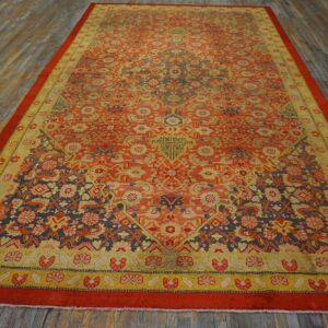 This rustic coral color tribal geometric Herati pattern antique Indian Amritsar carpet is a captivating example of historic area rugs from India that blends ancient design language with expressive tribal geometry. Woven in the renowned textile region of Amritsar, this antique Herati design rug showcases a design aesthetic where bold patterning and rich coloration combine to create both visual depth and rhythmic structure.