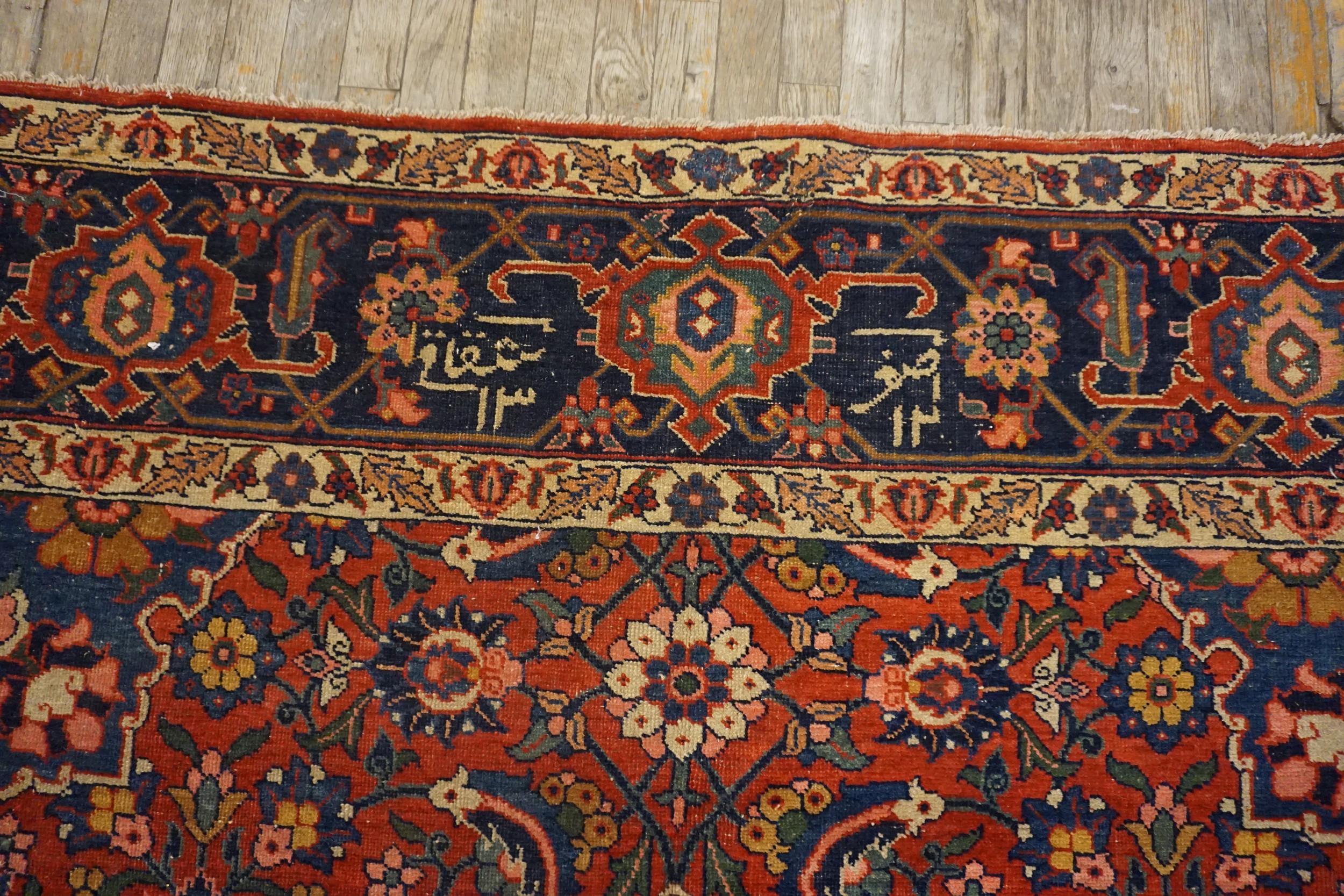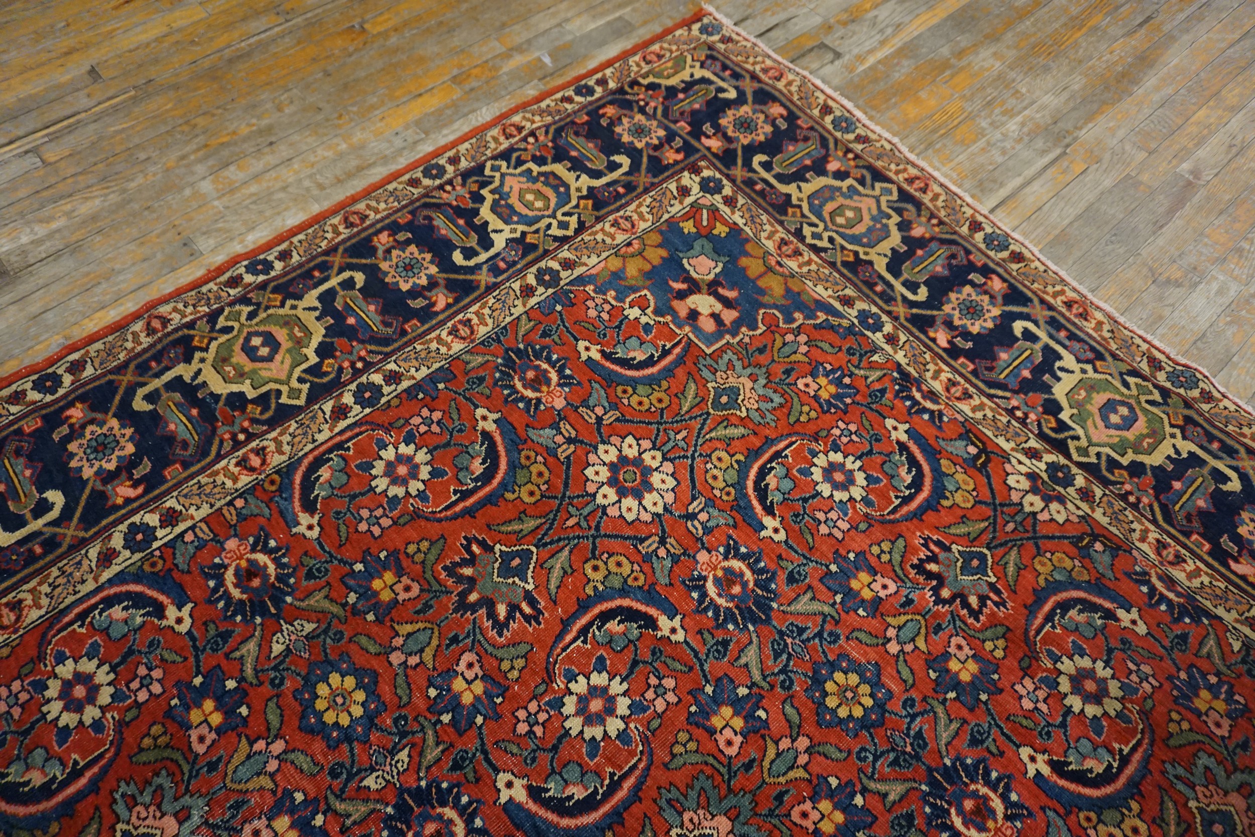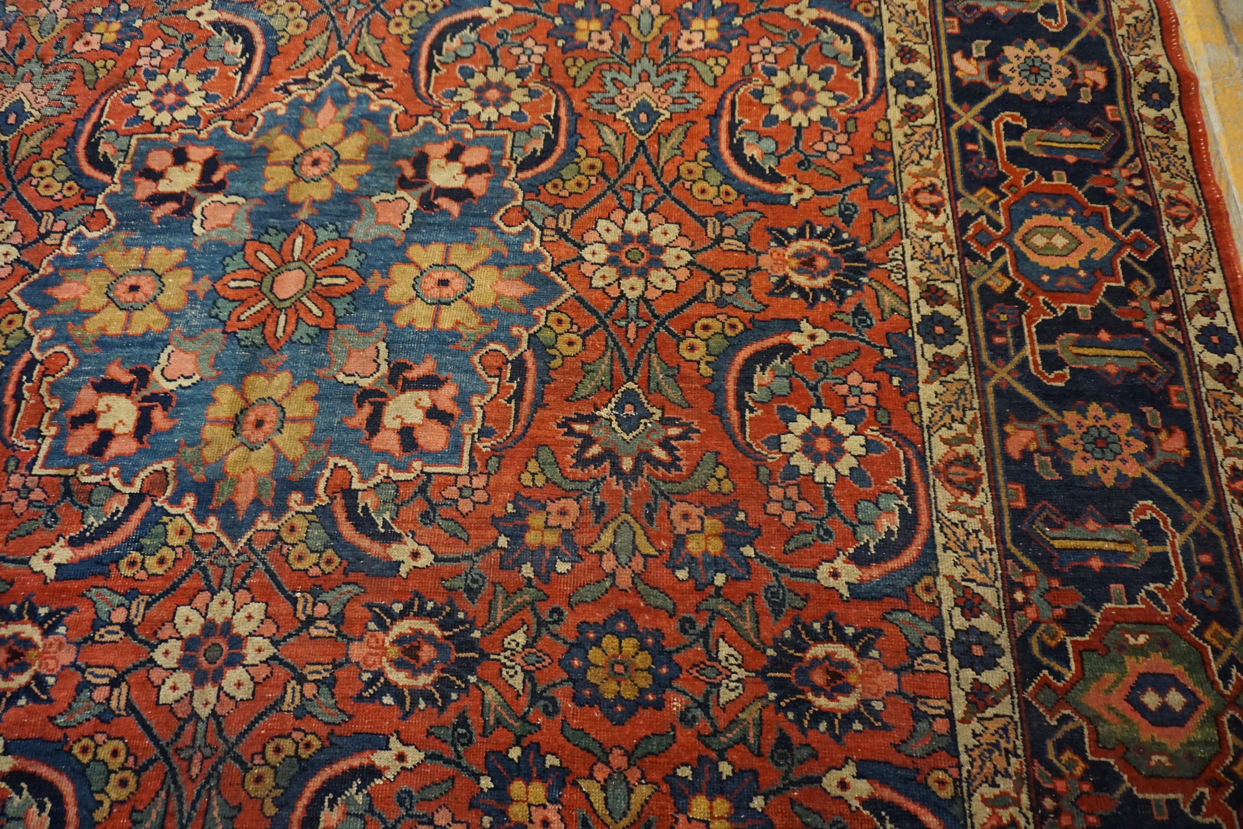 The palette is masterful, utilizing rich, saturated dyes that have mellowed beautifully over a century. The primary ground color is a deep, resonant hue that transitions between rust and a vibrant salmon coral pink, providing a warm contrast to the deep indigo of the main border and the secondary accents of sky blue and ivory.