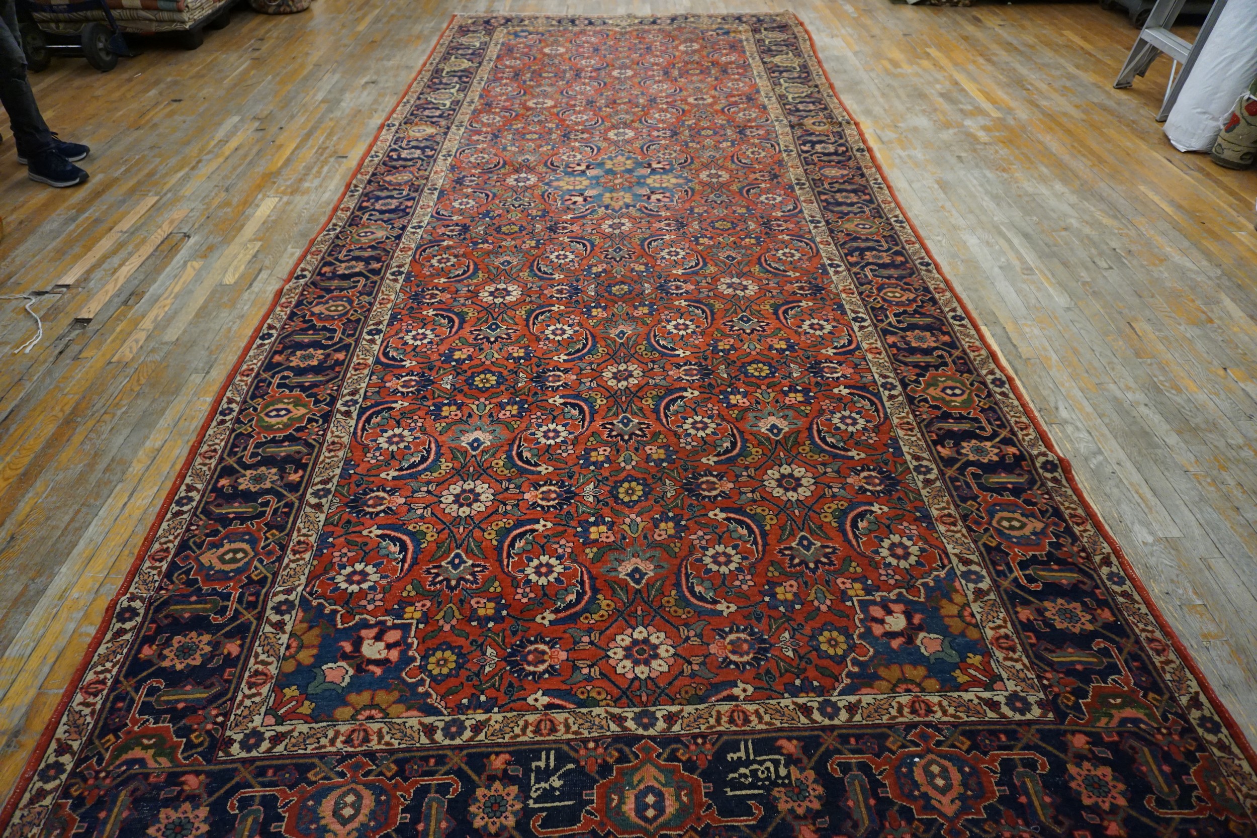 The field is dominated by an intricate, all-over Herati-inspired motif, featuring stylized palmettes and delicate vines that create a sense of continuous movement. A small, subtle central medallion anchors the composition, rendered in soft blues and golds. Given its substantial dimensions, this piece is ideally suited as a foundational element for grand interiors, qualifying it as one of our premier room size rugs.