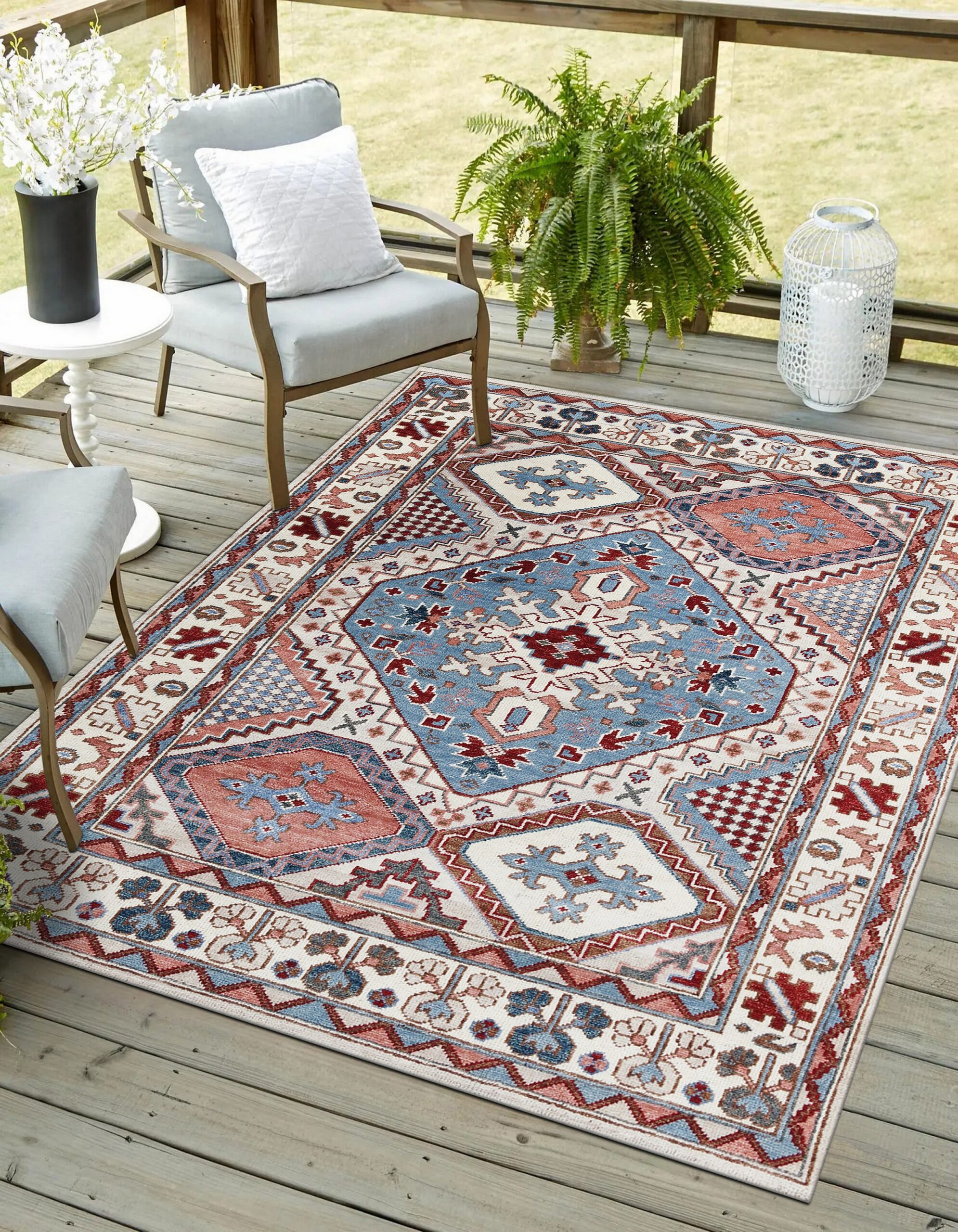 The palette is deceptively complex, featuring vibrant terracotta and cerulean blues set against a field of soft ivory. While the overall effect leans toward warmth, the subtle integration of slate and charcoal tones provides the sophisticated depth expected in gray color rugs. This balance ensures the rug remains versatile, complementing both traditional wood finishes and contemporary stone floors.