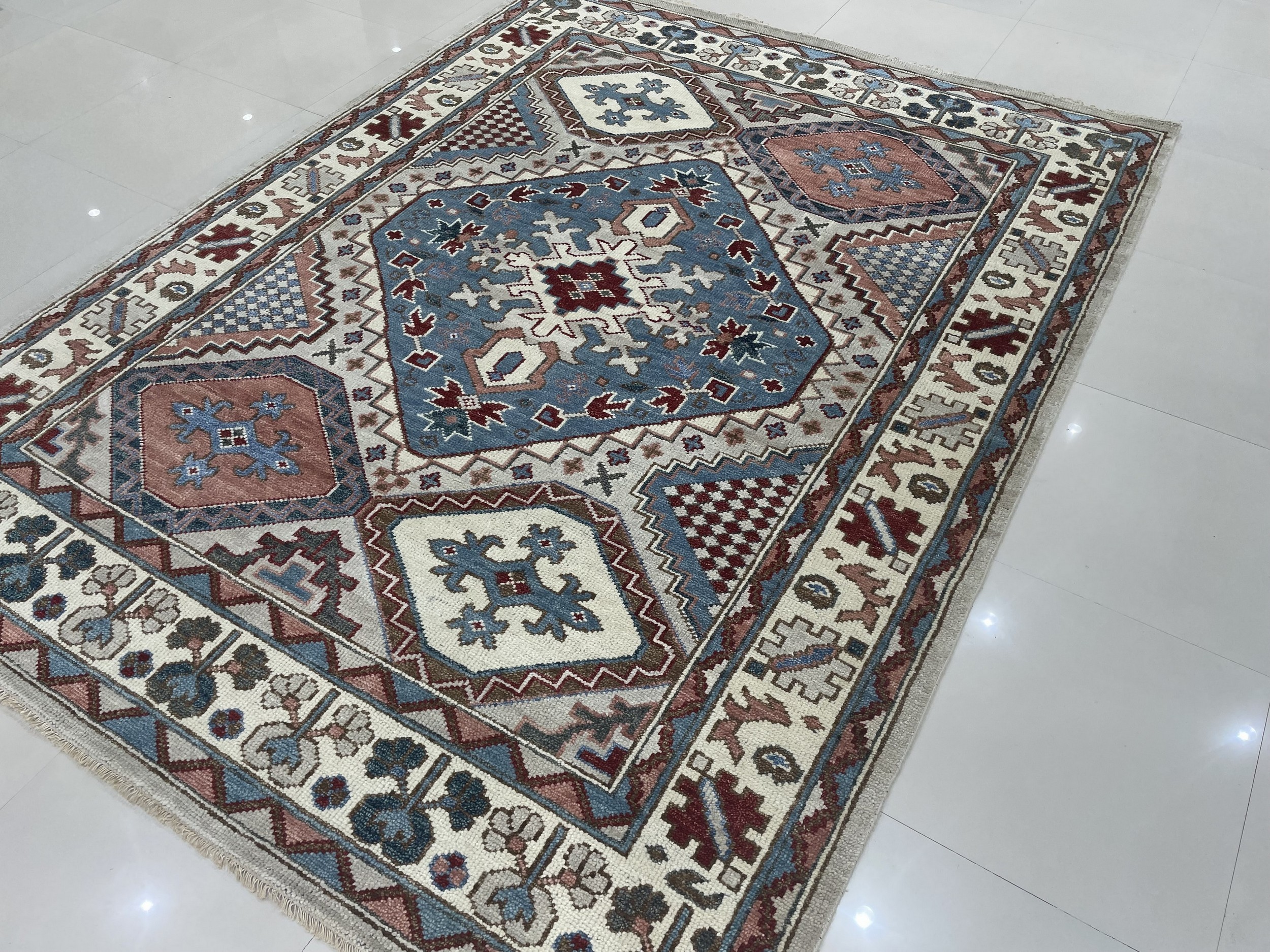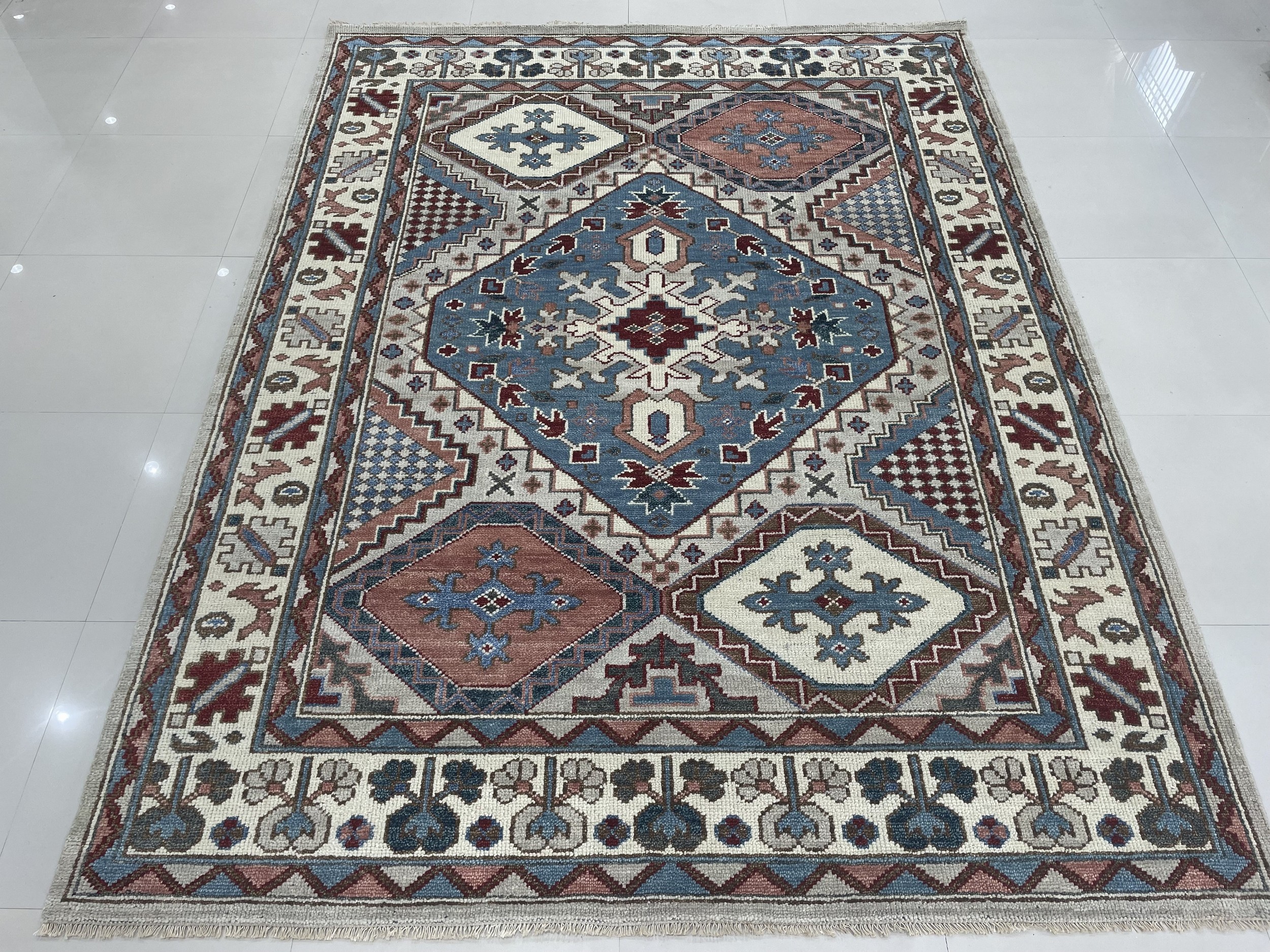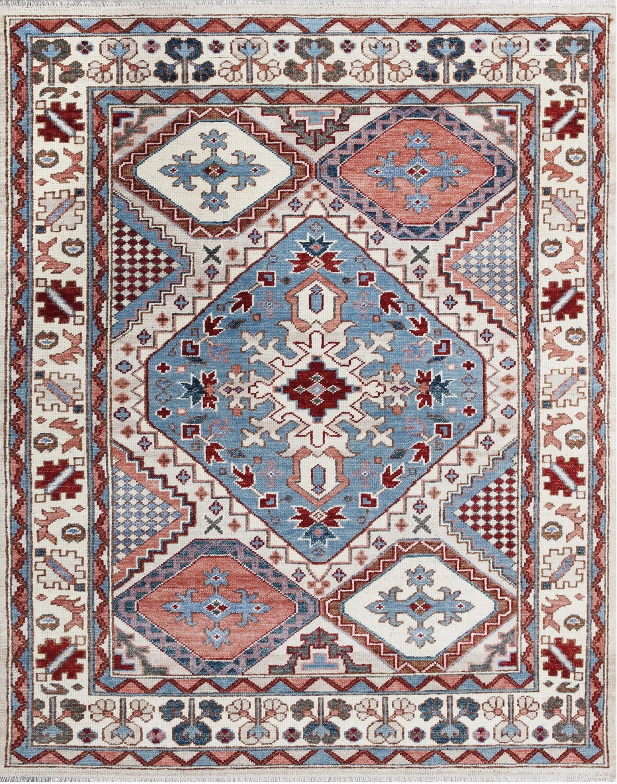 The central design features a powerful, stepped diamond medallion framed by repeating, angular motifs. The precision of the knotting highlights the intricate borders, which are filled with stylized flora and fauna typical of village weaving traditions. Sized to command a space, this piece is ideal for those seeking room size rugs that anchor a living area or dining hall with undeniable presence.