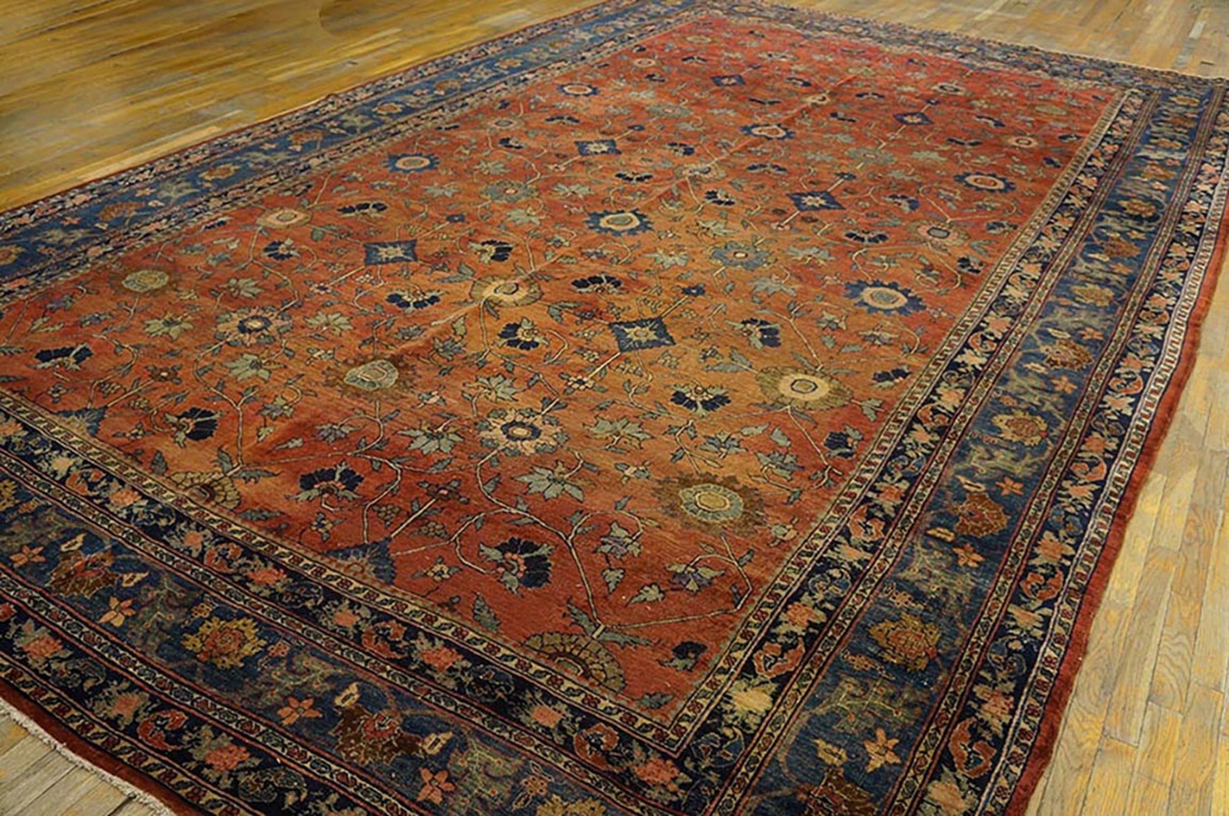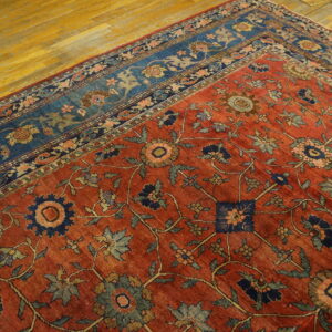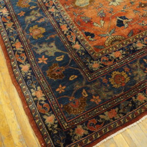 The primary field is saturated in a deeply nuanced coral hue, softened by a century of gentle wear, creating a patina that is highly sought after. This specific shade places it among our finest examples of salmon coral pink color rugs, providing warmth and depth against the contrasting deep indigo border.