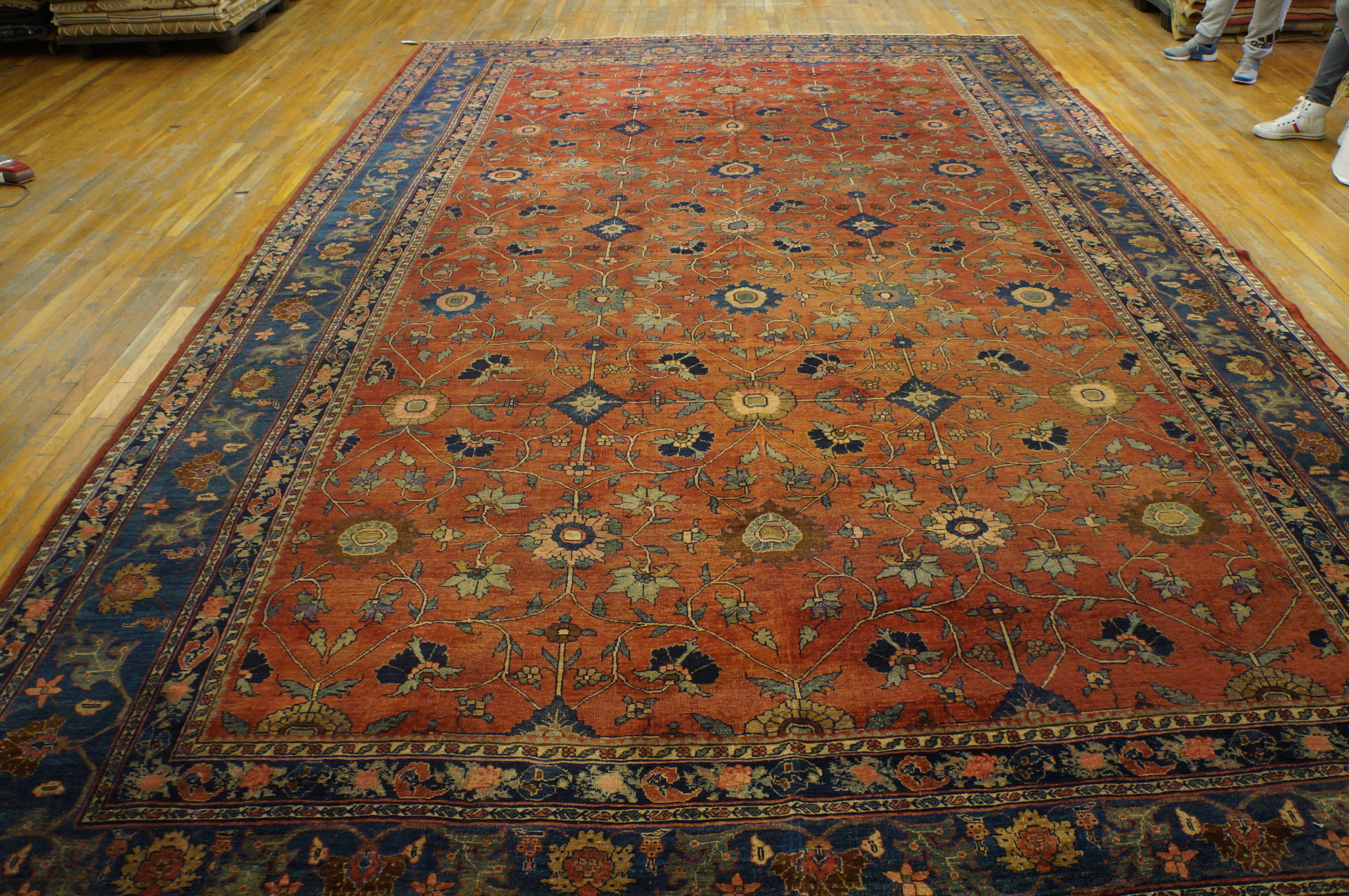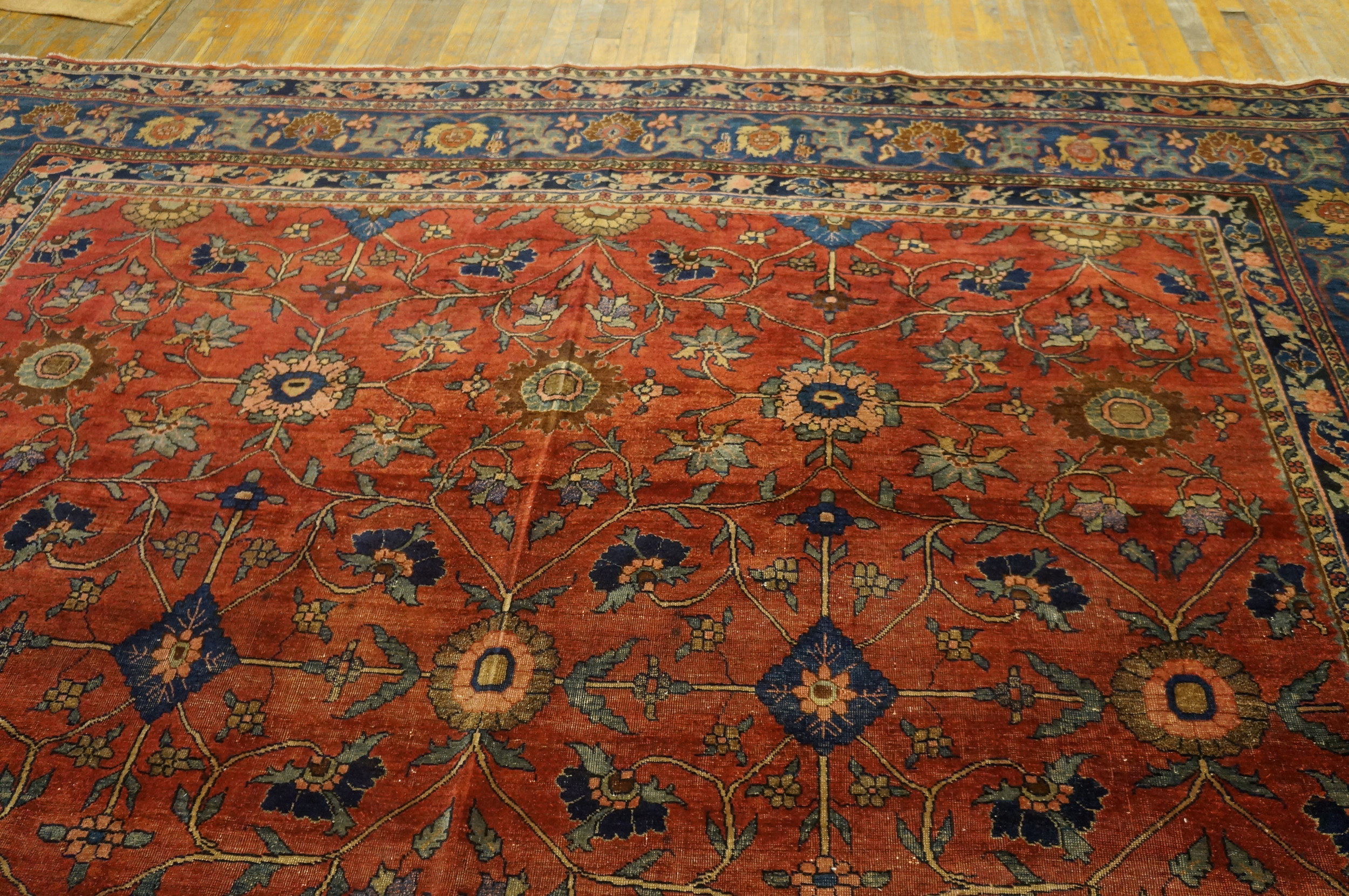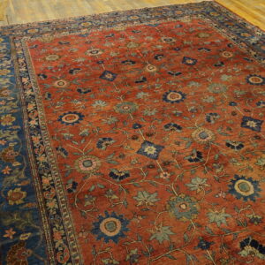 Given its substantial dimensions, this piece functions beautifully as a foundational element in a grand space. The scale and striking color combination make it a powerful decorative statement, suitable for those seeking a truly large oversized rug with historic provenance and enduring character.