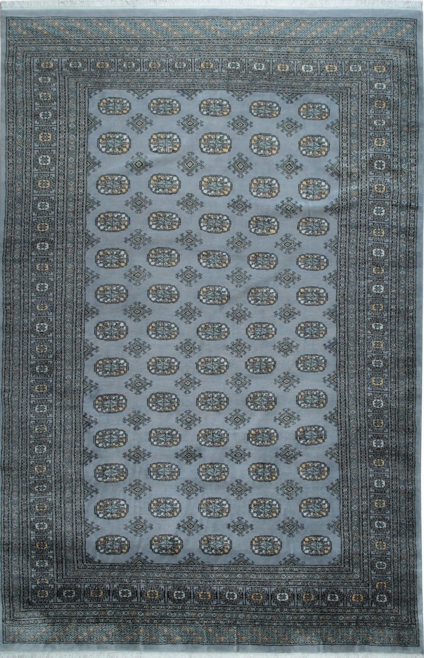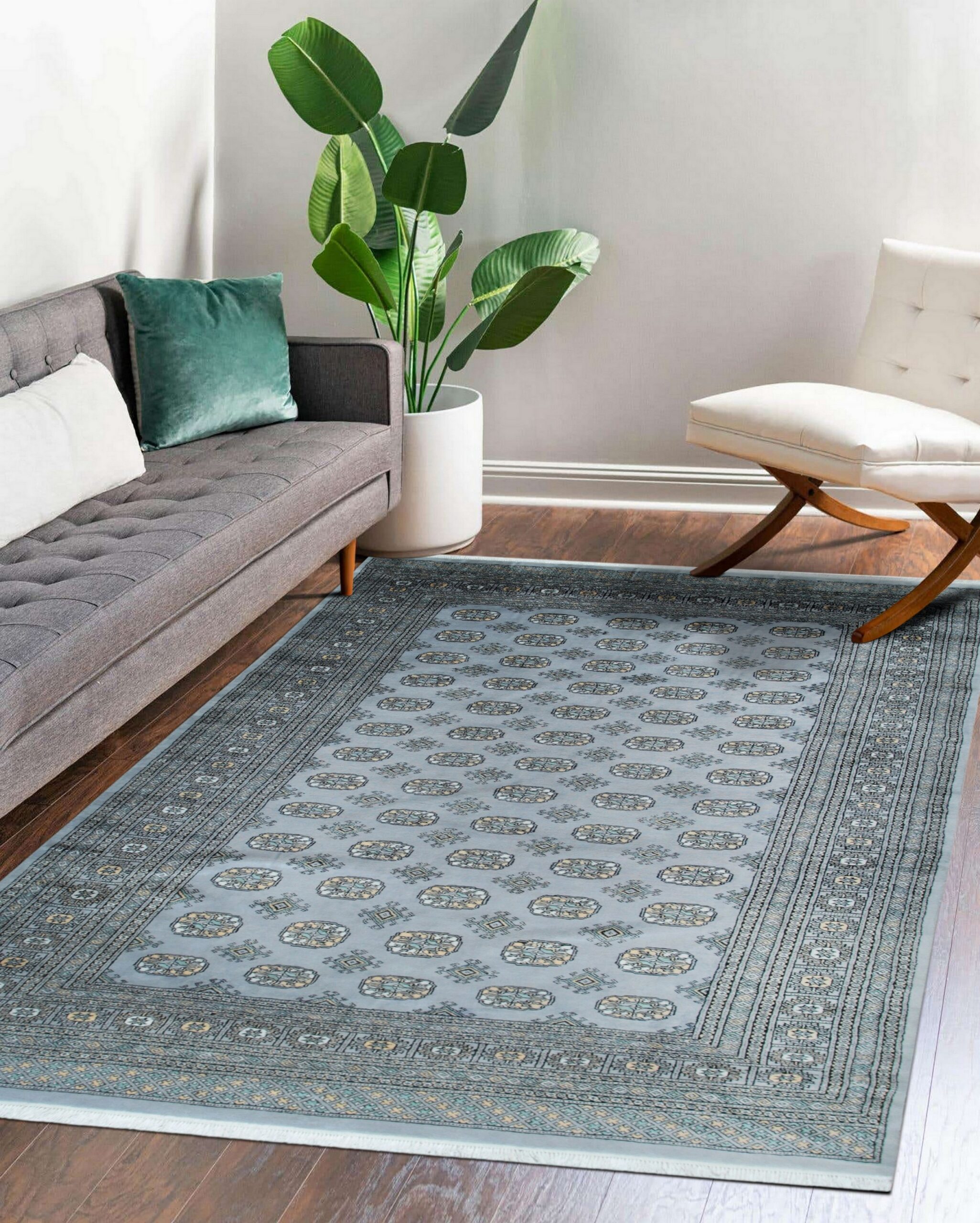 The central field utilizes a sophisticated, muted blue-gray hue, providing a versatile foundation for modern interiors. This refined shade is highly sought after in contemporary design palettes, offering a calming anchor among gray color rugs. The repeating gul motif—a traditional design element—is rendered in subtle tones of cream, gold, and teal, lending depth and visual interest without overwhelming the space.