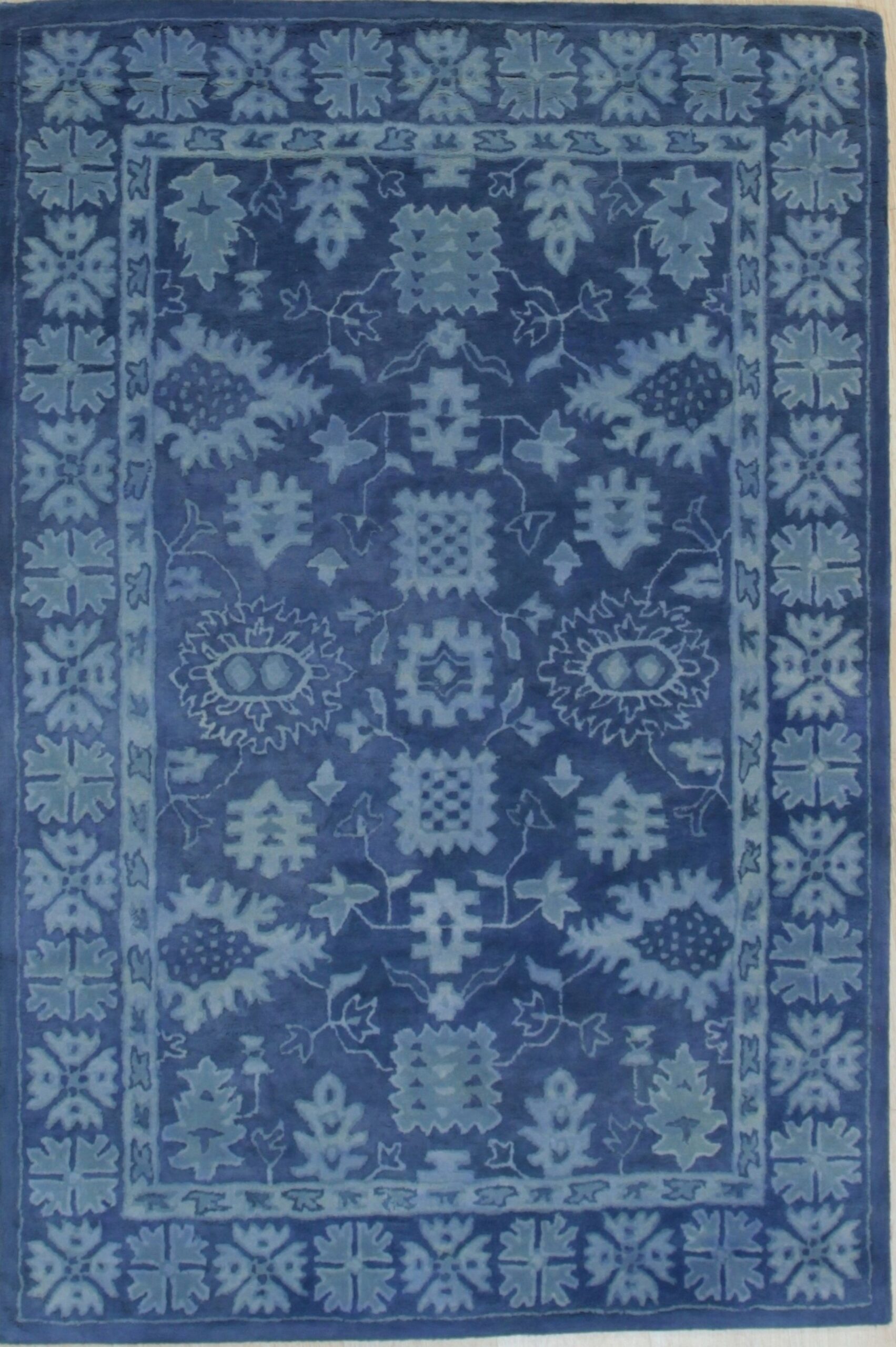 The rug's primary appeal lies in its rich, saturated indigo field, contrasted by lighter, almost denim-toned motifs. This effective use of a single hue creates depth and visual texture, making it a distinguished addition to any space seeking the calming influence of blue color rugs.
