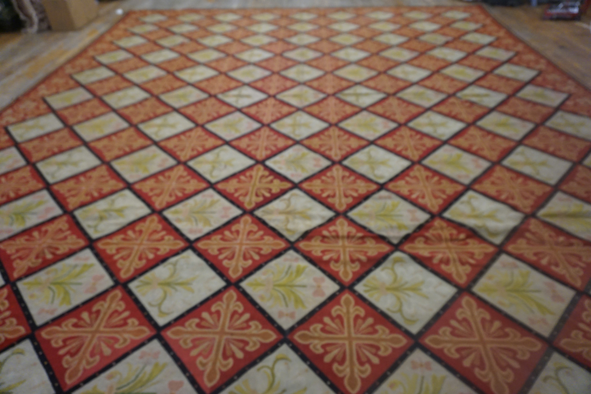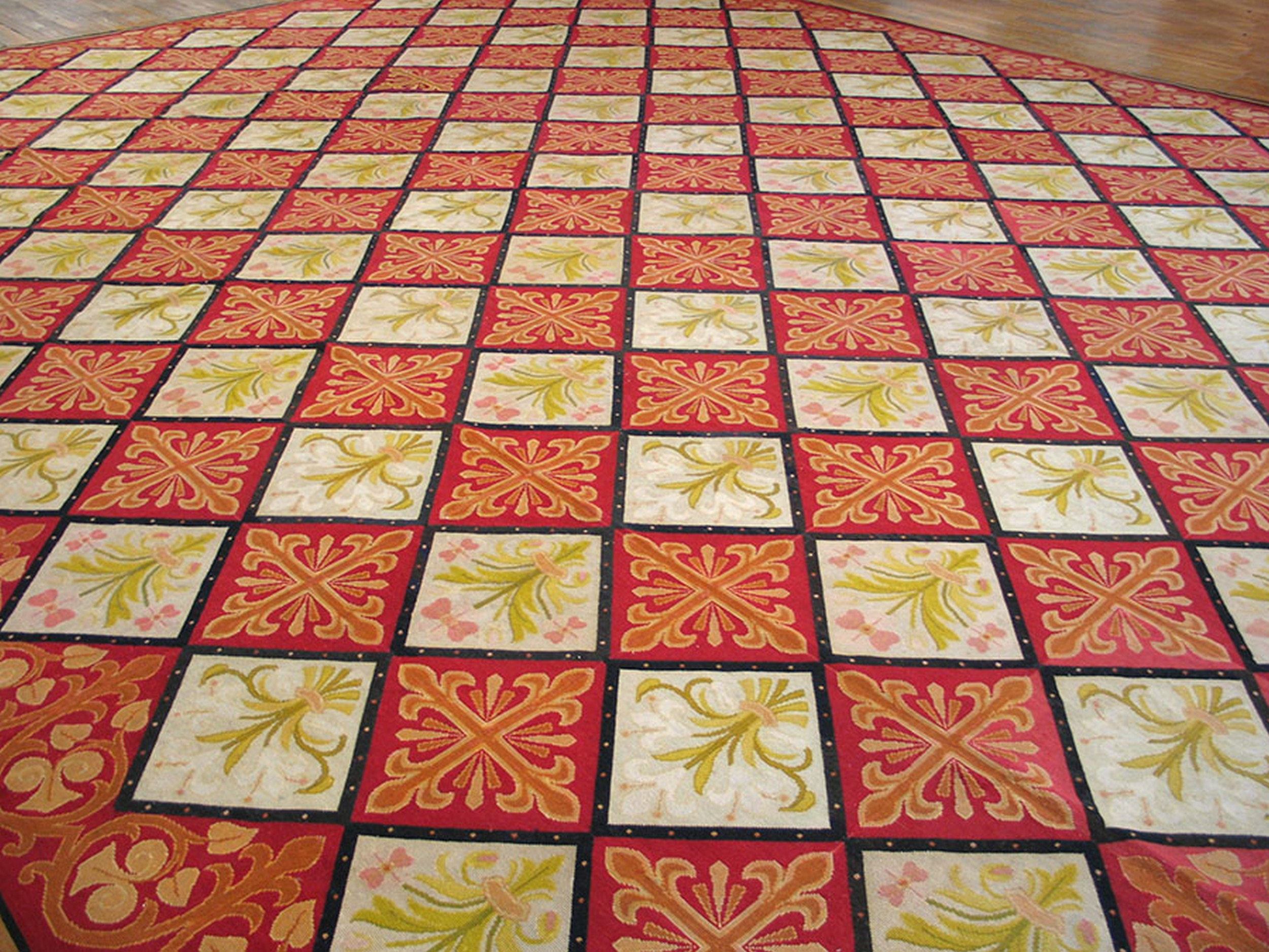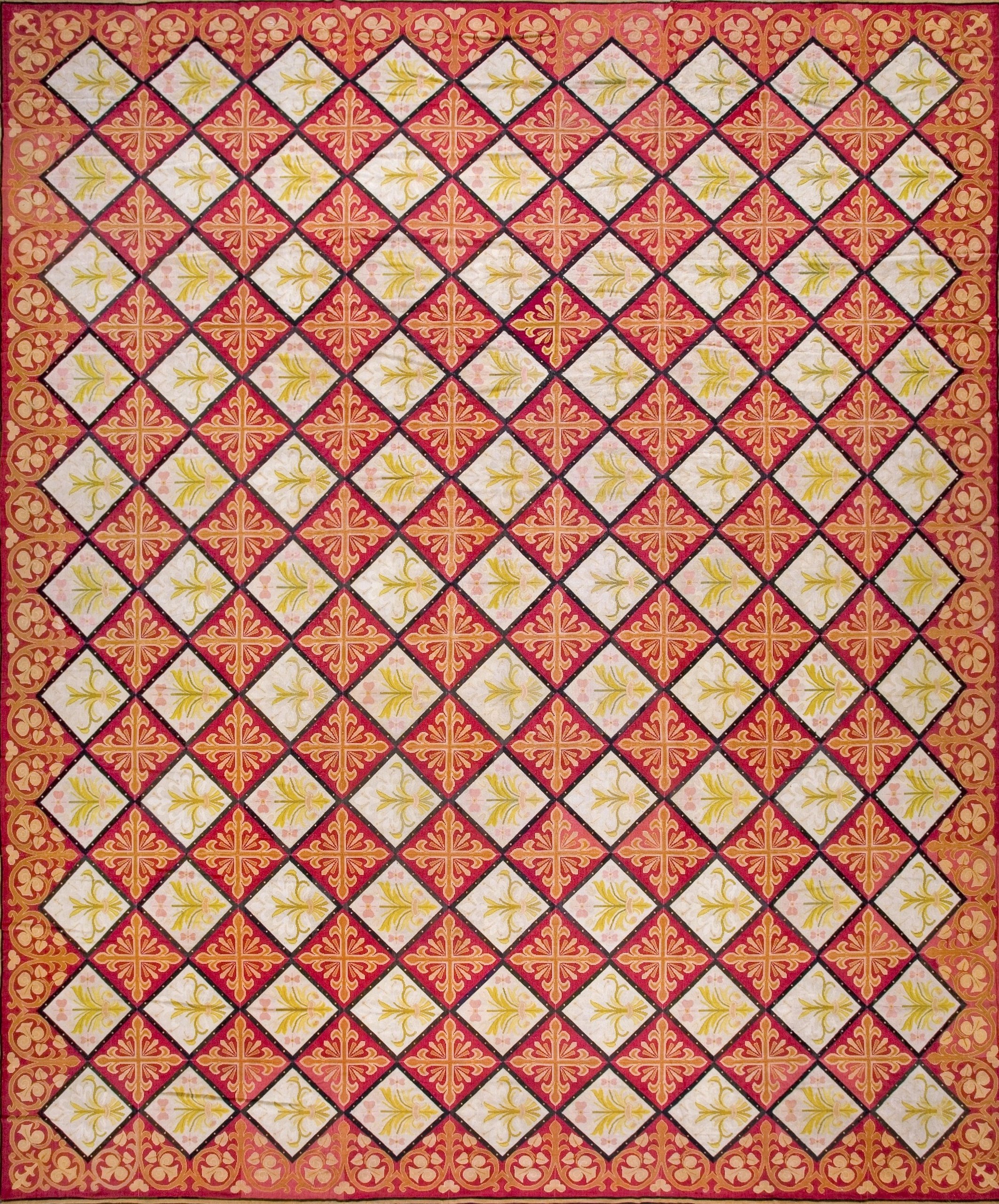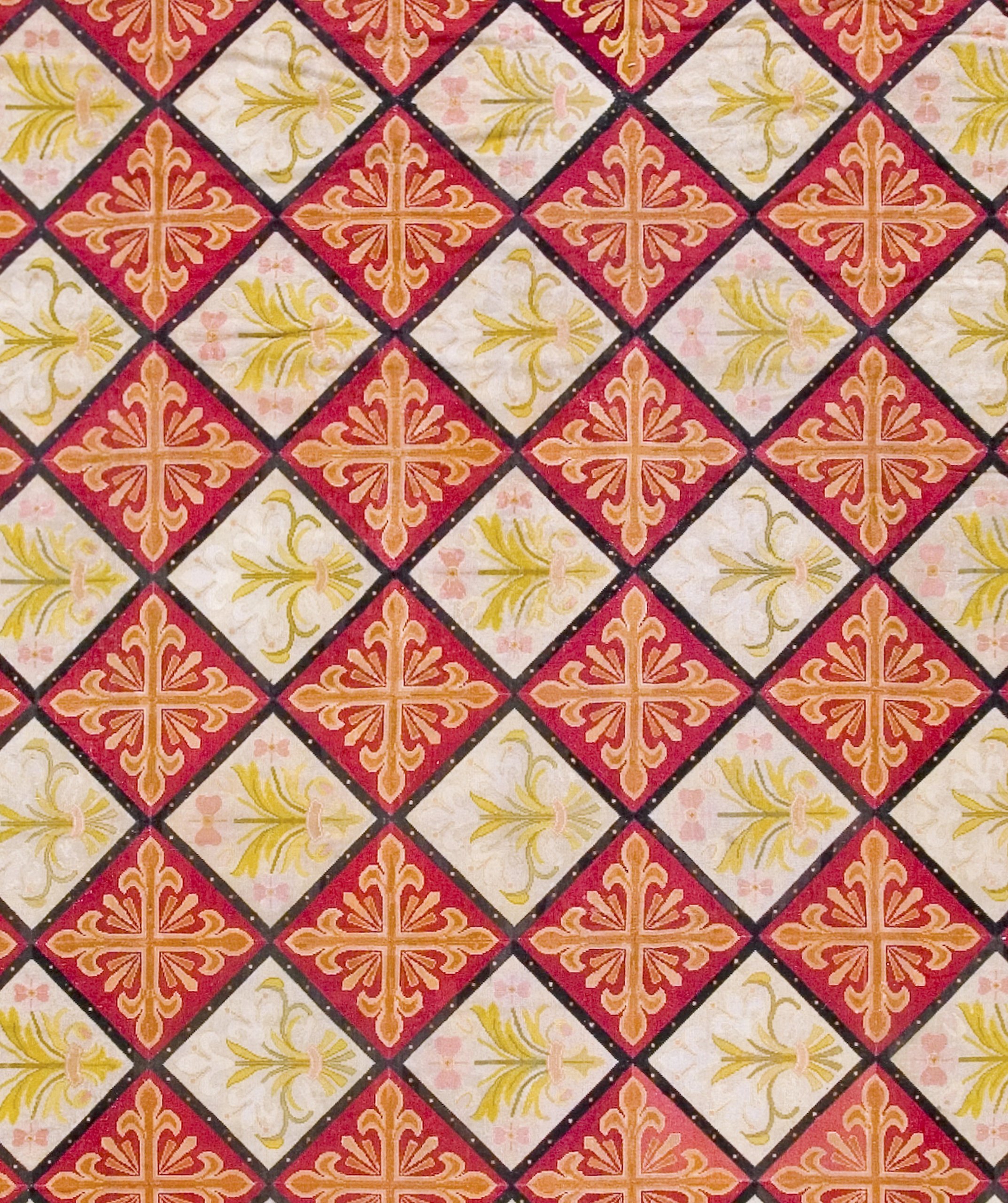 Historically, the Fleur-de-lis (the stylized lily) is one of the most potent symbols in Western heraldry, serving for centuries as the official emblem of the French monarchy. In the context of 19th-century textile design, the use of this motif represented a “Neo-Renaissance” or “Restoration” aesthetic, as the post-Napoleonic era saw a renewed fascination with the symbols of the Ancien Régime and the artistic glory of the French crown. This carpet arranges the symbol within a disciplined, tile-like grid, a design choice that reflects the influence of Gothic Revival architecture. The flatwoven nature of the needlework creates a low-profile, “carpet-as-tapestry” effect, prized by the nineteenth-century bourgeoisie for its ability to lay flat beneath heavy mahogany furniture while providing a durable, painterly surface.