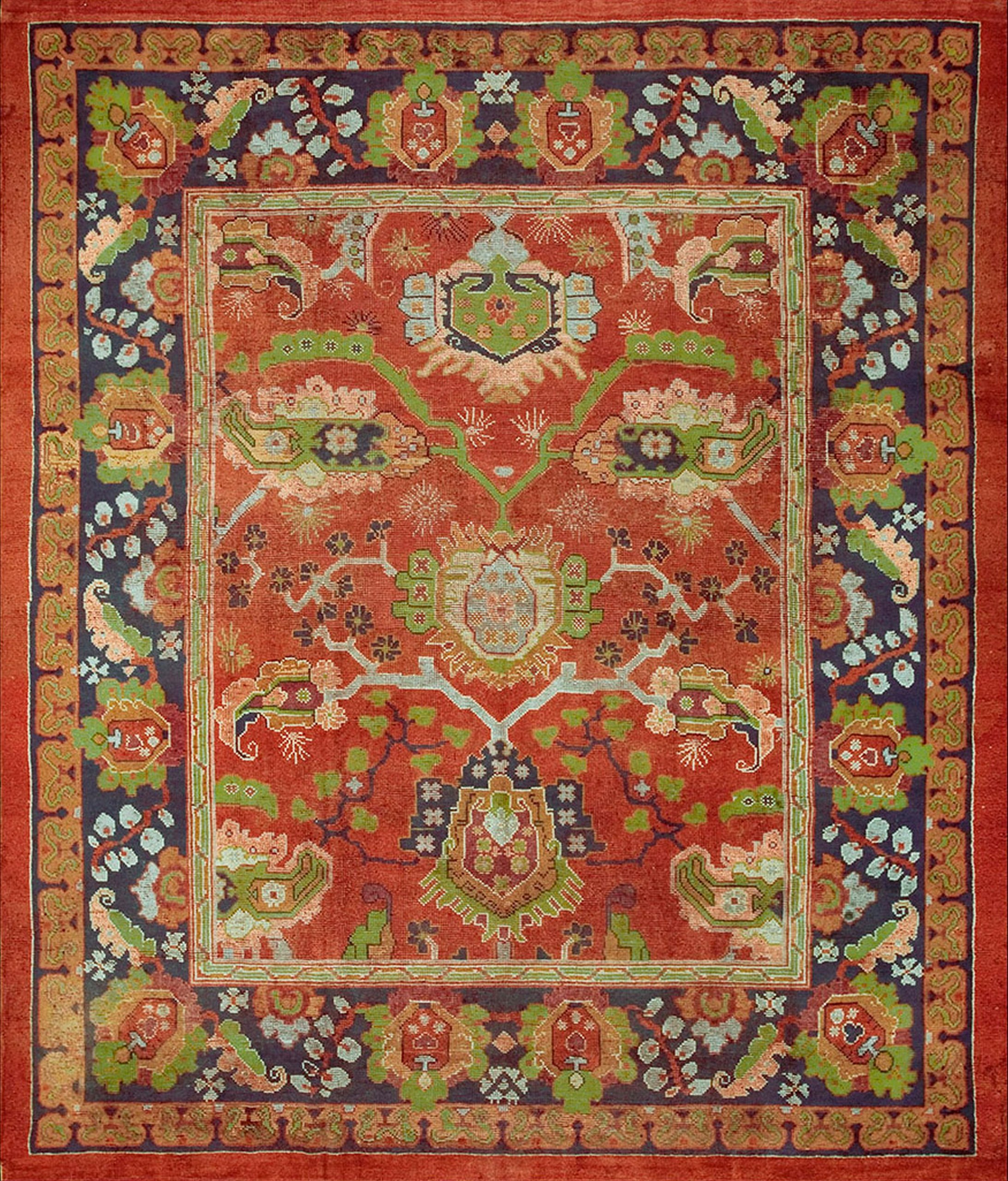 Technically, the antique Irish carpets are prized for their substantial, “architectural” pile and luxurious, heavy handle. Because they were hand-knotted using a coarser Ghiordes knot than their Eastern counterparts, they possess a unique, nubby texture that feels both rustic and incredibly opulent. This “Gavin Morton” style is characterized by a deliberate lack of busy borders, often using a single, broad decorative band to frame the central field, which allows the expansive, geometric-floral patterns to dominate the room.