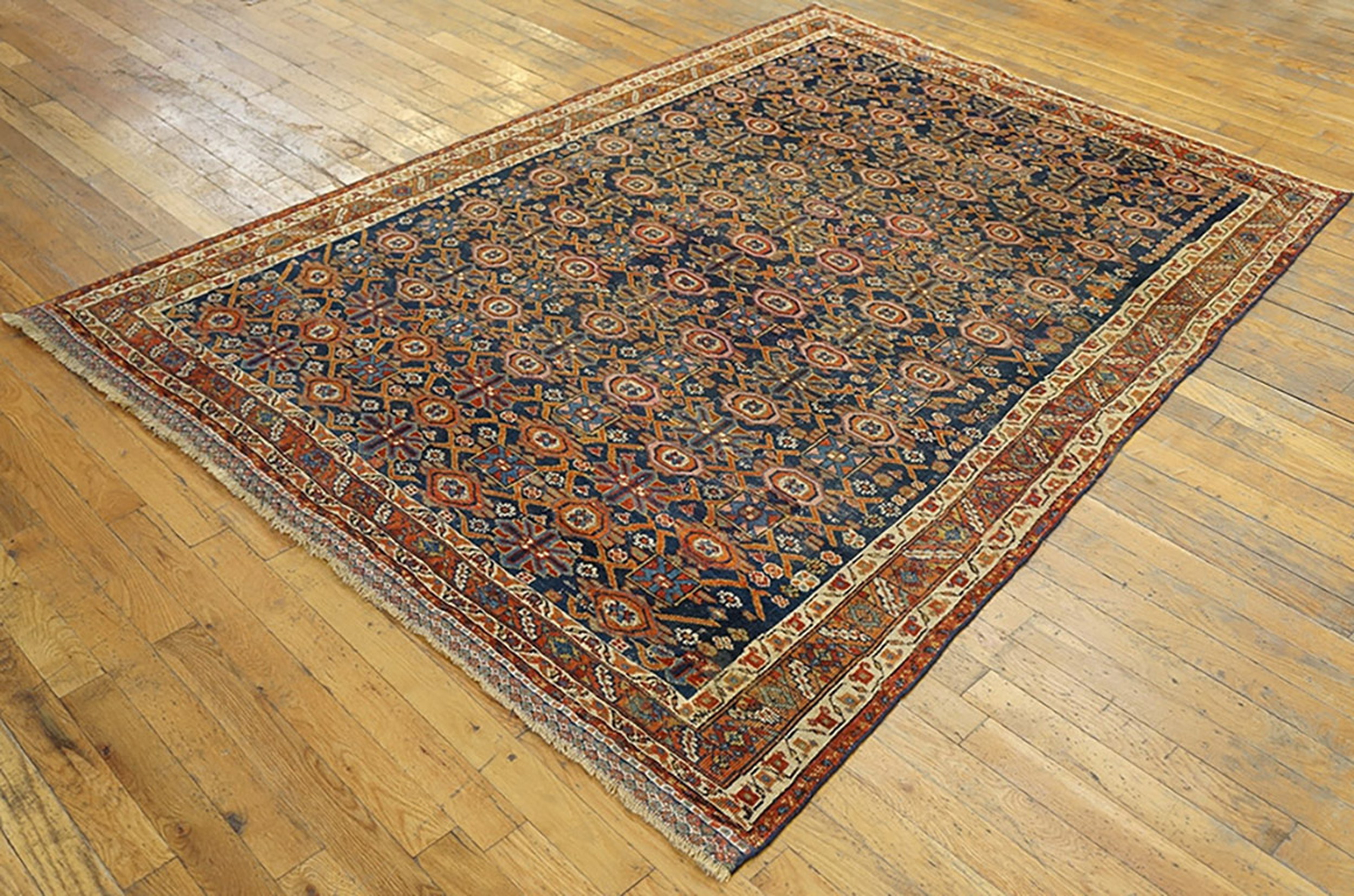 Characteristic of Afshar production, the central composition features a highly stylized, dense arrangement of repeating octagonal and cruciform motifs. This intricate, non-directional pattern is a classic example of an allover rugs design, ensuring visual interest from every angle without relying on a central medallion.