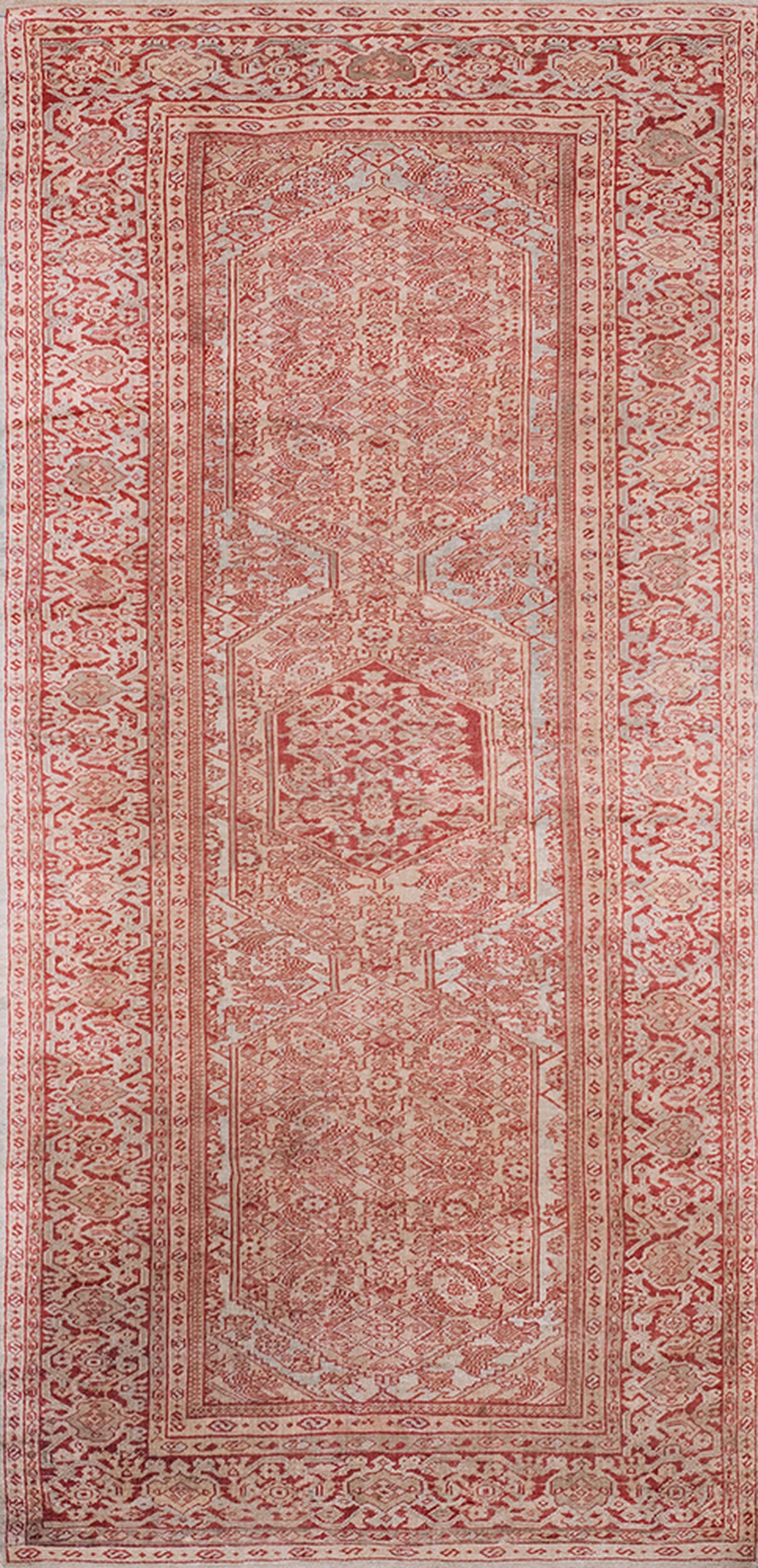 Antique Sultanabad Hallway Runner Wool Rug, Country of Origin: Persia, Circa Date: 1880s. This exceptional late 19th-century weaving hails from Persia, representing the pinnacle of Sultanabad production during the Qajar era. The design utilizes a restrained palette of madder red and ivory, characteristic of pieces intended for Western export markets, allowing the intricate detail to speak softly.