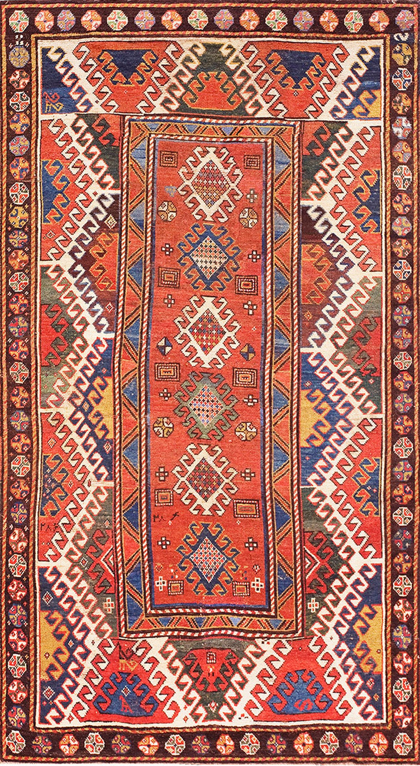 This nineteenth-century Caucasian Borchalou Kazak rug is a masterpiece of tribal geometry, originating from the Borchaly region in the south-central Caucasus (modern-day Georgia). Among the diverse families of Kazak weavings, the Borchalou (or Bordjalou) is legendary for its raw, “primitive” power and its distinctively thick, lustrous pile. These antique tribal Caucasian rugs are highly coveted by collectors for their ability to balance a monumental, architectural scale with a playful and spontaneous artistic spirit.