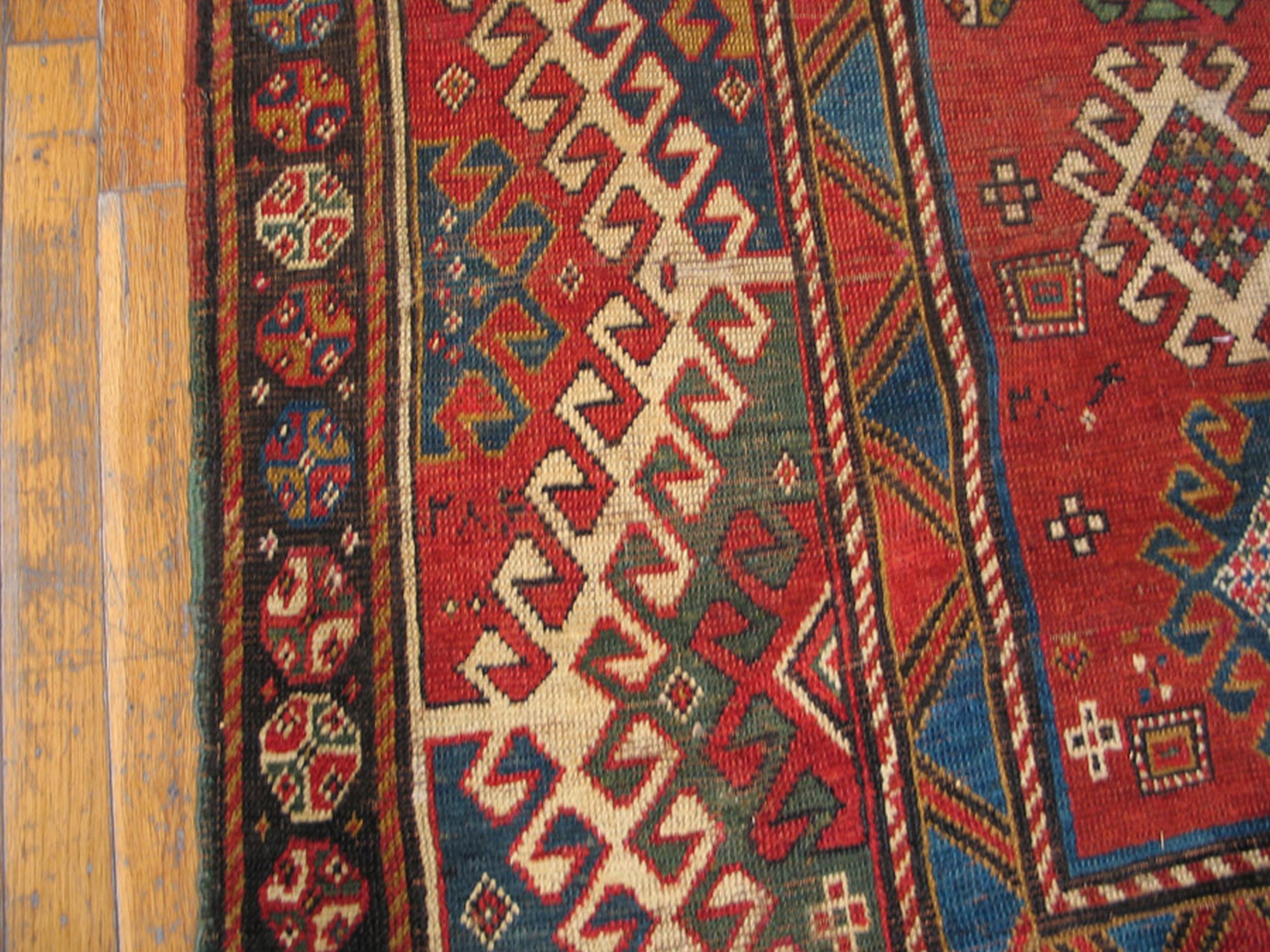 The color palette is a quintessential display of 19th-century natural dye work. Antique Caucasian Borchalou Kazak rugs are famous for their bold use of “primary” contrasts: deep, saturated madder reds, brilliant indigo blues, and clear, creamy ivories. A rare and identifying hallmark of this subgroup is the frequent inclusion of a vibrant apple or forest green, a color that is notoriously difficult to achieve with natural dyes and serves as a badge of quality for the weaver’s skill. The “Rustic” quality of the rug is further enhanced by abrash—natural tonal shifts in the color that create a painterly, watercolor-like depth across the wool.
