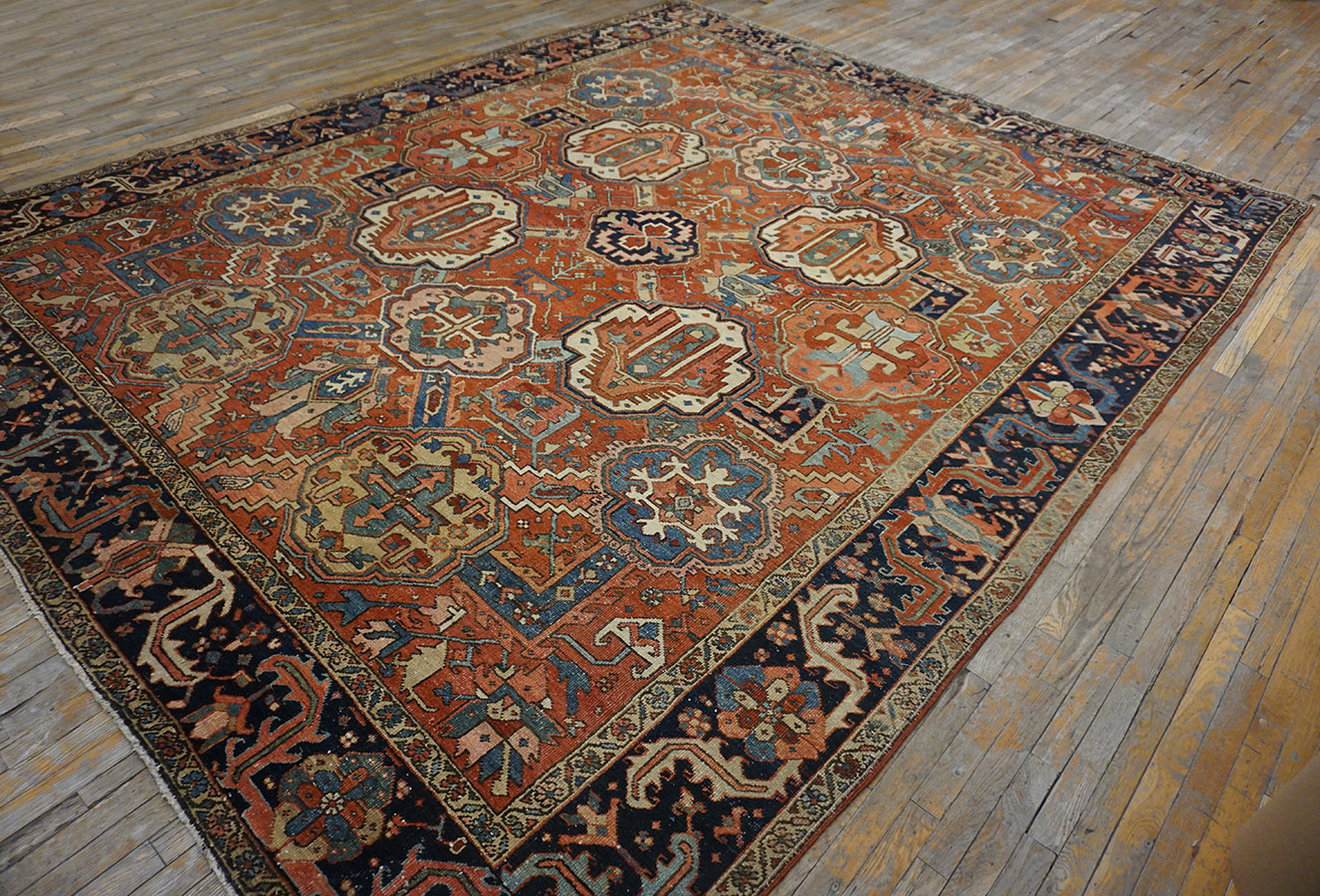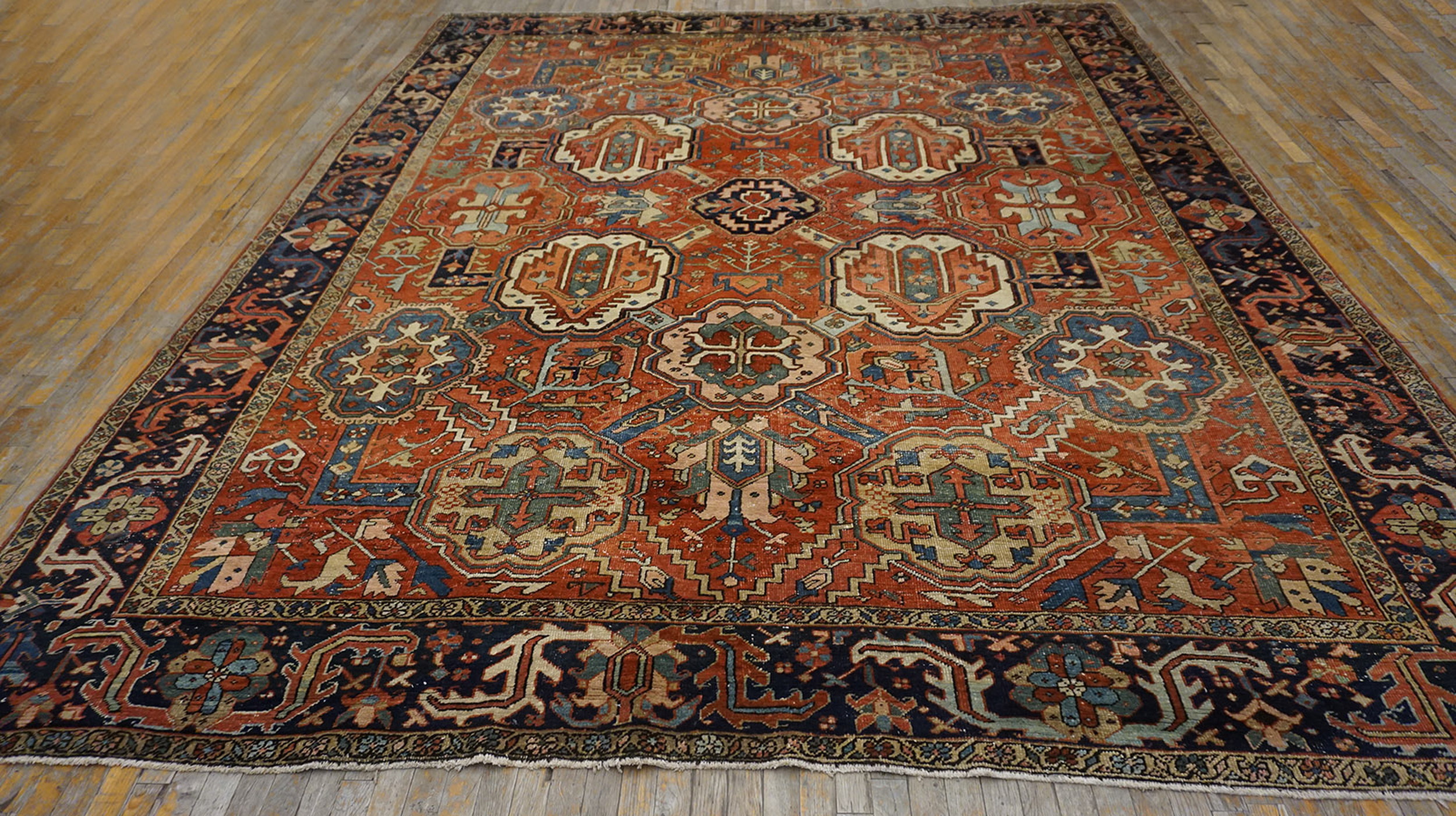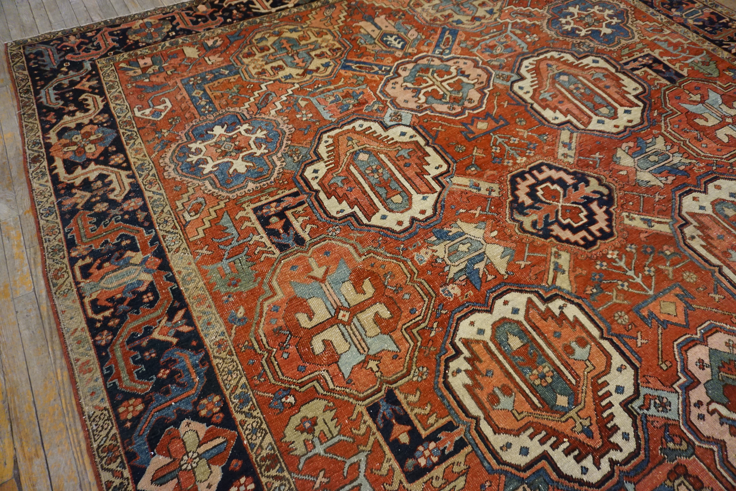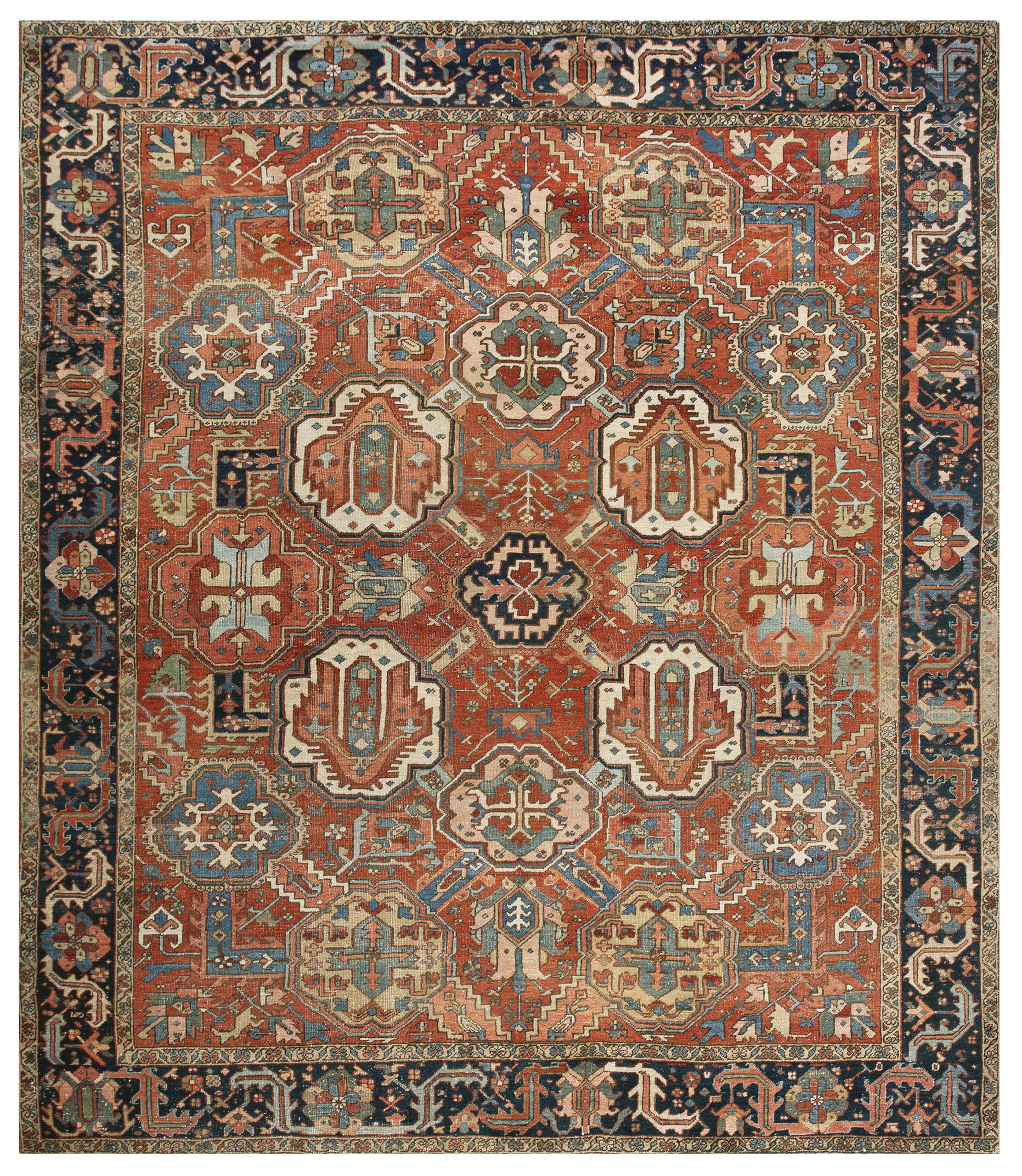 Antique Heriz Room Size Wool Coral Rug, Circa Date: 1880s. This magnificent example of classical Persian weaving is a testament to the enduring artistry found in antique rugs from the mountainous regions of Northwest Iran, characterized by their robust construction and striking geometry.