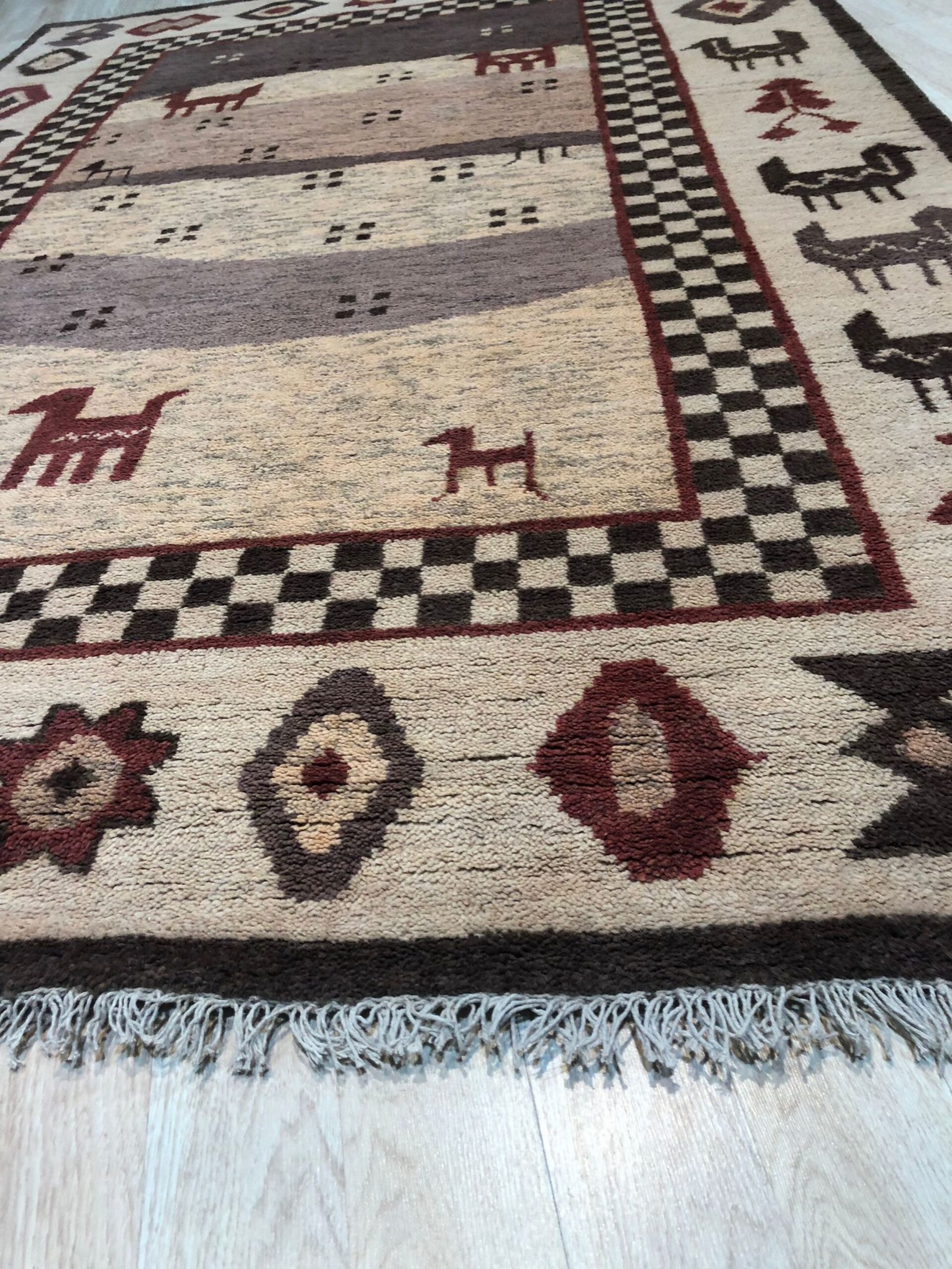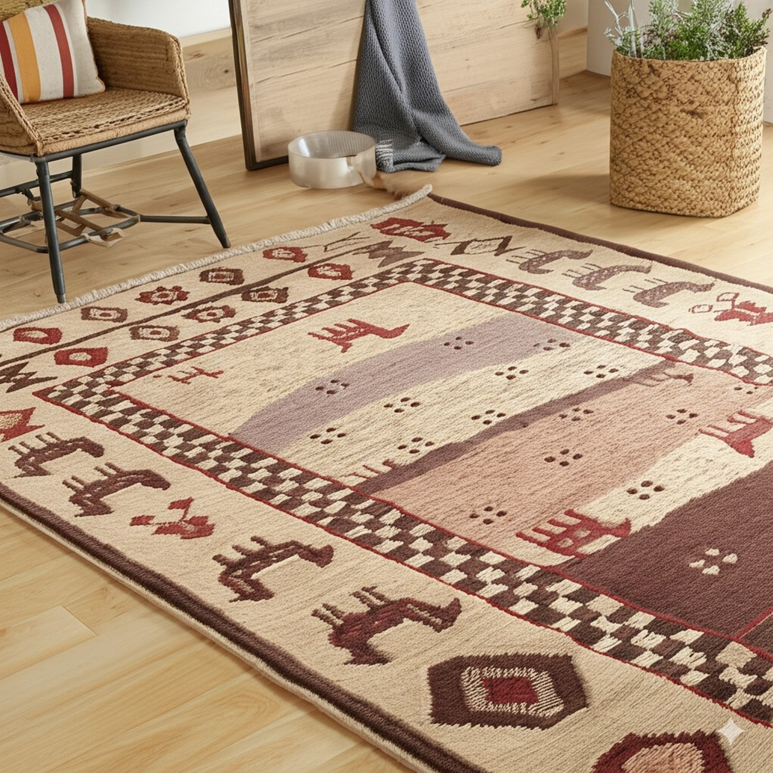 Sahara Beige Animal Motif Rug, Country of Origin: India. This exceptional piece offers a contemporary interpretation of nomadic design, utilizing a rich, earthy palette. The field is dominated by warm tones, ranging from deep chocolate to light sand, placing it perfectly within our collection of ivory beige cream white color rugs that complement modern minimalist interiors.