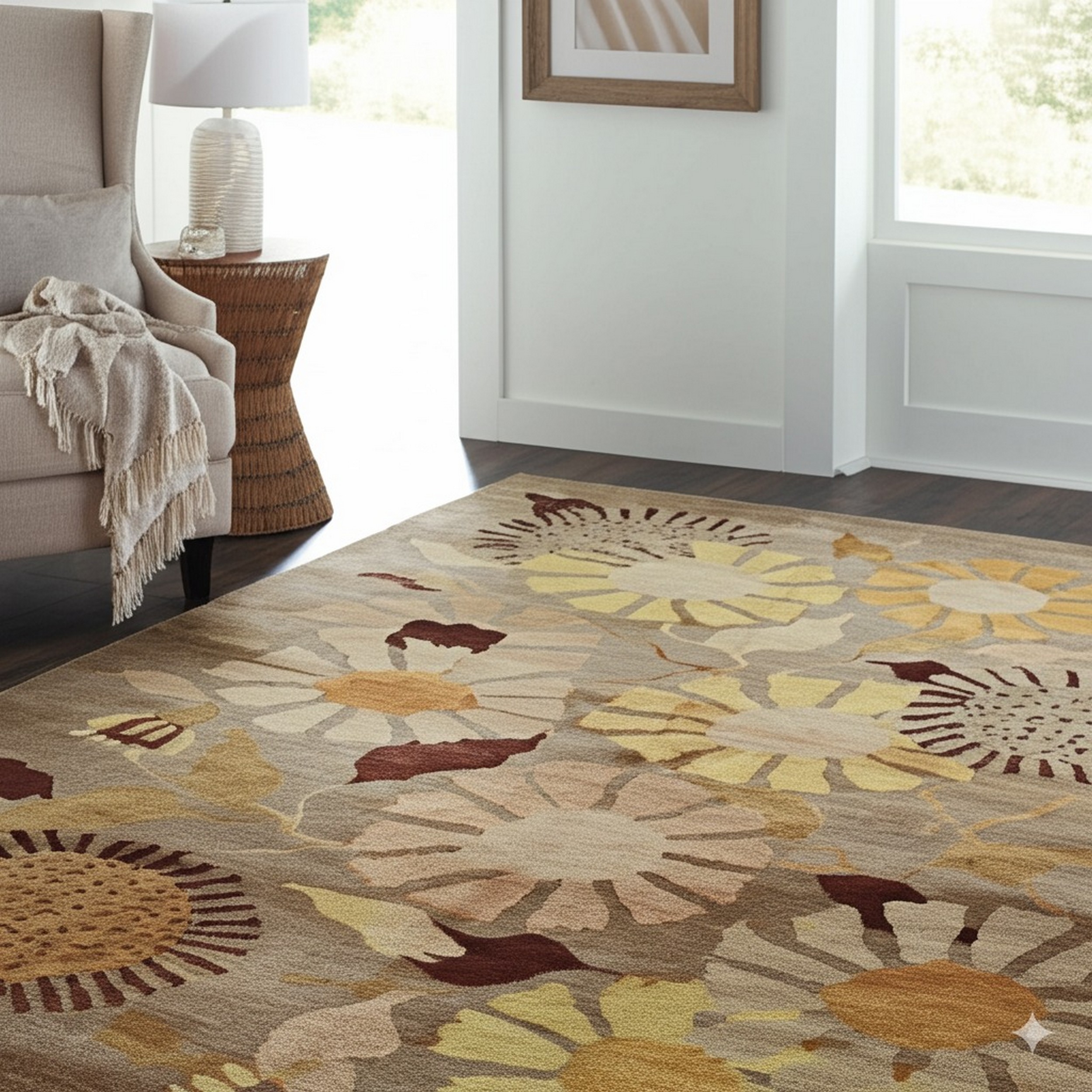 The palette is defined by rich, muted tones, anchored by a sophisticated field color that blends taupe and deep earth shades. The interplay of soft yellows and ochre petals against the grounding field creates textural depth, making it a superb addition to any space seeking brown earth tone color rugs that feel both warm and refined.