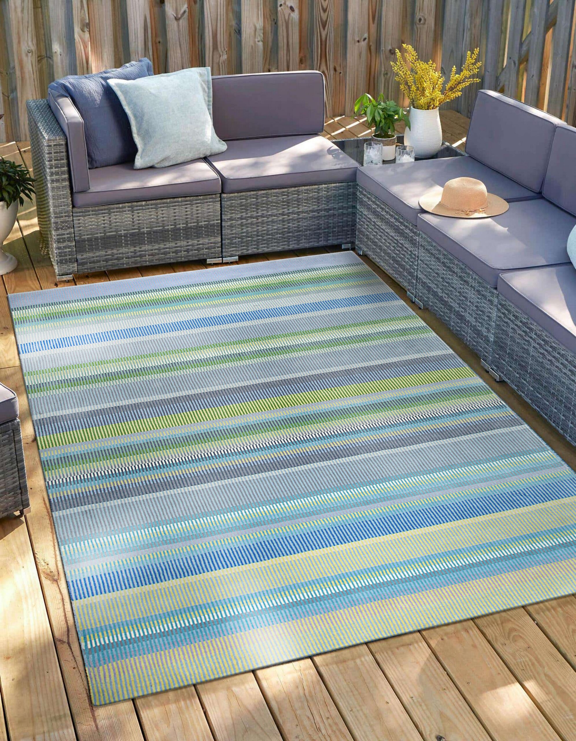 The design employs a complex interplay of horizontal bands, meticulously crafted from vertical dashes of color. While the title emphasizes the subtle green color rugs, the palette expands into soft sky blues, deep indigos, and neutral grays, creating a calming, atmospheric gradient that shifts subtly depending on the light and viewing angle.
