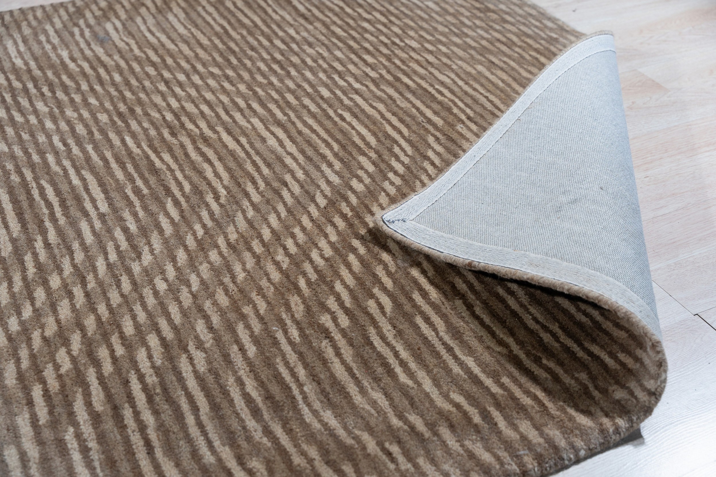 The design utilizes a sophisticated tone-on-tone palette, where lighter beige dashes intersect with deeper, grounding shades. This subtle interplay of texture and hue creates a dynamic, almost kinetic visual rhythm across the field. The overall effect is a rich, textural statement in brown earth tone color rugs, providing warmth without overwhelming the surrounding d?cor.