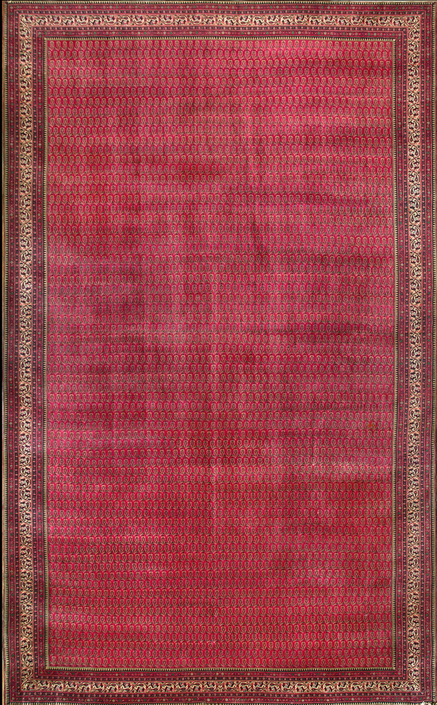 Antique Oversized Lahore Indian Knotted Rug, Country of Origin: India, Circa Date: 1920s. This exceptional piece exemplifies the refinement achieved by workshops producing high-quality Indian rugs during the British Raj period. The Lahore region was renowned for adapting classical Persian motifs into a distinctly opulent, yet disciplined, aesthetic.