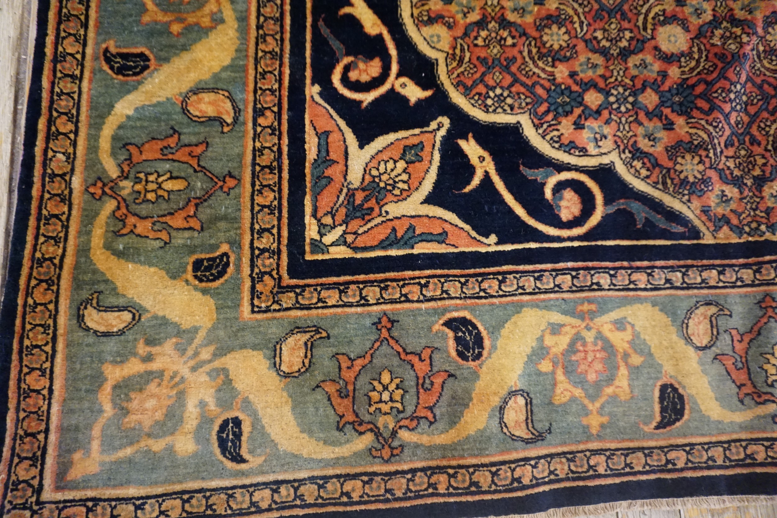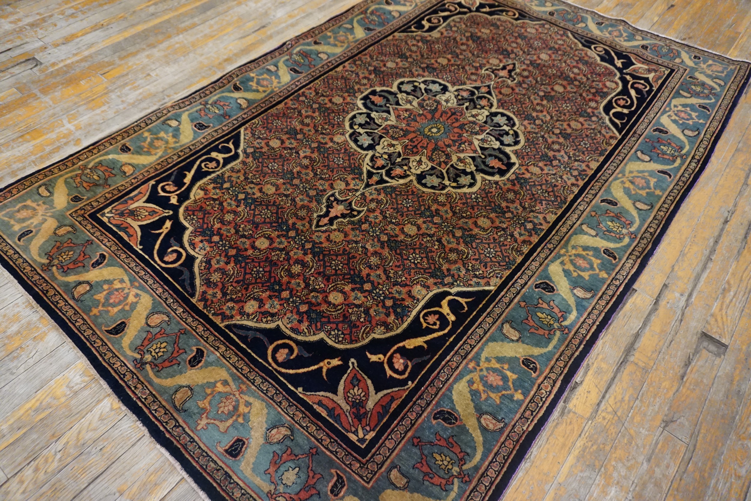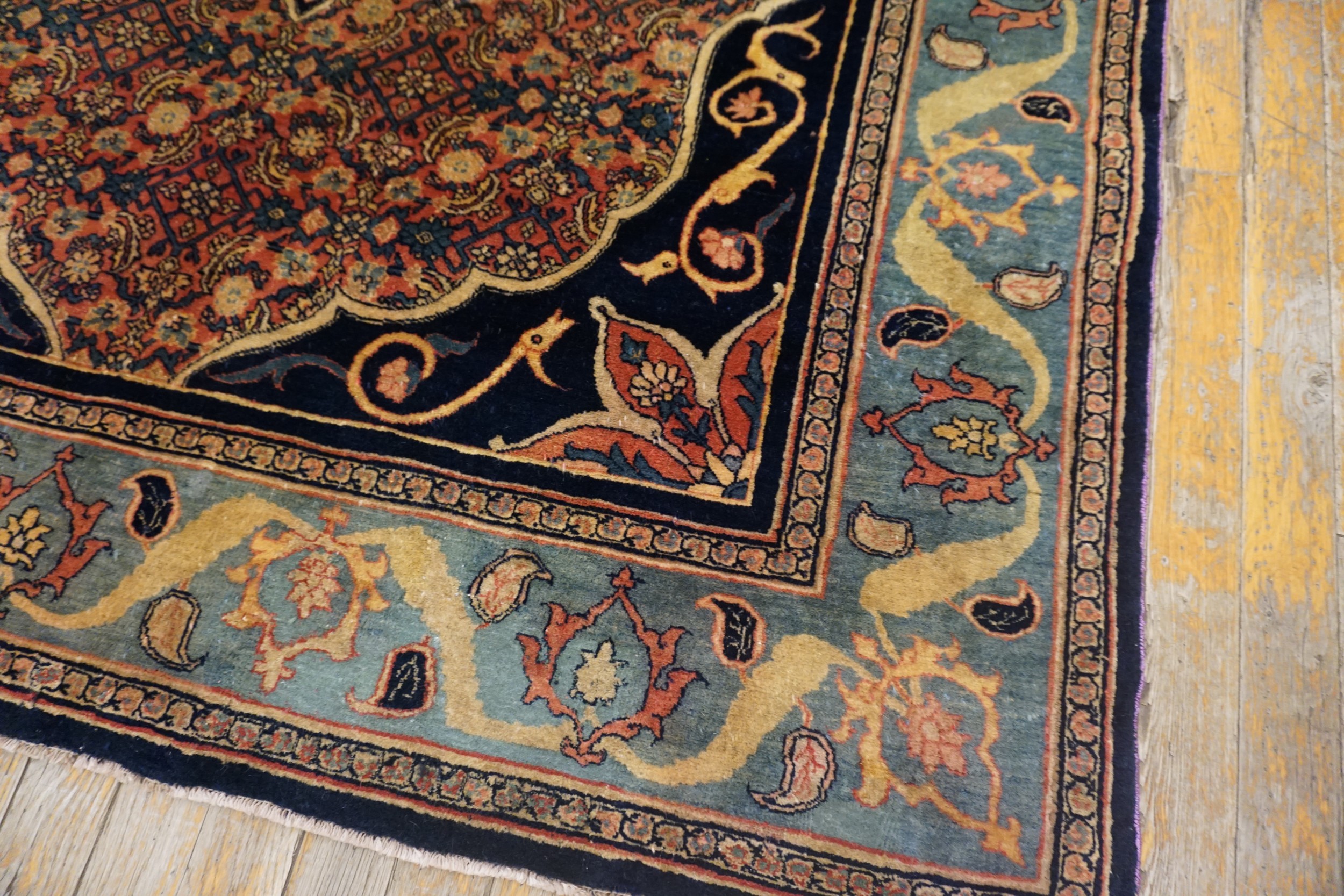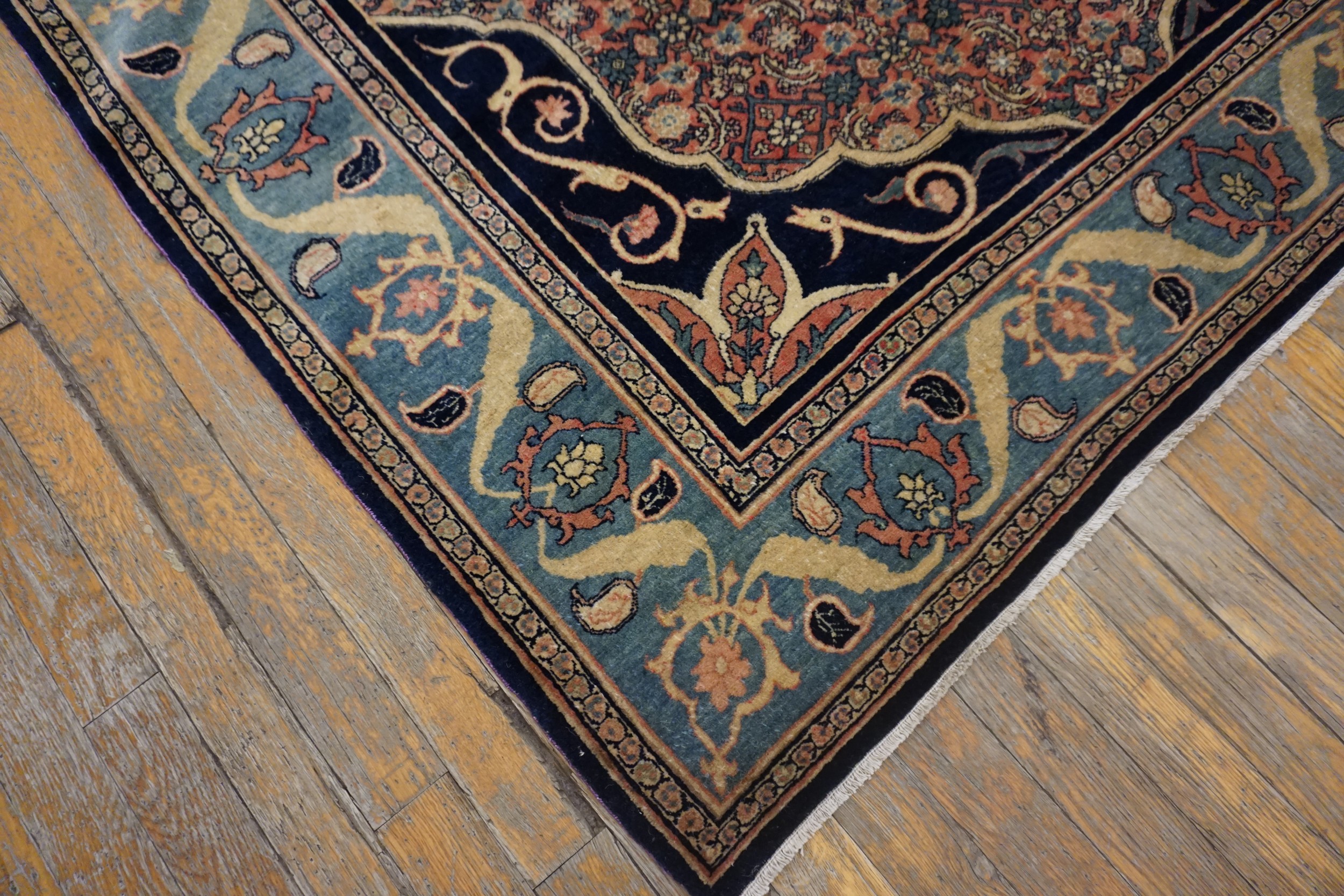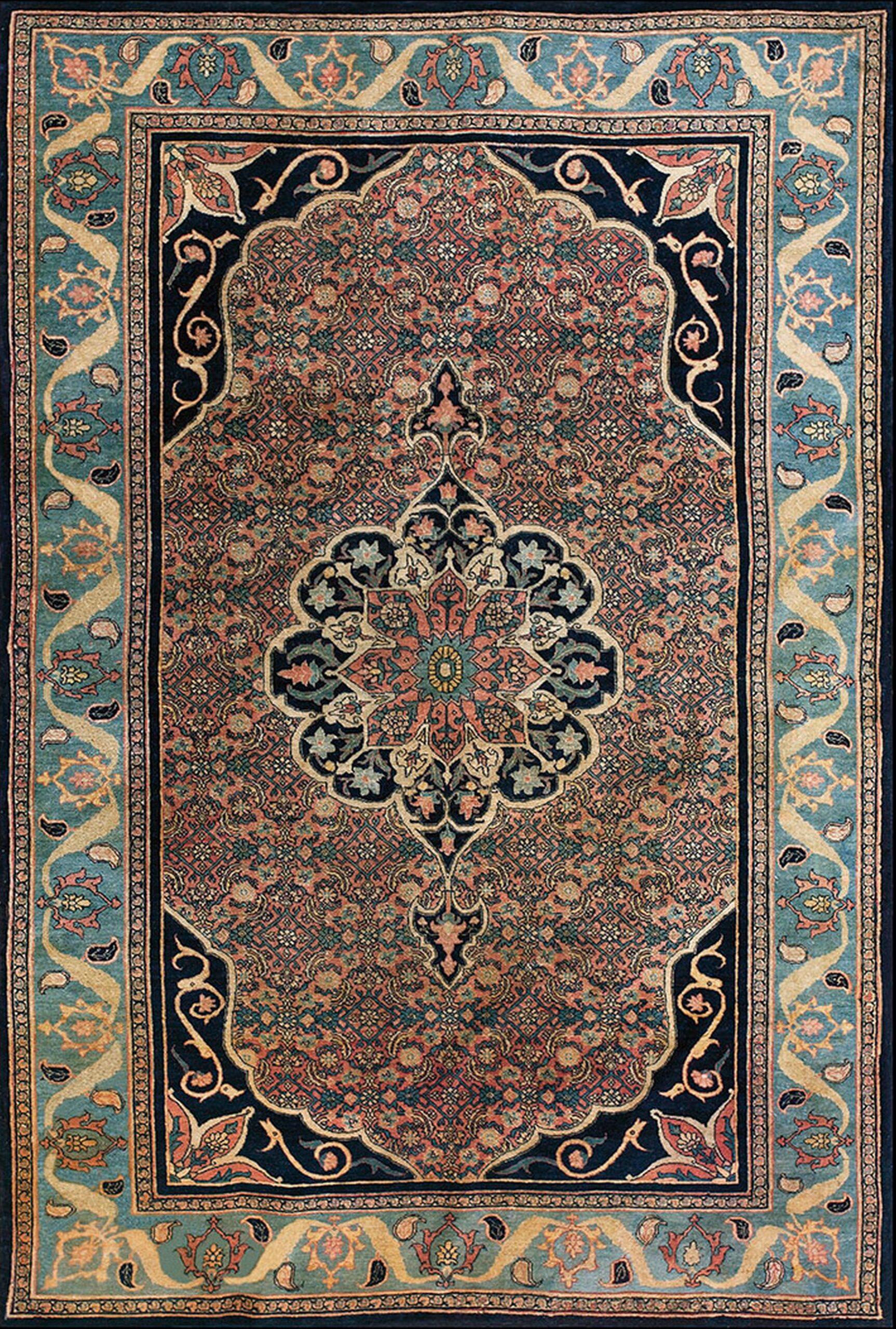 A sophisticated palette defines this piece, anchored by a powerful use of navy and deep indigo. The main border utilizes a striking contrast of salmon and teal, framed by the deep blue color rugs found in the guard borders, enhancing the visual impact of the overall composition.