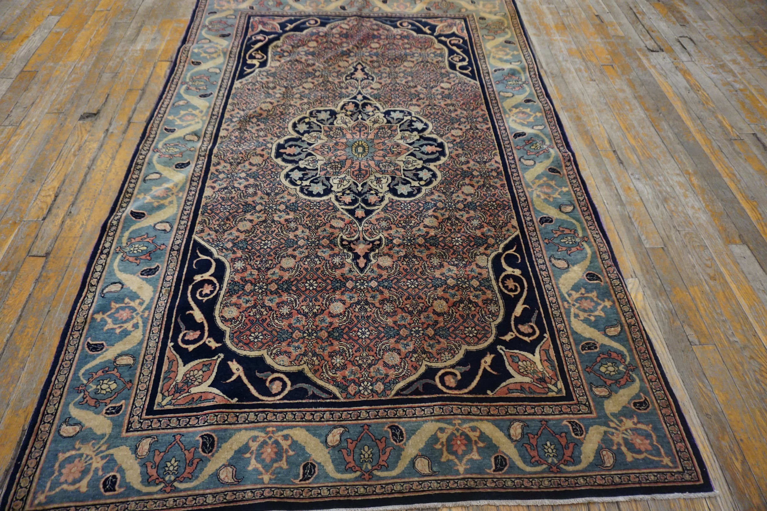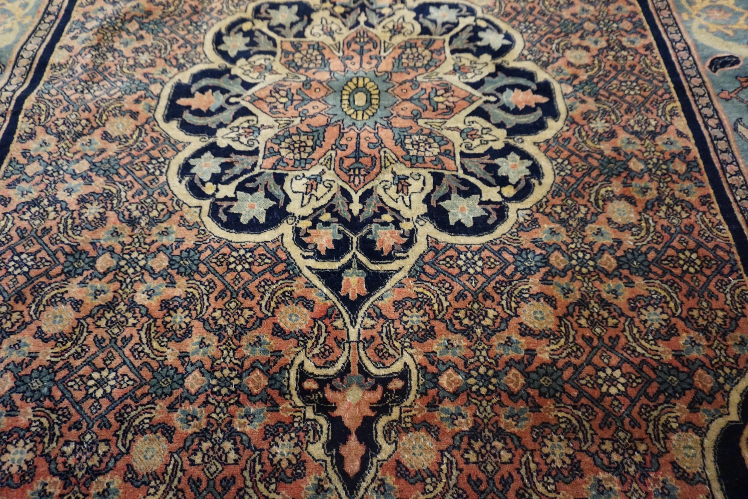 The field is dominated by a magnificent, stylized design, typical of central medallion rugs, intricately rendered in deep indigo and soft terracotta hues. The detailed lattice work surrounding the medallion creates a sense of depth and complexity, characteristic of the masterful craftsmanship employed by weavers from this area.