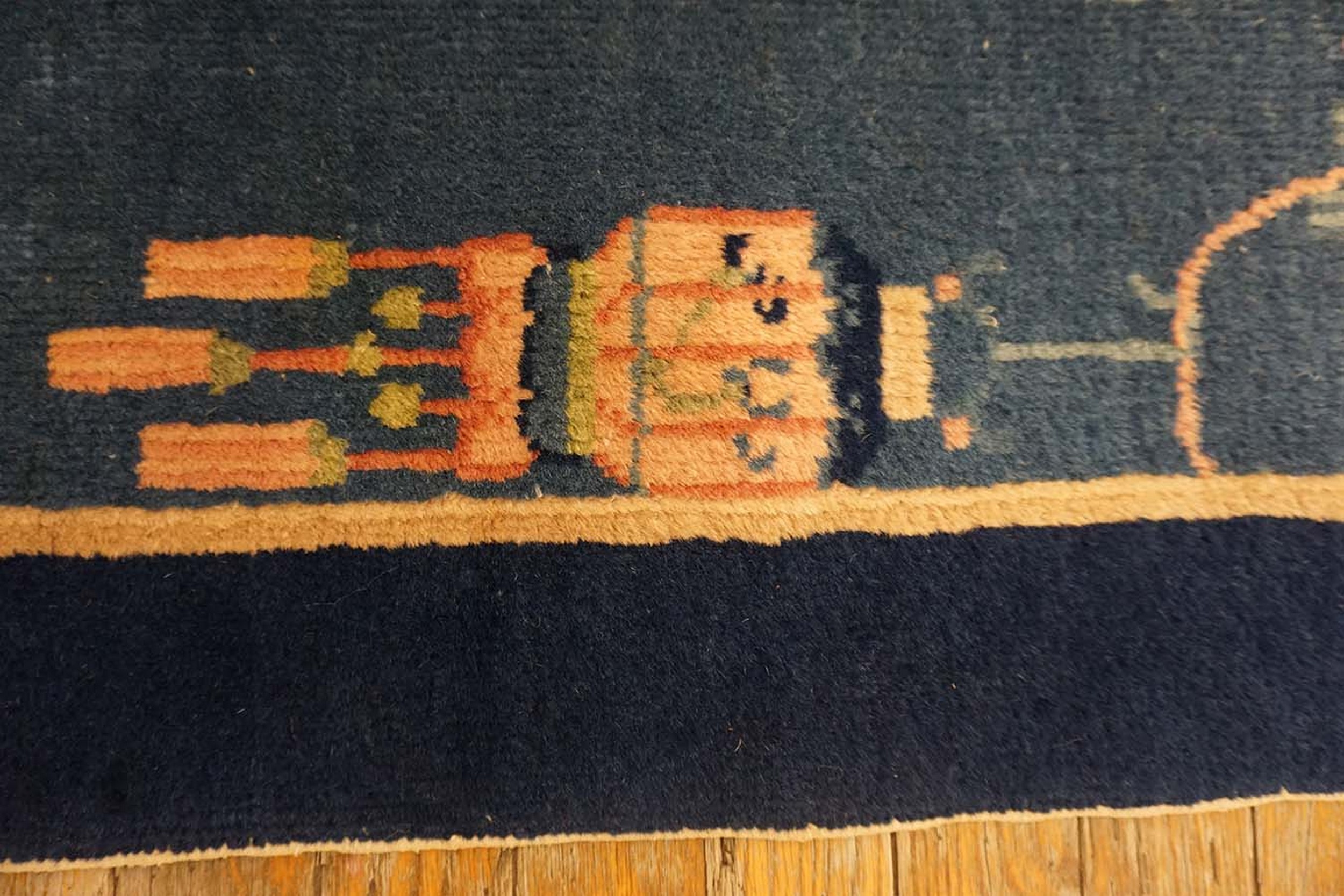 This early 20th-century calming antique Chinese rug is a jewel-like example of the “East-meets-West” aesthetic that revolutionized interior design during the 1920s and 30s. Produced in the renowned workshops of Tientsin or Beijing, this small-format specimen (likely a hearth or small scatter size rug) captures the high-glamour, modernist spirit of the Jazz Age in a compact and versatile size.