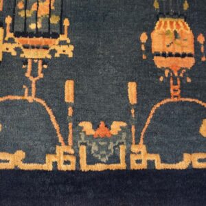 Technically, this antique Chinese Art Deco rug is prized for its exceptionally thick, plush pile and substantial, “heavy” handle. The wool used in this era was often a high-grade “Lustre Wool,” known for its long fibers and high natural lanolin content. This results in a surface that is not only incredibly durable but possesses a silky, reflective sheen. A hallmark of this tradition is the hand-carving or “incising” technique, where the weaver hand-clipped the wool around the decorative elements to create a sculptural, high-relief effect.