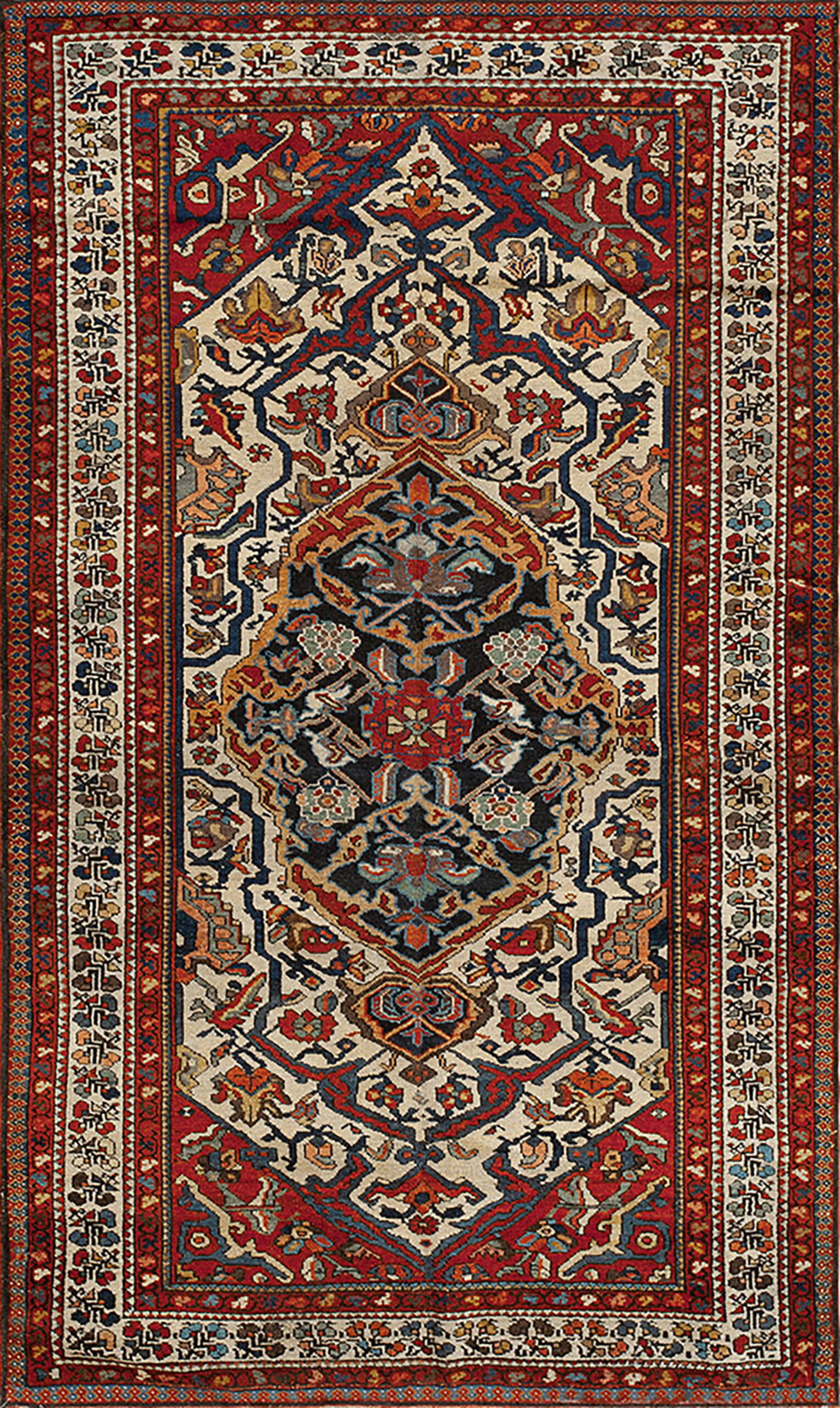 The field is dominated by a powerful, stylized central medallion rendered in deep indigo and madder red, surrounded by intricate tribal motifs. The contrast is heightened by the use of a warm, luminous ivory field in the spandrels and borders, which allows the saturated primary colors to truly resonate. This highly structured design is a hallmark of authentic bakhtiari rugs.
