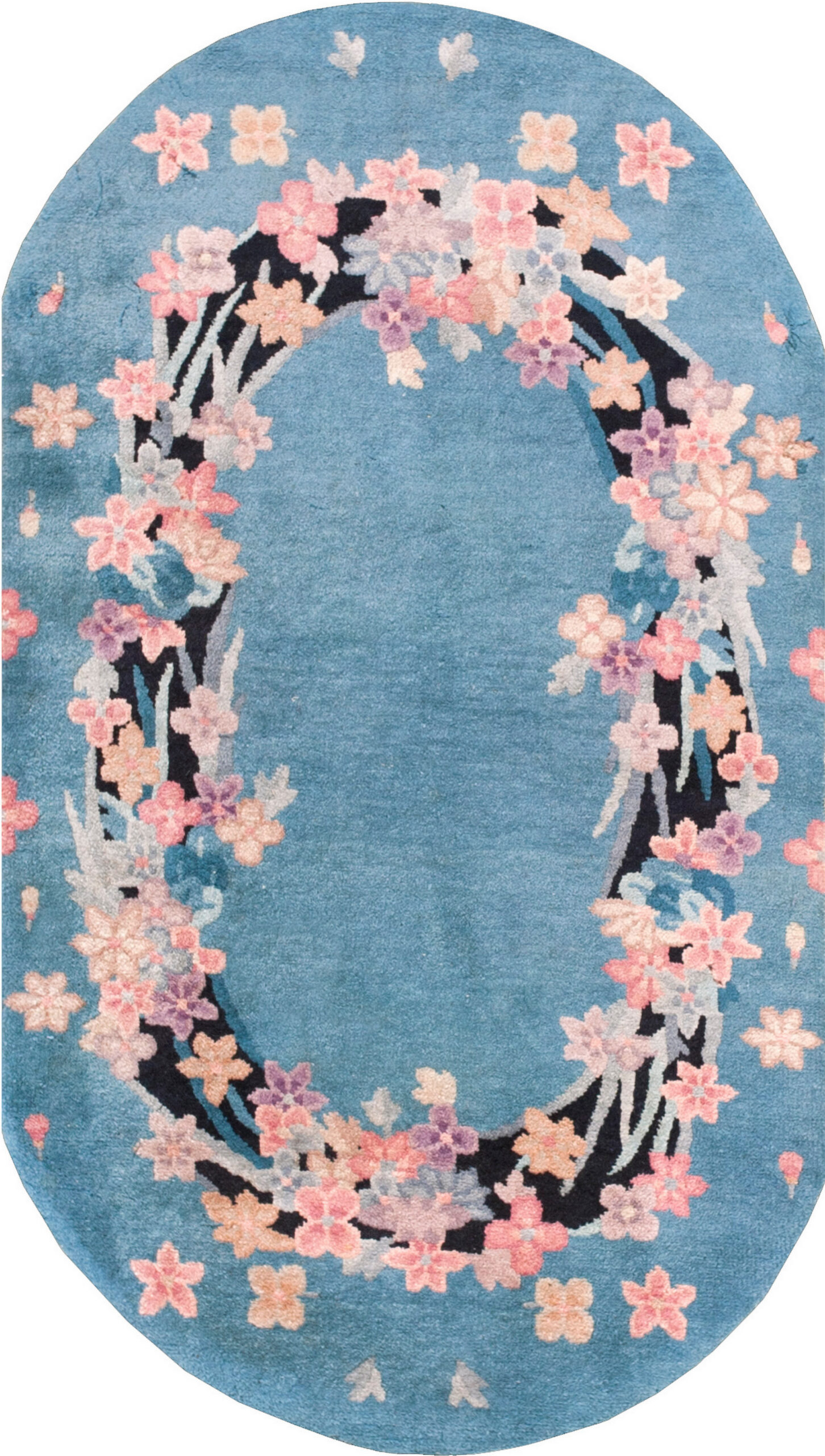 1920s Hand Knotted Pile Oval Antique Blue Wool Floral Medallion Rug, Circa Date: 1920s. This exquisite piece captures the bold, stylized elegance characteristic of the Art Deco period. Its lush wool pile and distinctive color palette make it a standout among antique rugs, offering both historical provenance and enduring aesthetic appeal.