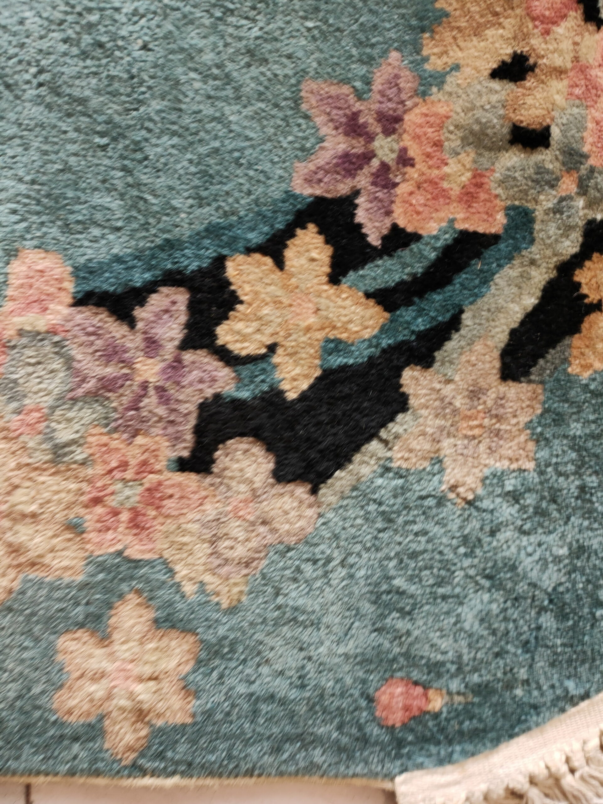 The field is dominated by a rich, saturated teal, placing it firmly within the desirable category of blue color rugs. This vibrant ground provides a stunning contrast to the deep black oval that frames the medallion area. The high-contrast hues and the deliberate use of negative space are hallmarks of early 20th-century design innovation, ensuring this rug serves as a powerful focal point.