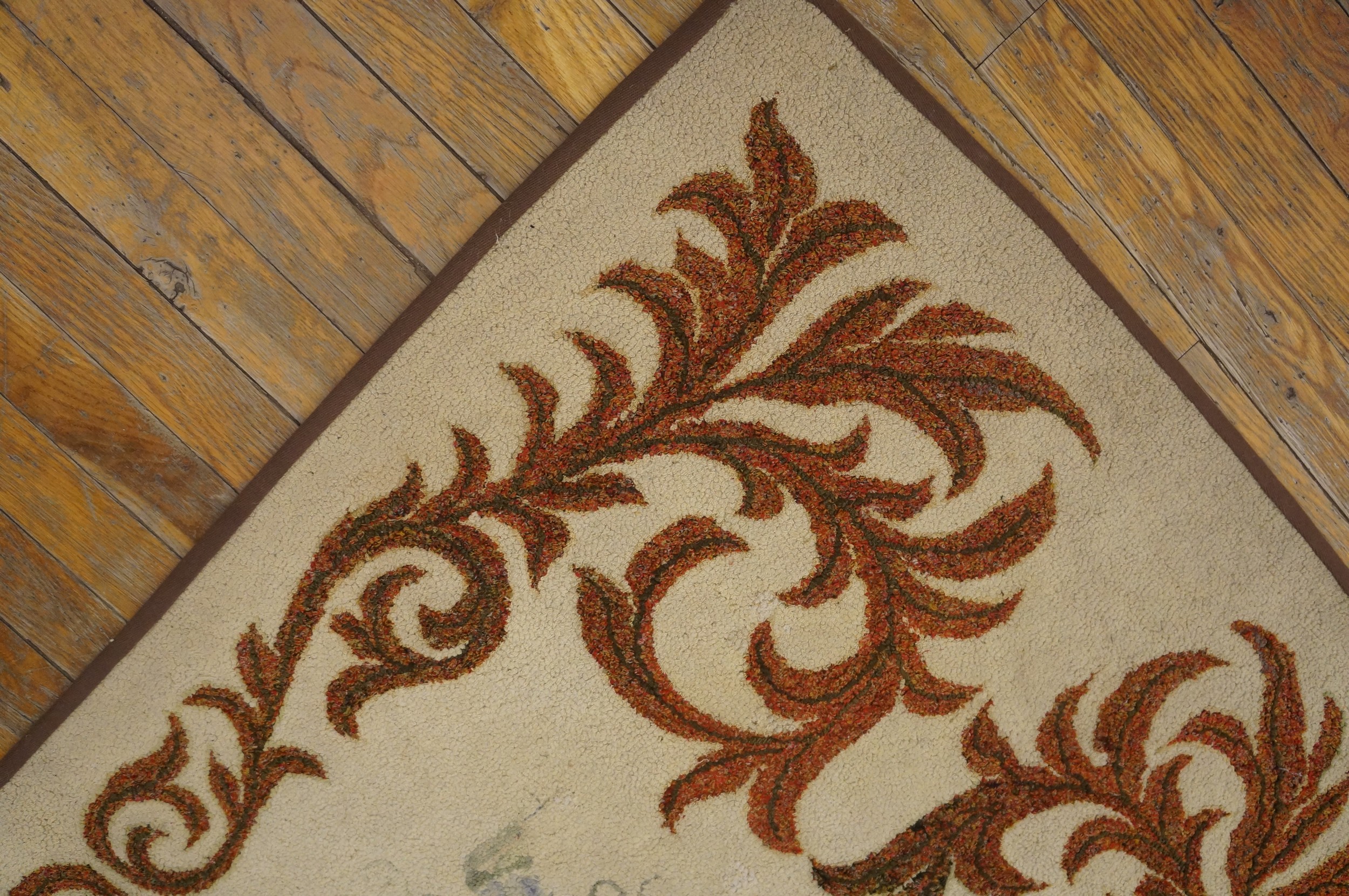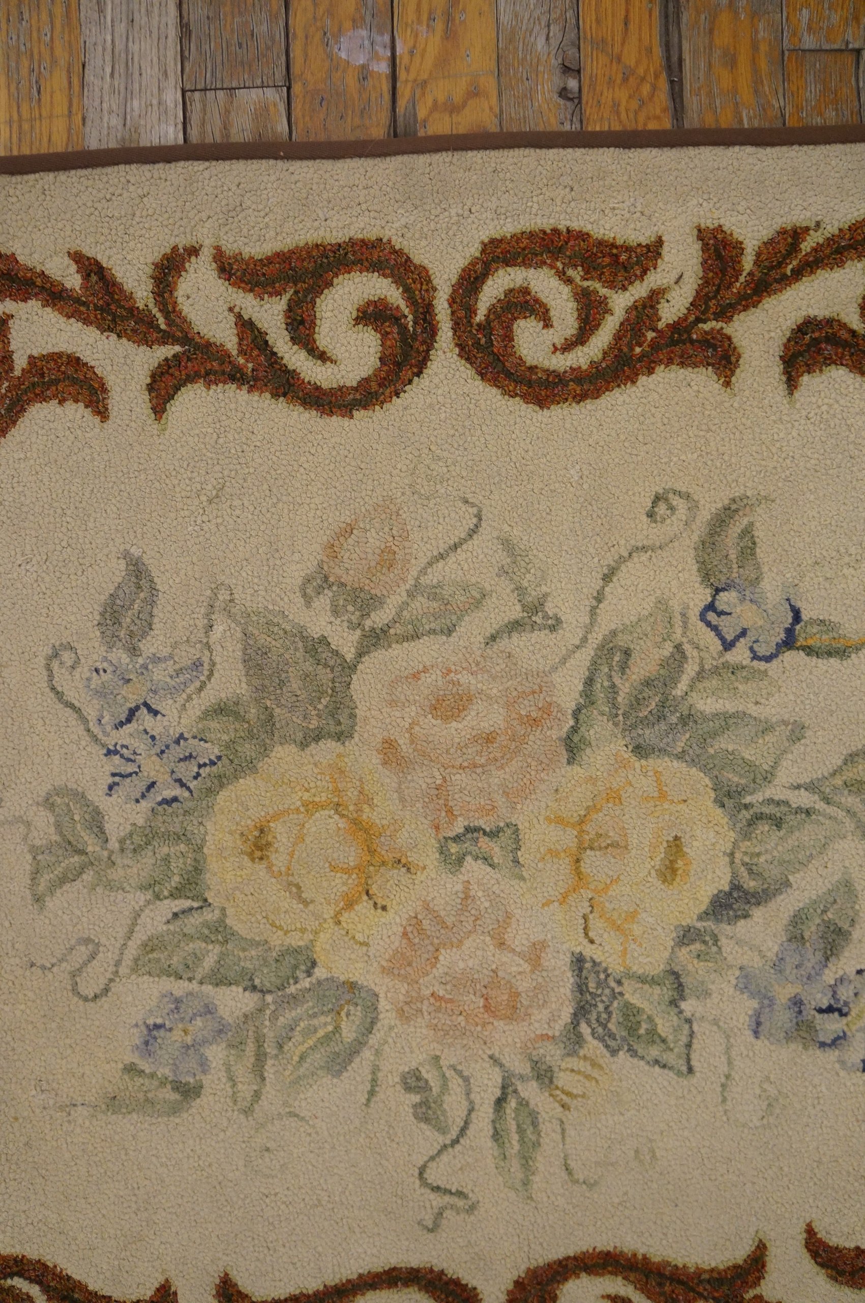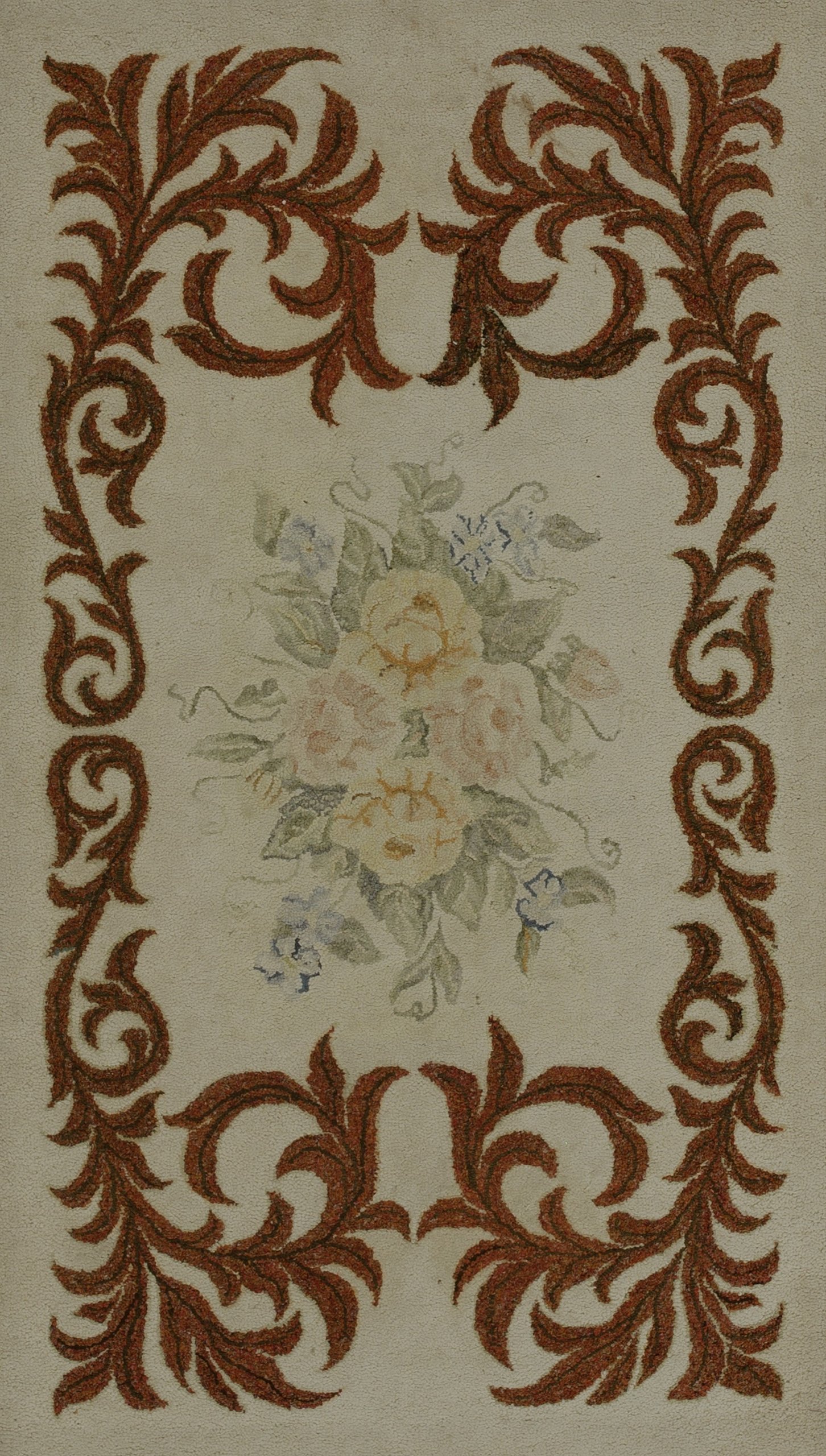 The borders typically serve as a soft architectural frame, often echoing the dominant colors of the blossoms to “lock in” the airy elegance of the central field. To possess this antique ivory American hooked rug is to own a monument to cultural synthesis. It bridges the gap between humble colonial resourcefulness and high-style European design, transforming a small space into a sanctuary of historical gravity and sun-drenched, floral grace.