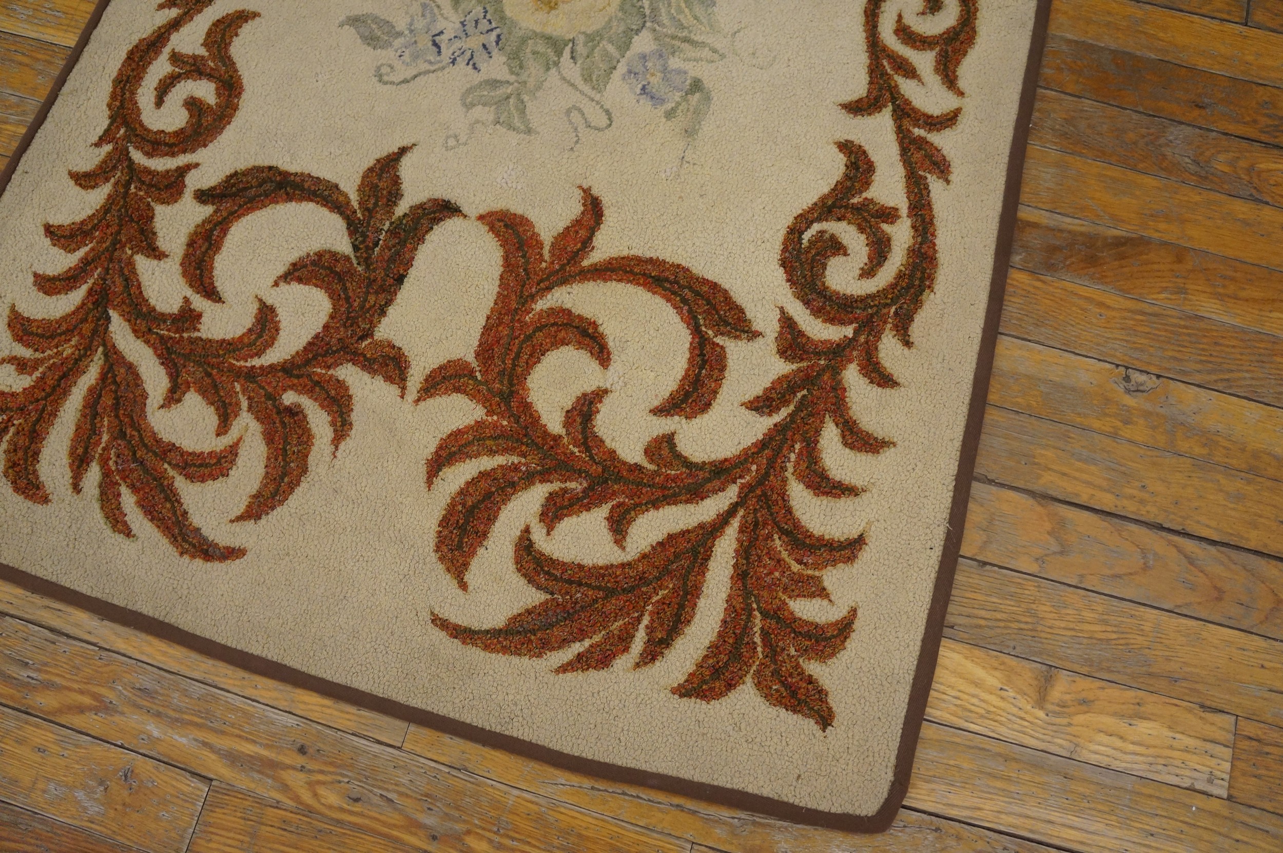 This late 19th-century American hooked rug is a sophisticated example of “transatlantic” folk art, where the rugged, domestic craftsmanship of North America met the refined aesthetic sensibilities of the Old World. While many antique American hooked rugs of the era were primitive or geometric, this rug is defined by its European design influence, drawing inspiration from the prestigious Savonnerie rugs or Aubusson floral carpets of France.