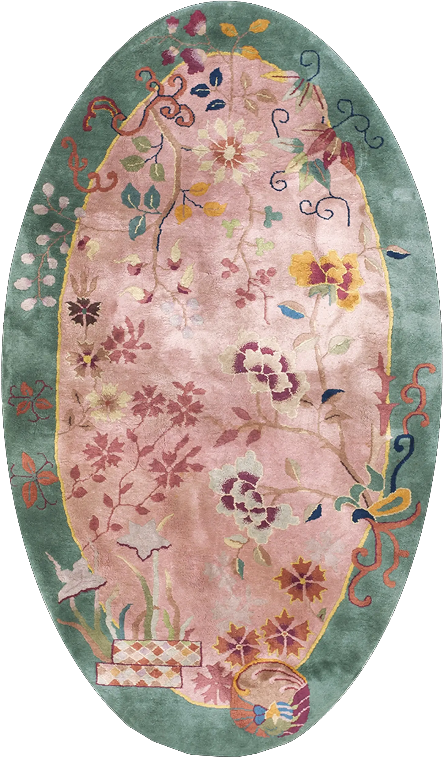 A delicate, meandering vine populated by stylized blossoms and leaves covers the central field. This sophisticated use of natural imagery places it firmly within the category of floral rugs, yet the open composition and saturated color blocking elevate it beyond conventional design. This antique oval rug remains a testament to early 20th-century Chinese textile artistry.