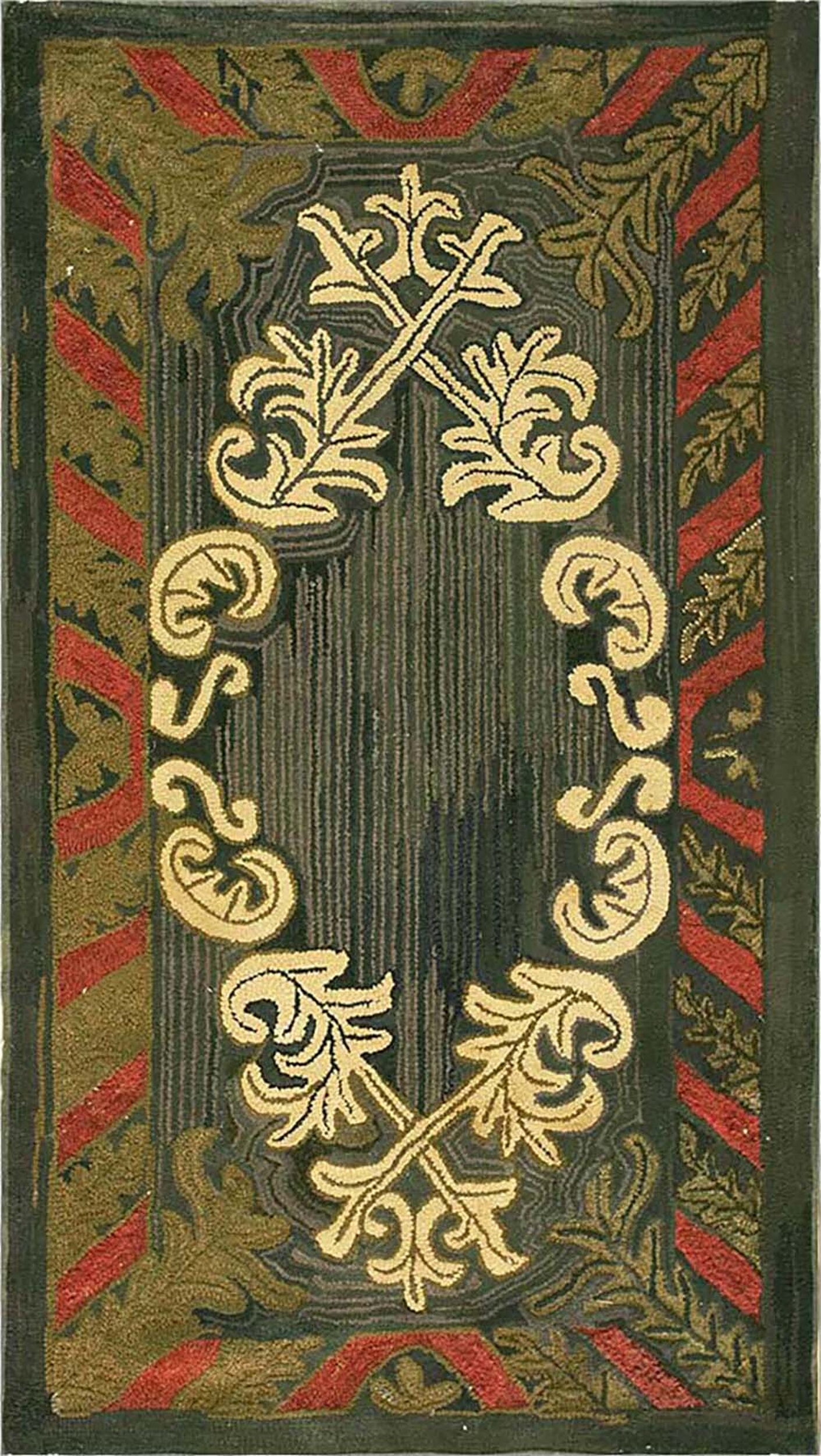 The striking border, defined by alternating bands of rust red and olive leaves, frames the central design with architectural precision, lending the piece a strong visual anchor. This authentic 1930s textile is a superb example of early 20th-century antique rugs, offering both historical resonance and enduring decorative appeal for the discerning collector.