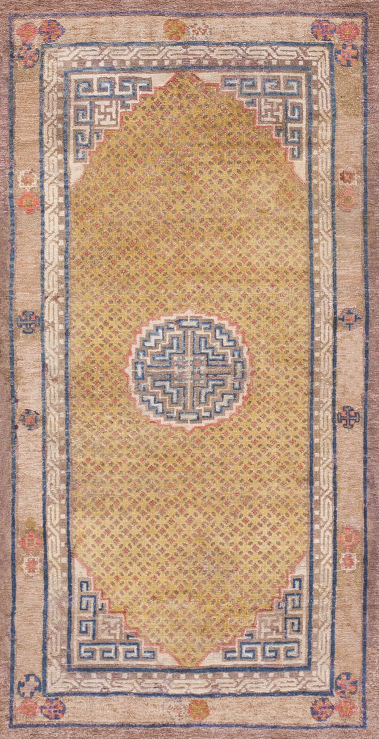 Antique Chinese – Ningxia Small Scatter Size Wool Rug, Country of Origin: China, Circa Date: 1880s. This exceptional piece is a fine example of late Qing Dynasty weaving, demonstrating the restrained elegance characteristic of the period. We are pleased to offer this rare example among our collection of antique rugs.