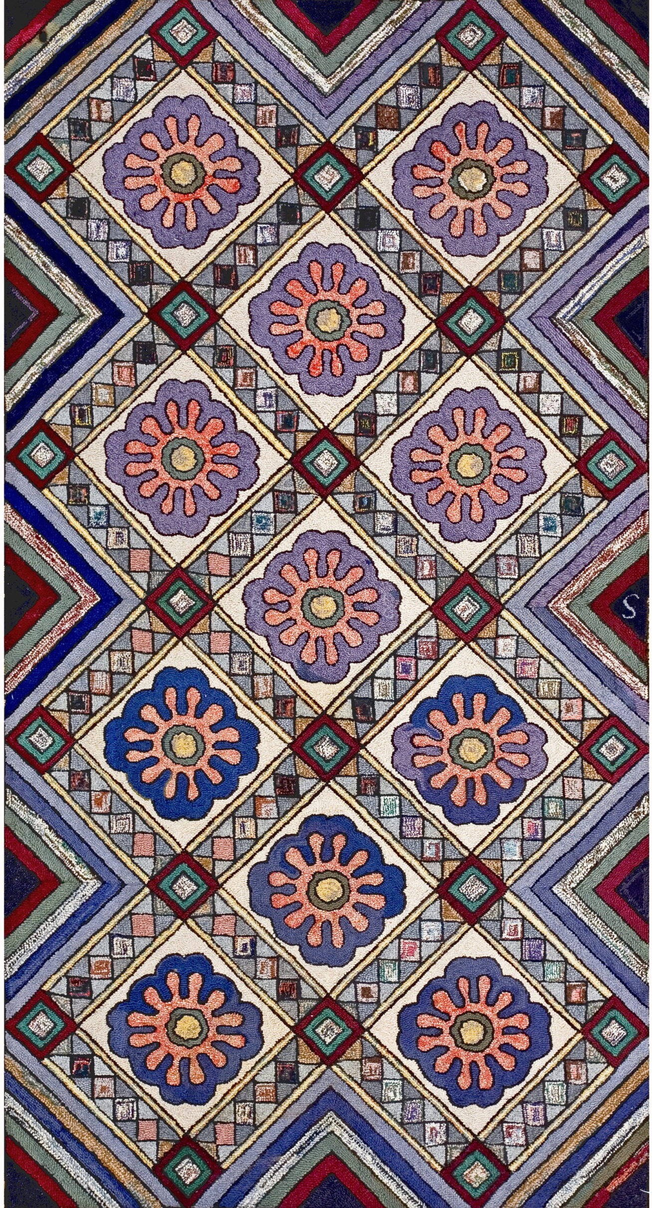 Structurally, the design employs a bold, repeating geometric lattice that frames stylized floral medallions. The consistent application of the pattern across the field creates a balanced and dynamic allover pattern, ensuring visual interest from every angle and reflecting the robust design sensibilities of the period.