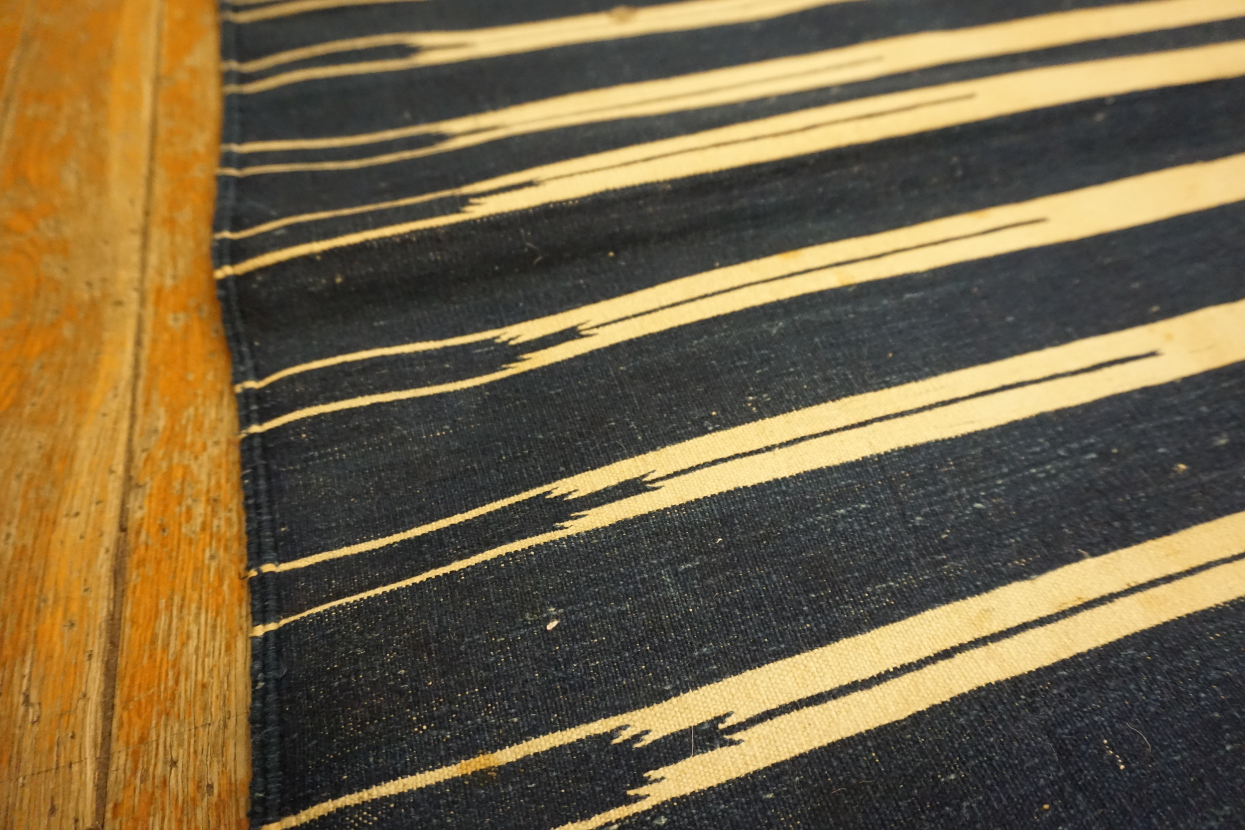 The saturated indigo field provides a rich foundation for the horizontal bands of ivory. The skillful use of this deep blue color rugs creates a dynamic visual rhythm, where the lines occasionally blur or feather at the edges, suggesting a resistance-dyeing influence common in early 20th-century artisanal textiles.