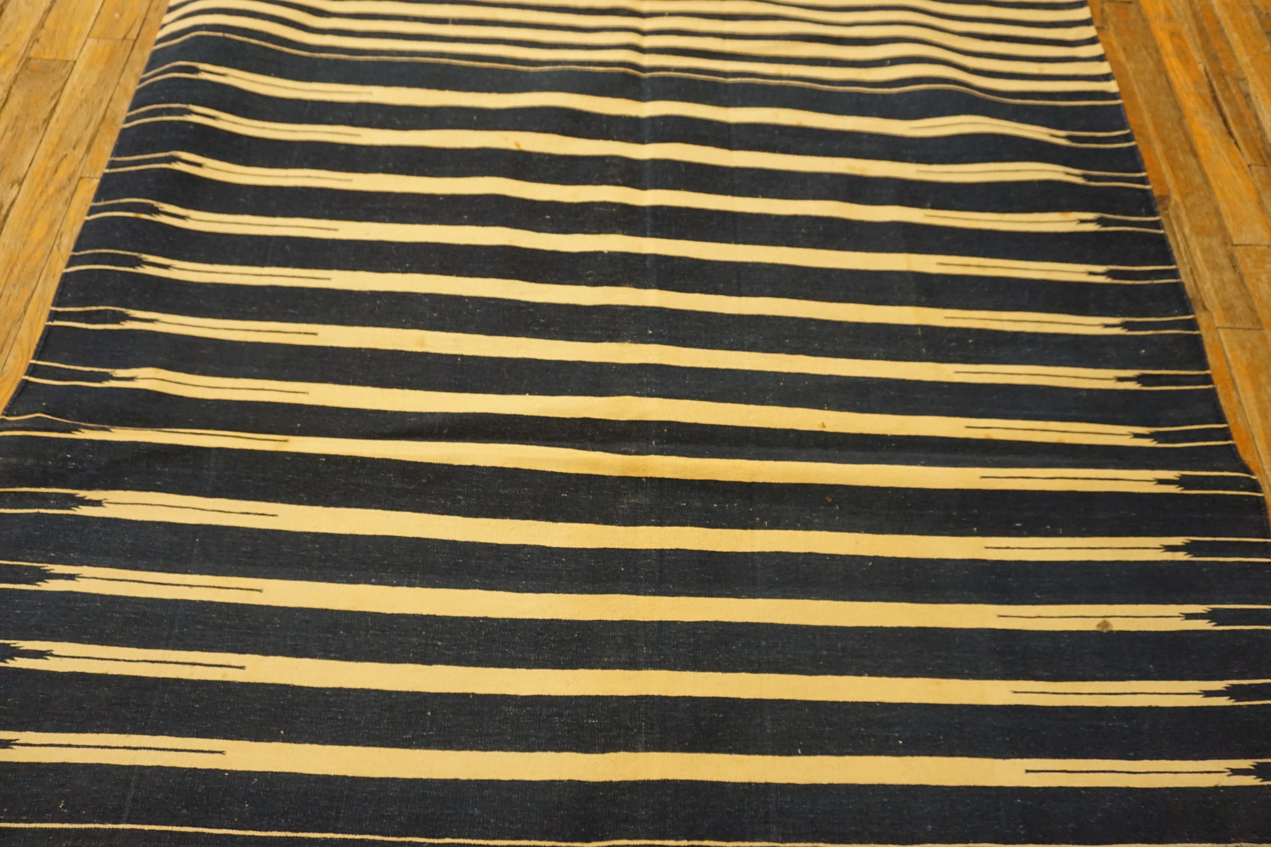 Antique Dhurrie Small Scatter Size Cotton Blue Rug, Circa Date: 1920s. This striking textile is a superb example of small scatter size rugs, defined by its bold, graphic aesthetic. Woven entirely of cotton, it presents a compelling contrast between deep indigo and natural ivory, reflecting the early 20th century’s appreciation for clean, modern lines.