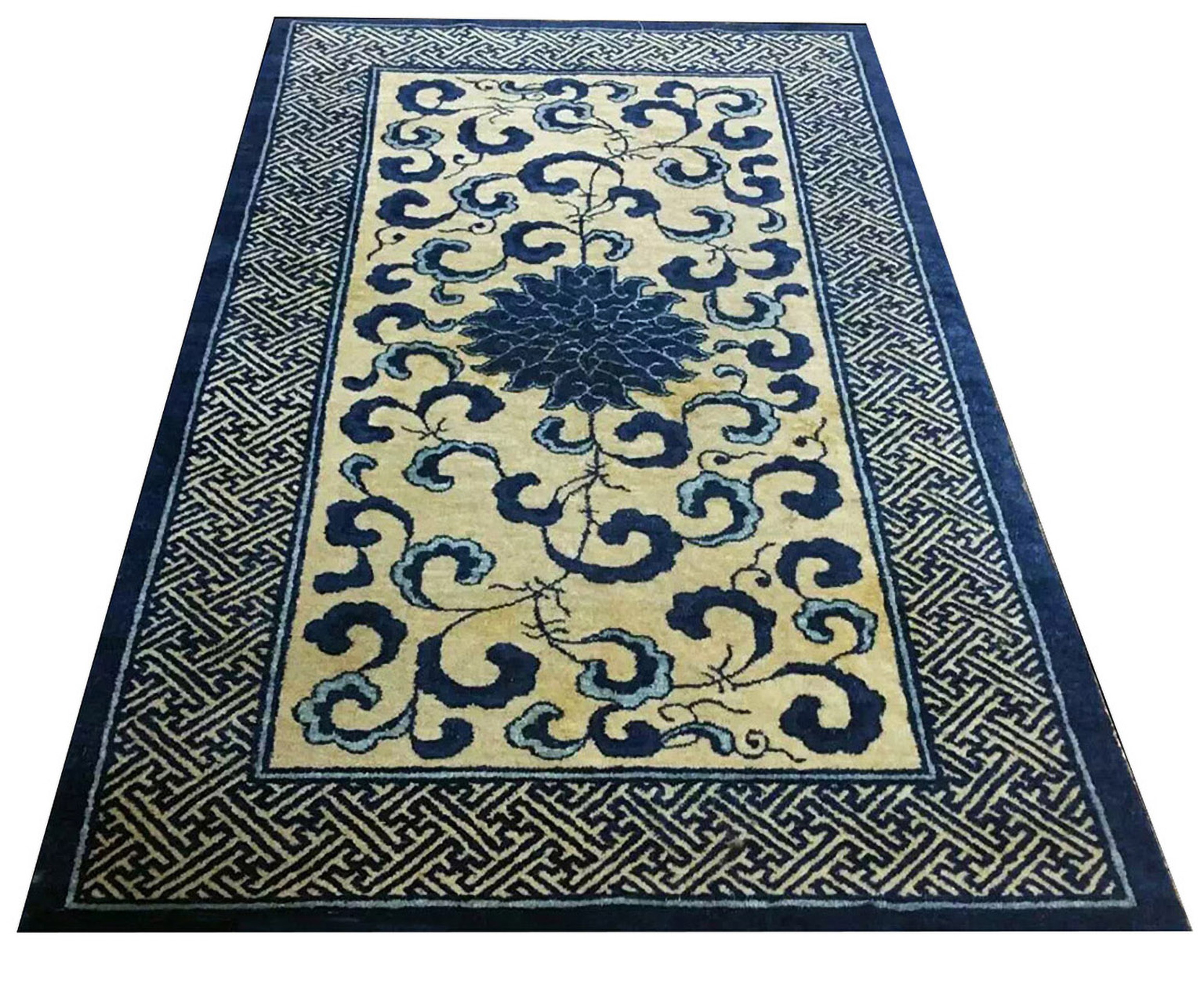 Antique Chinese – Peking Ivory 1930s Rug, Circa Date: 1930s. This exquisite piece of antique rugs represents the restrained elegance typical of early 20th-century Chinese weaving, characterized by its striking contrast between the deep indigo blue and the luminous ground.