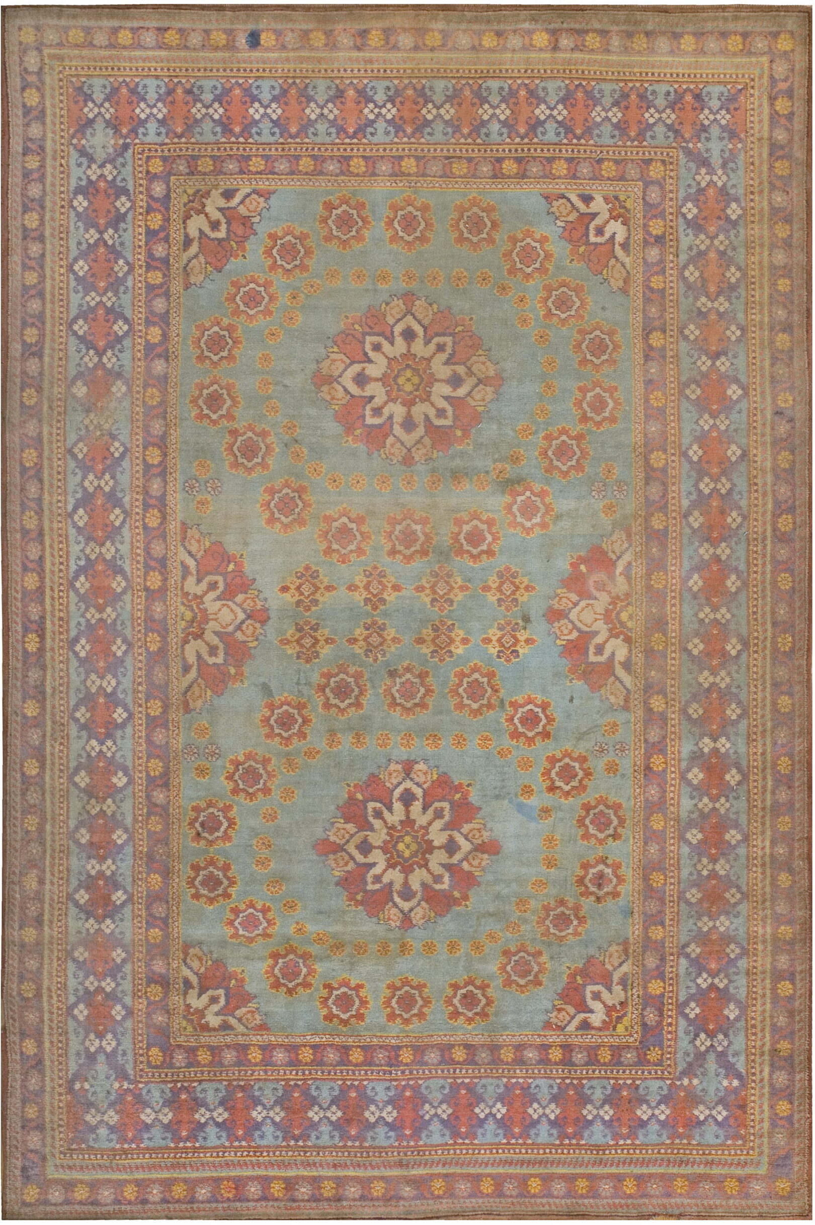 The central medallion design is set against a field of oxidized, pale teal, a color that has mellowed beautifully over the last century. This cool ground provides a striking foundation for the warm, madder-dyed secondary motifs that radiate outward. The subtle variations in hue emphasize the vintage character often sought in blue color rugs, providing depth without overwhelming the space.